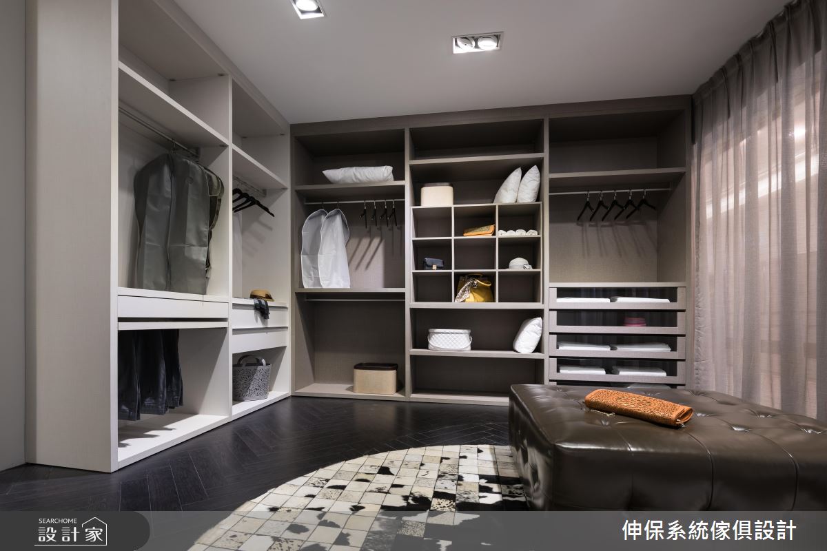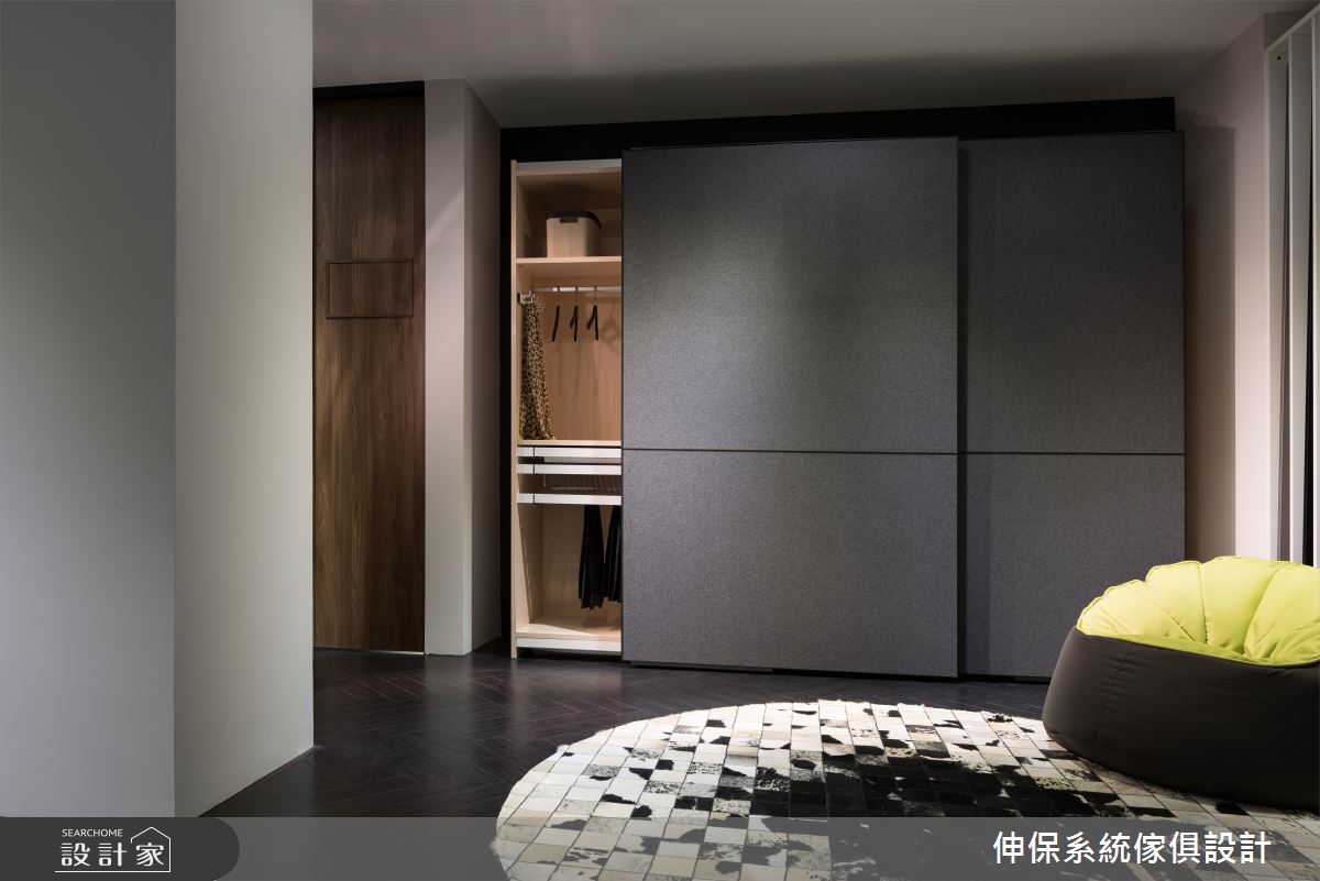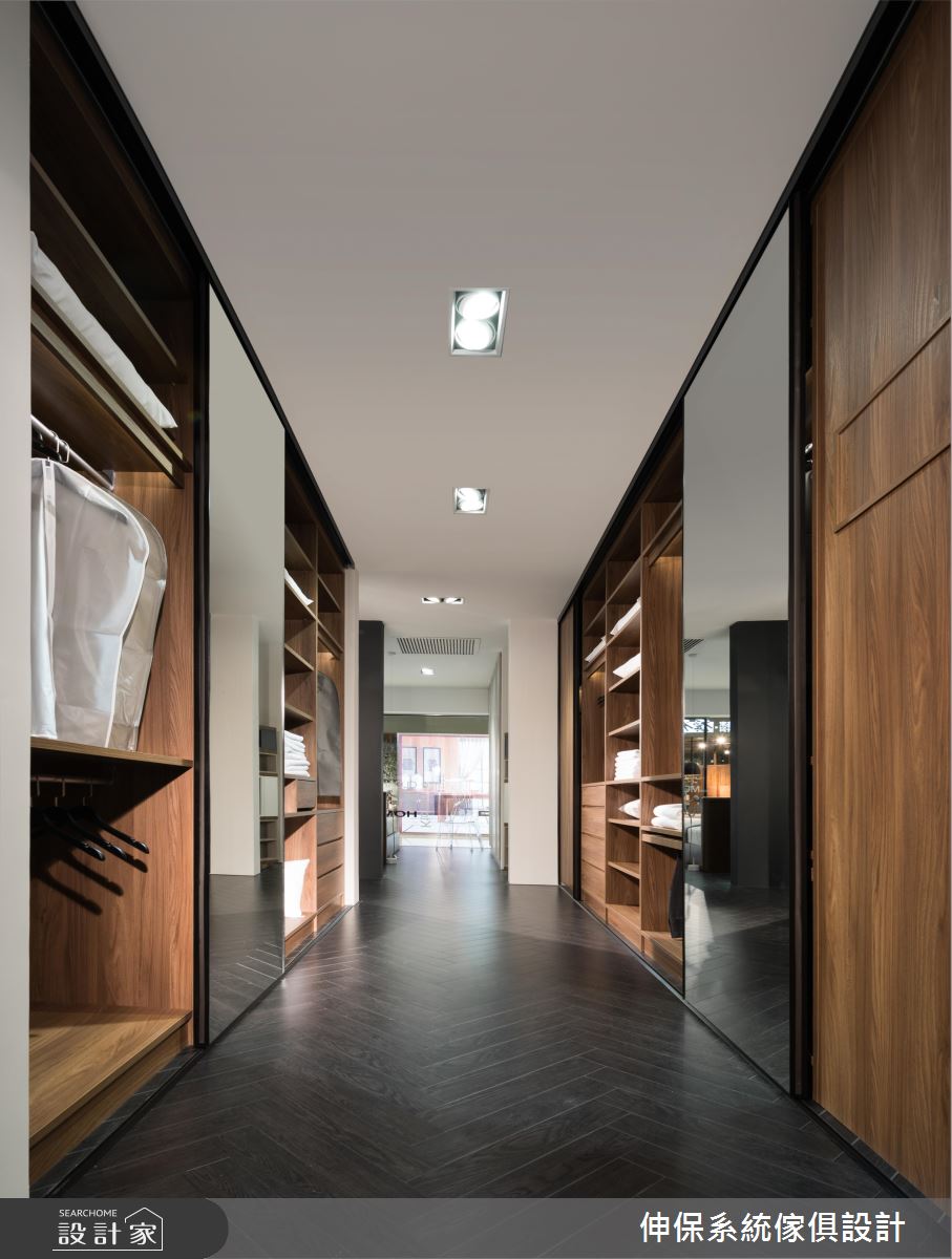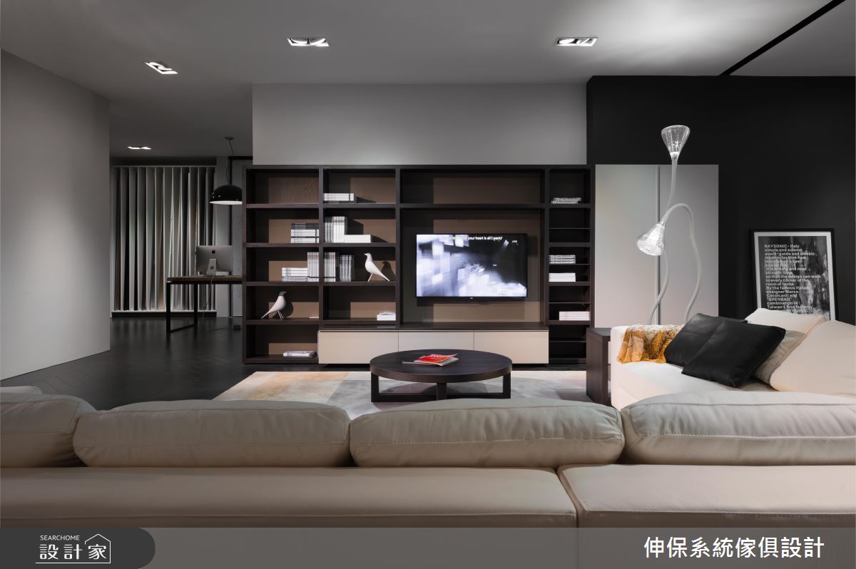 空間藉由材質與線條,創造井然有序的沉穩視野,於客廳電視櫃採以深色木質調作為背景,融入大量的收納空間,並組構出層次分明的排列組合,搭配著淺色沙發調和,讓廳區的明暗濃淡充滿平衡感,詮釋簡約從容的生活態度;尤其,衣櫃系列更是店內展示重點,透過不同的組合方式,提供衣物、配件適合擺放的位置,並藉由木紋質地包覆量體,傳遞安定舒適感,而無論是開放櫃體或俐落的櫃門設計,皆彰顯出輕質無壓的表情,在挹注實用機能的同時,亦同步滿足生活美學的呈現!