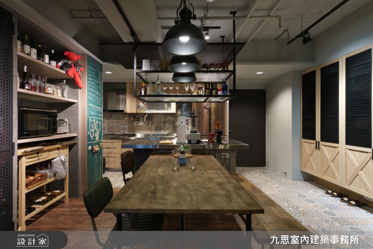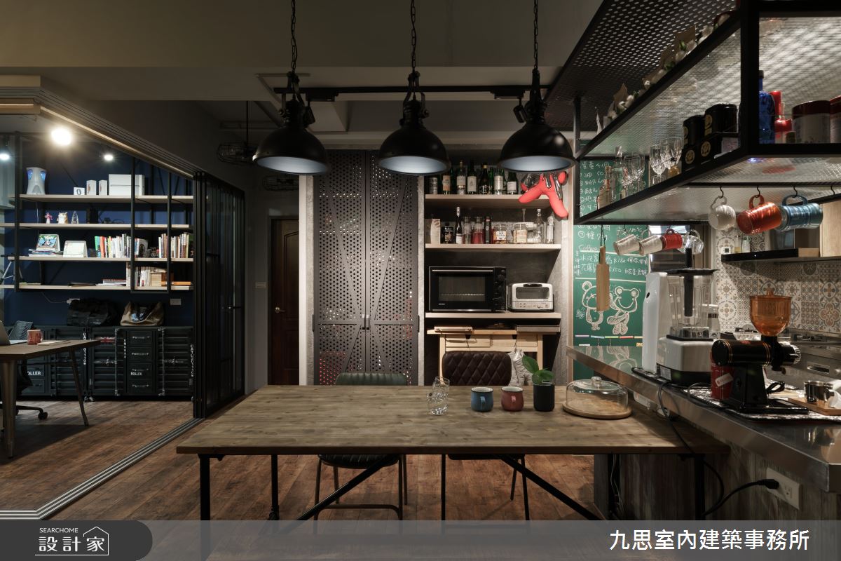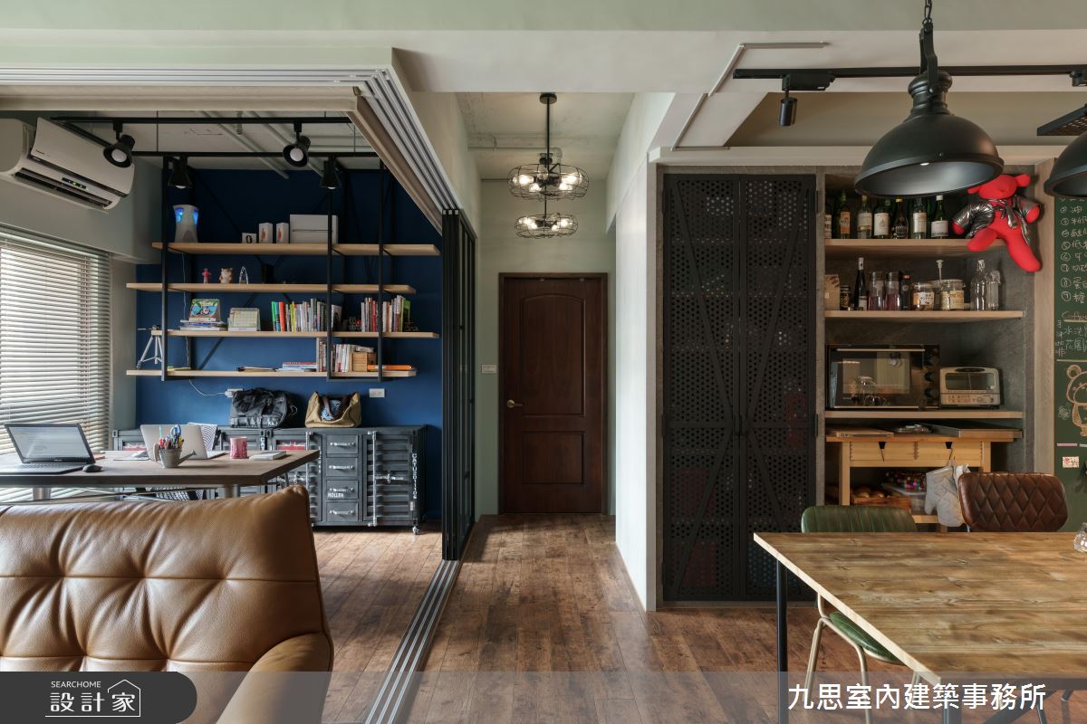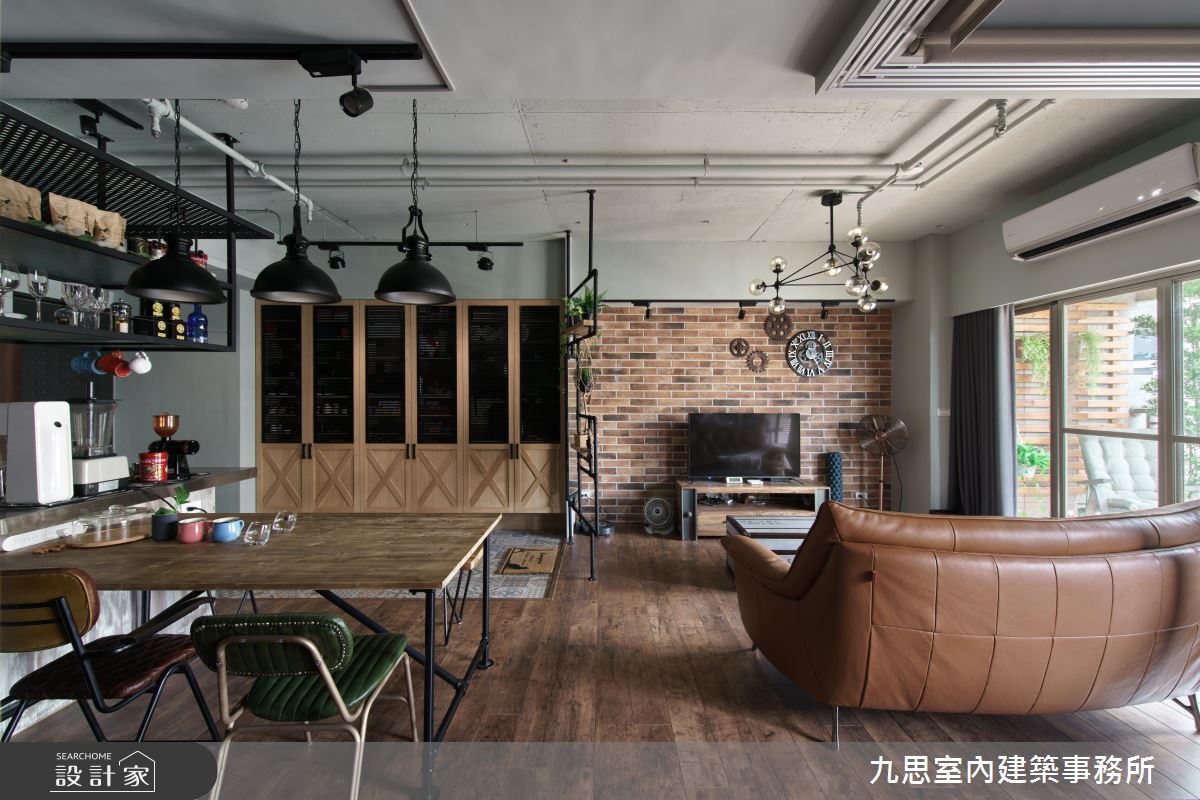 居宅使用紅磚、鐵件、木質等元素,營造獨特的 Loft風情,並搭配復古皮沙發,調和成風格十足的居家視野,同時配置一整排櫃體,巧思融入穀倉門語彙,在網羅收納機能之餘,亦開啟趣味的懷舊趣味,大面積的窗面則導入戶外風情,於陽台鋪設木地板,將採光、綠景一併吸納入室,完美消弭室內及戶外距離;書房則採用彈性隔間設定,運用彈性的玻璃拉門,讓書房開敞時,隨時可與客廳融為一體,型構完整方正的公區領域,導引光線和視線的無限舒展;餐廳區,藉著懸吊櫃、開放櫃體等整合一切機能,搭佐復古磚、黑板牆及不鏽鋼等等,在多種媒材之間演繹豐富的視覺層次!