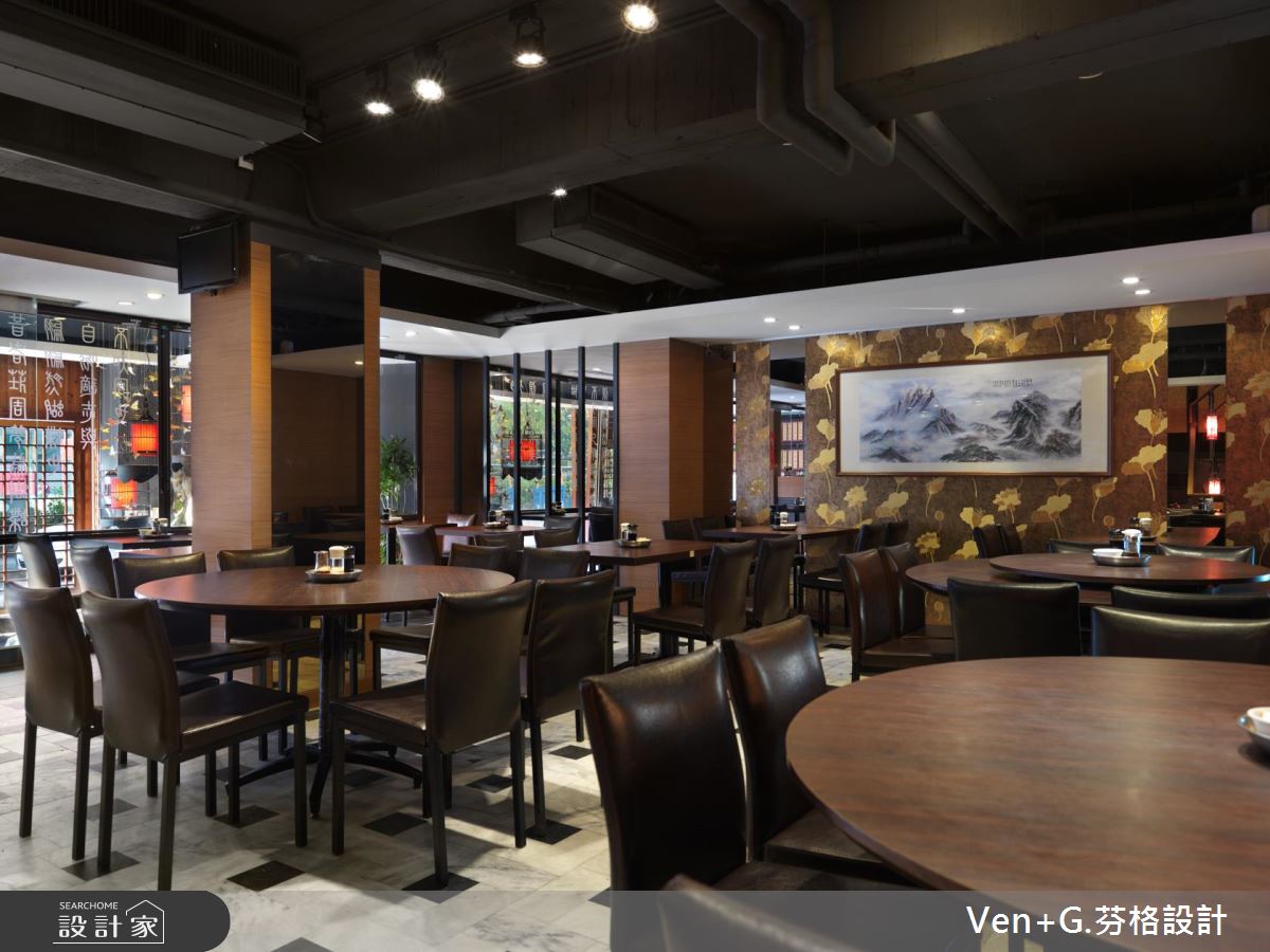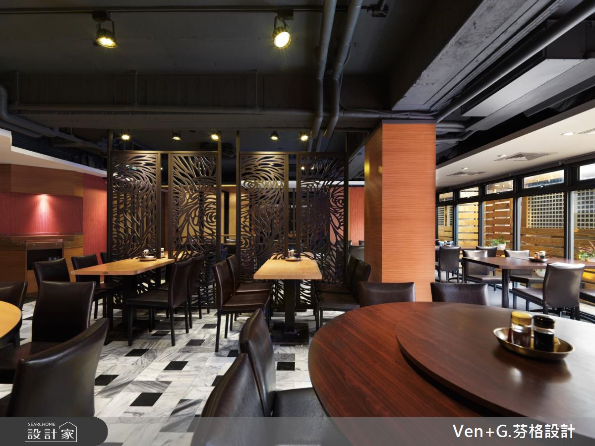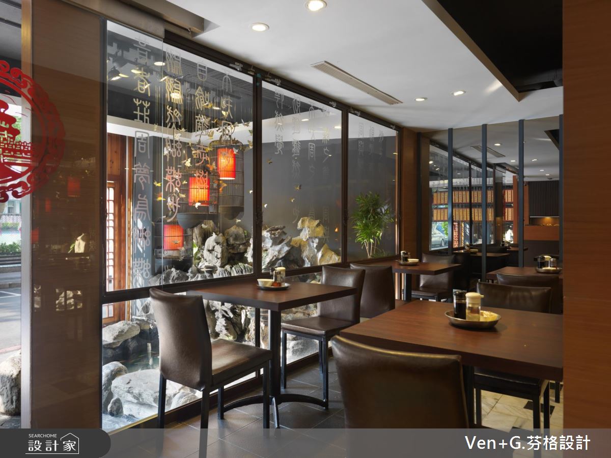 入口打造寫意的山水意象,天花板以鐵網鋪設,鳥籠及紅燈籠從上懸掛而下,翩翩然的蝴蝶紙藝輕盈點綴,妝點出詩意般的自然景緻。沉穩的咖啡色系為餐廳內的配色基底,局部透過鏡面的安排,其穿透的特質讓室內更顯延伸、開闊,而烤漆玻璃的運用更巧妙分割出適當的空間比例;木作搭配鐵件的樓梯設計,不僅呼應風格主題,更兼具安全的實用性,整體動線的規劃上考量出餐的進出動線、客人行走的流暢度以及環境氛圍;包廂的設計上,則打破隔間牆的傳統方式,以半開放式的屏風作為區隔,提高空間使用上的彈性。