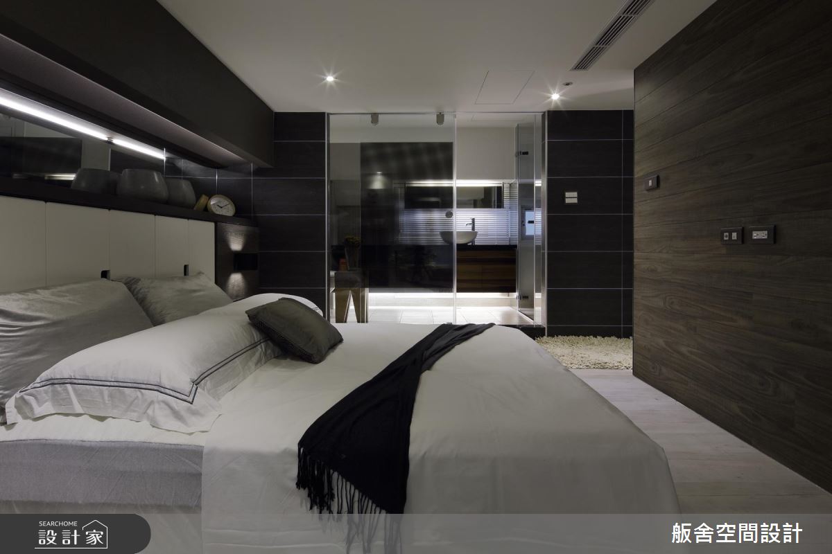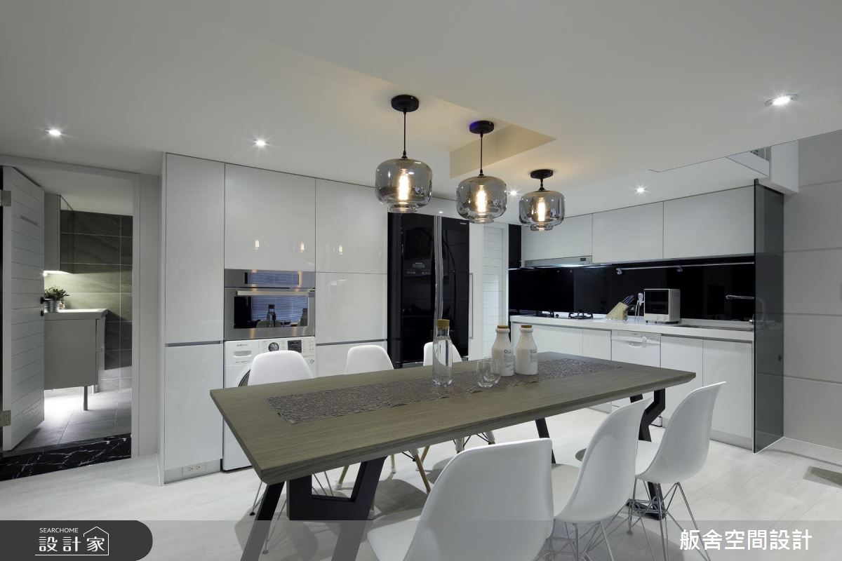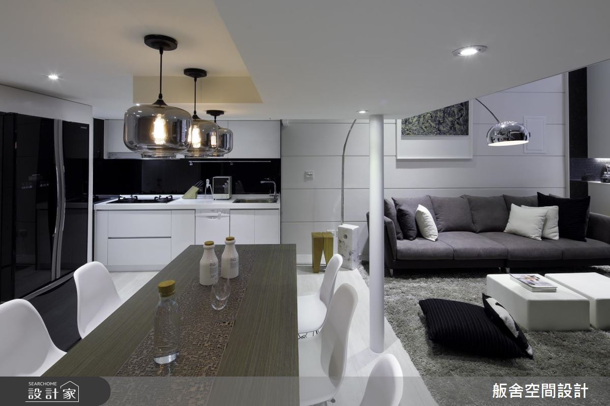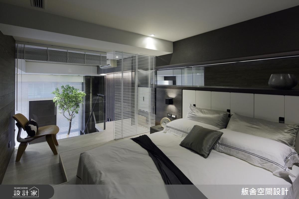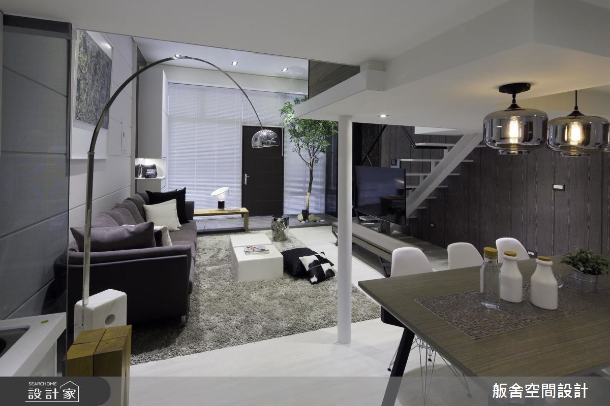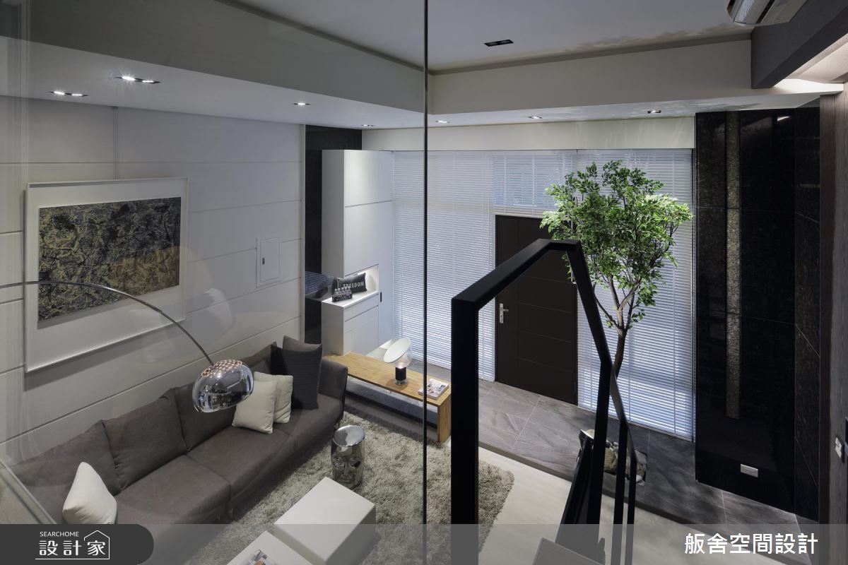 設計師首先依循生活習慣,規劃 2 房格局,且運用挑高的格局優勢,以及穿透性的規劃手法,促成客廳、餐廚、主臥室的視覺聯繫,並藉著室內造景的手法,在各角落擺放綠色植栽,以綠意貫穿全室、創造紓壓氛圍;同時完美區劃上下樓場域,於二樓配置主臥室,下方則作為開放式餐廚,餐廳旁陳列了一盞極富造型感的現代燈飾,創造出流暢的視覺動線;主臥內,則因著通透性的隔間處理,讓視覺可連向一樓綠意,空間承襲著低彩度的穩重色調,搭配軟件、家飾品陳列,串起居者的生活軌跡,引領現代都會風尚,一旁更利用玻璃、石材作出衛浴與主臥的界限,替小空間挹注更齊全的起居功能!