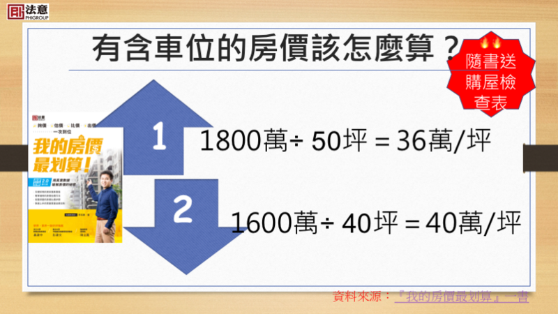 算法1: 1800萬元 ÷ 50坪(房屋+車位合計)=40坪=36萬元/坪