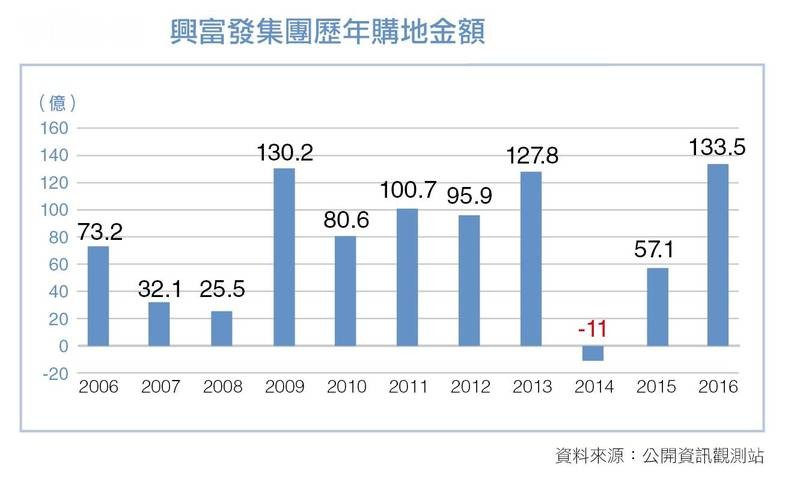 第三個是在2014年,當年的第三季到第四季是房價的高點,從此之後房價開始下跌,但興富發在當年度的購地金額為負數(代表有賣出土地),早已提前反應。2015年的購地金額也不高,遠少於之前的水準。2016年,興富發集團的態度又有了轉變,大砸了133.5億元購地,甚至還高於2009年的水準,再度打破集團紀錄。