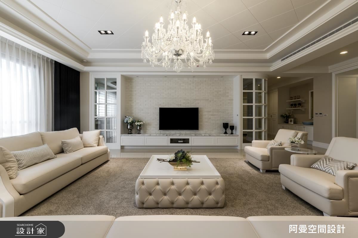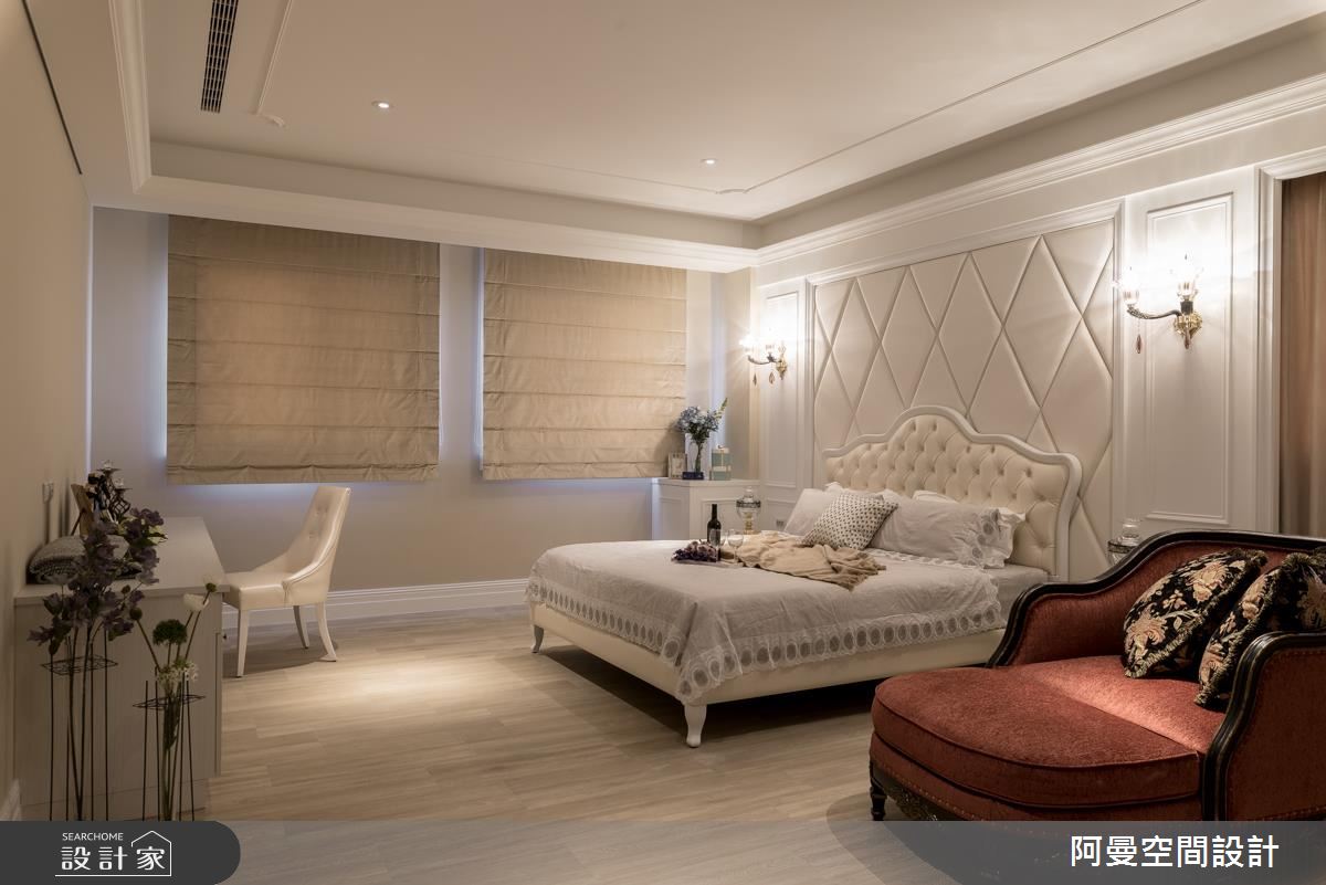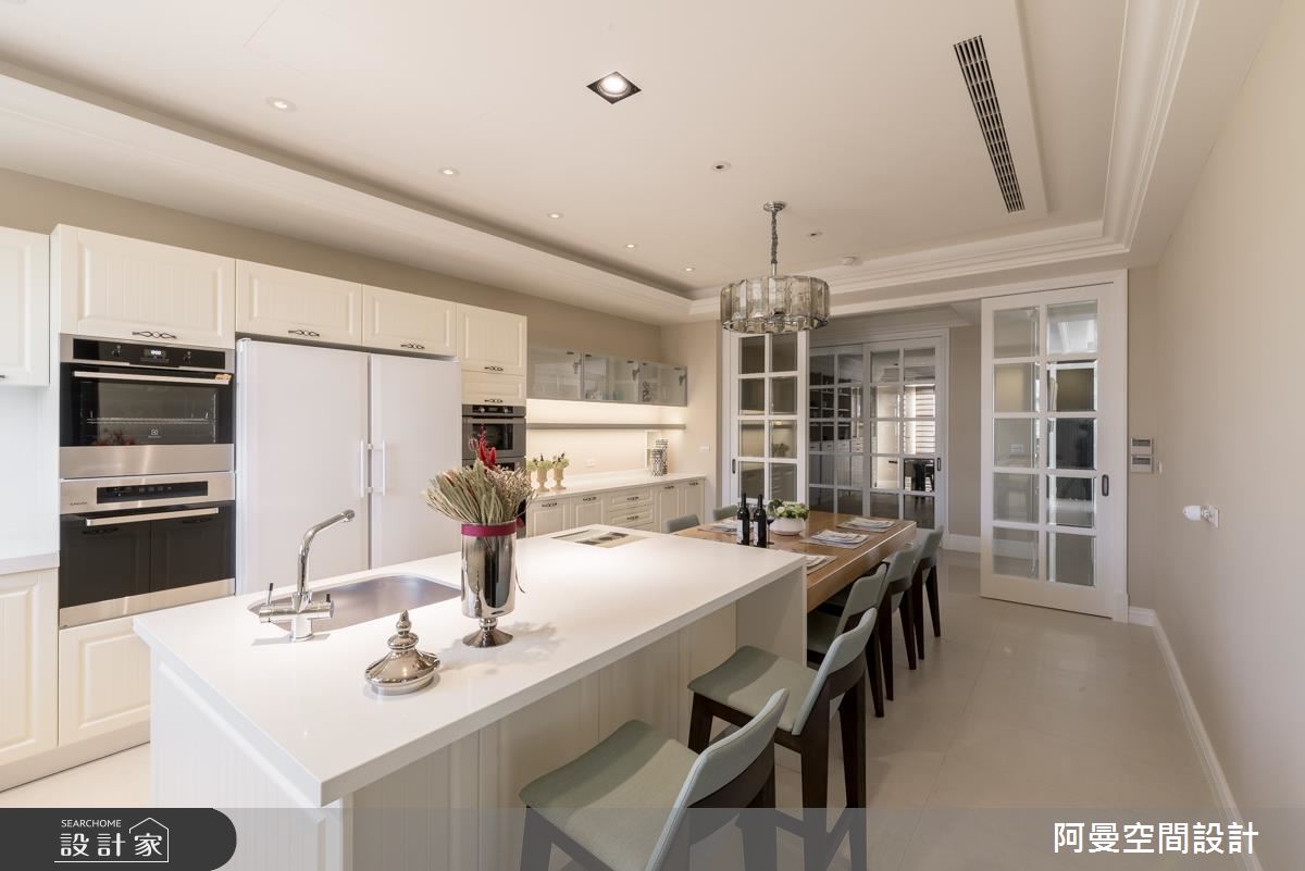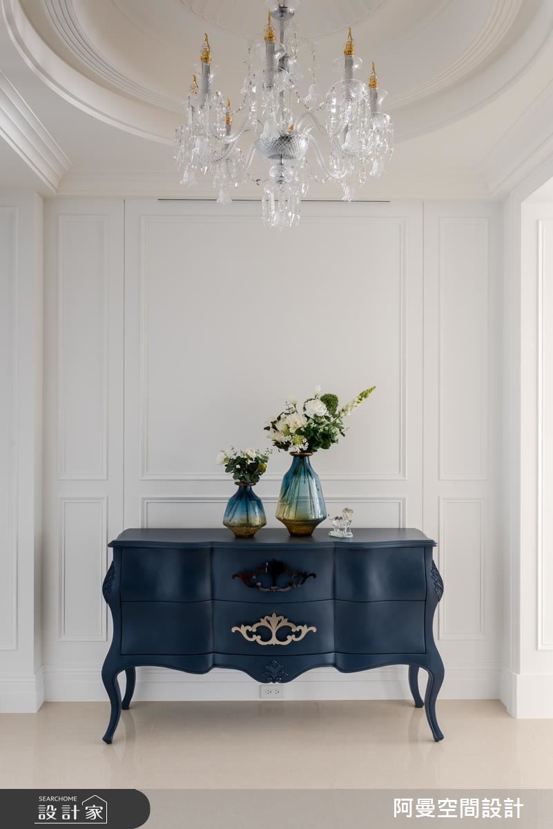 玄關區,利用烤漆壁板、水晶燈及圓弧天花營造美式鄉村的細緻感,搭配深藍色的玄關桌,凝聚入門口的視覺焦點;來到客廳,則可見菱格天花的細緻設計,且讓電視牆採以文化石搭配石材檯面、兩側結合玻璃櫥窗,創造場域主牆的大器與機能性;同時善用玻璃拉門規劃,減化實牆對走道的壓迫感,餐廚領域則備齊了一切實用收納機能,呈現通透而方正的格局,塑造流暢的使用情境;主臥加入了更衣室空間,運用白色烤漆、線板、菱格紋裱皮革搭配水晶壁燈,彰顯女性化的纖細表情,而一張從國外訂製的紅色單椅更是畫龍點睛,於素雅基調之中增添一抹成熟魅力!