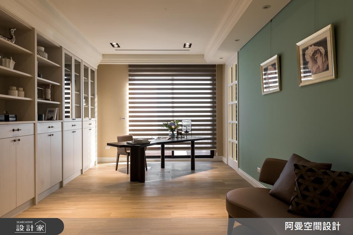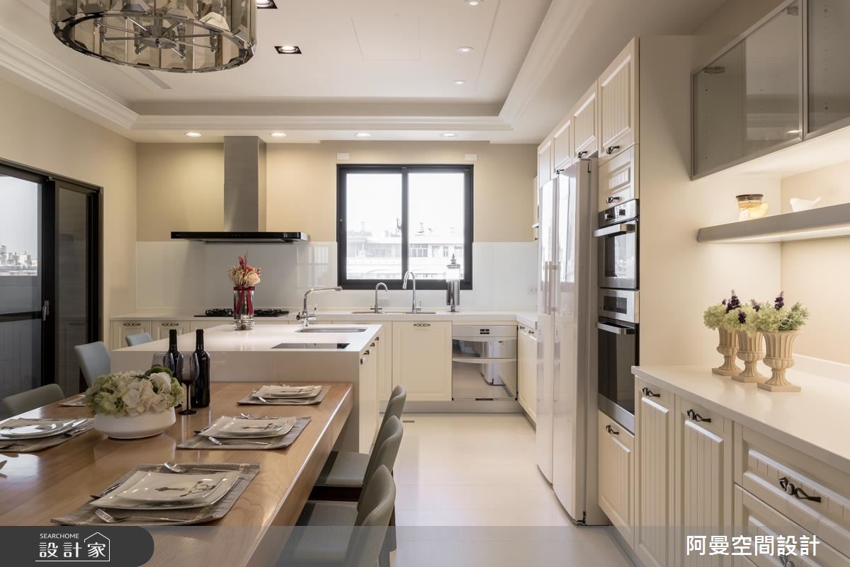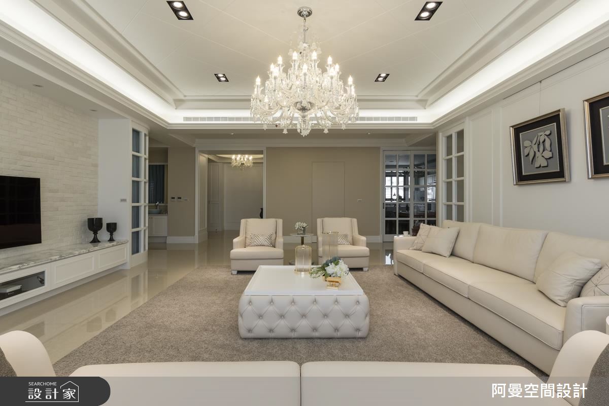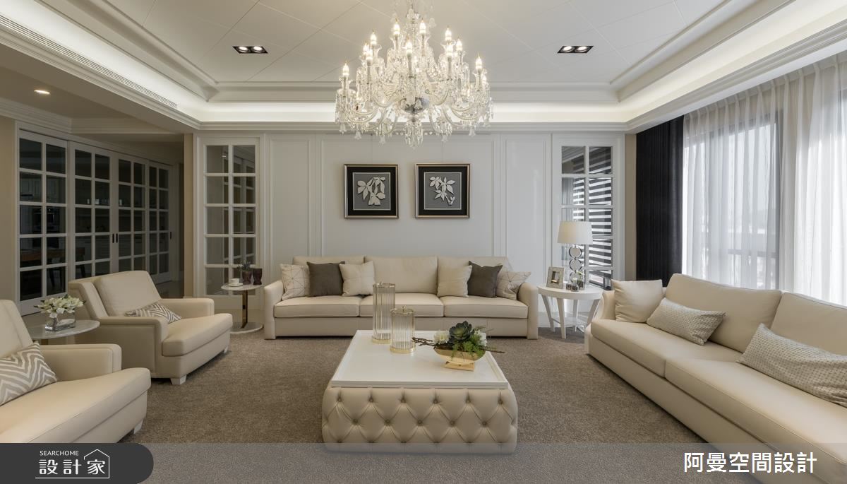 玄關區,利用烤漆壁板、水晶燈及圓弧天花營造美式鄉村的細緻感,搭配深藍色的玄關桌,凝聚入門口的視覺焦點;來到客廳,則可見菱格天花的細緻設計,且讓電視牆採以文化石搭配石材檯面、兩側結合玻璃櫥窗,創造場域主牆的大器與機能性;同時善用玻璃拉門規劃,減化實牆對走道的壓迫感,餐廚領域則備齊了一切實用收納機能,呈現通透而方正的格局,塑造流暢的使用情境;主臥加入了更衣室空間,運用白色烤漆、線板、菱格紋裱皮革搭配水晶壁燈,彰顯女性化的纖細表情,而一張從國外訂製的紅色單椅更是畫龍點睛,於素雅基調之中增添一抹成熟魅力!