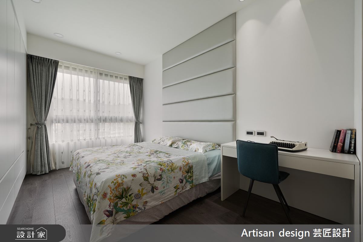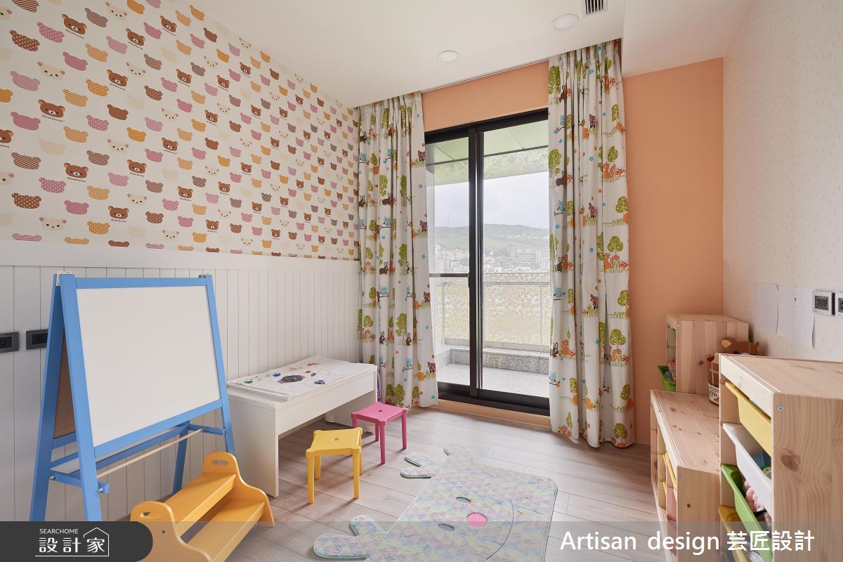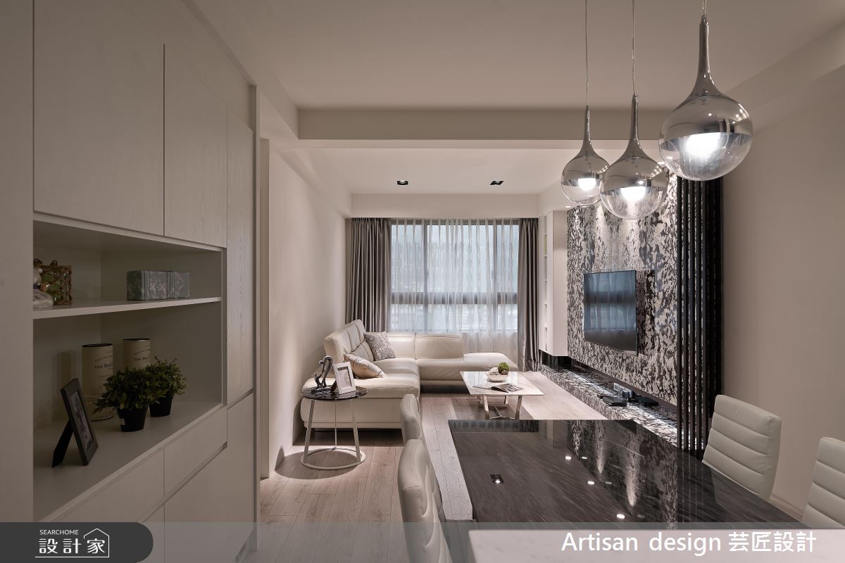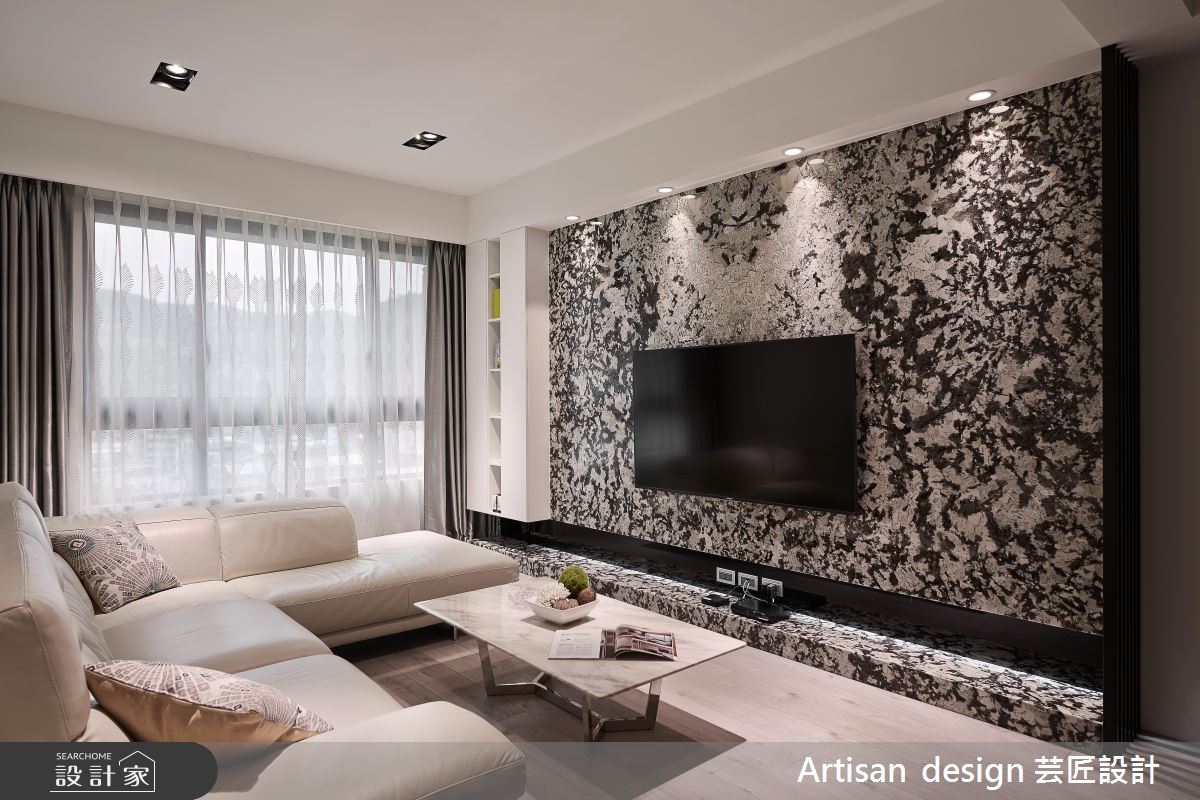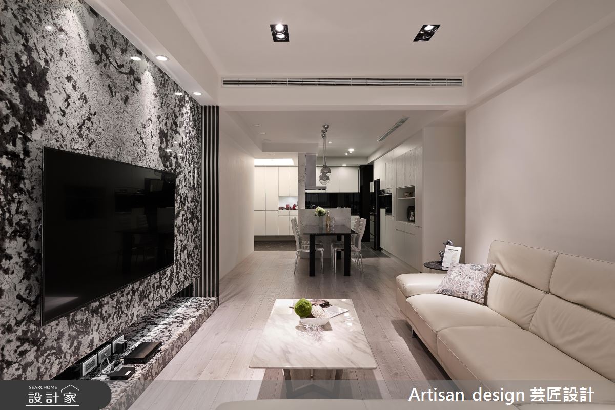 入口玄關處給予整排櫃體挹注機能,並於牆面加入白色大理石,讓材質巧妙轉彎,延伸至後側的廚房吧檯區,締造一氣呵成的材質連續,最終連結深色的石材訂製餐桌,發展出連貫而流暢的區域架構;客廳與餐廚區呈開放格局,以豐富的石材紋理塑造電視立面,形成沉靜冷冽的主視覺畫面,一側銜接細緻的格柵線條,帶出線性的律動層次感,再運用窗面收攬美好日光,搭佐室內燈光的調和,營造勻稱明亮的廳區視野;主臥回歸舒適氛圍,於床頭牆鋪陳細緻皮革,刻意將材質延展到頂,型塑更為挑高的場域感受,而次臥、遊戲間分別給予特色壁紙的妝點,開啟視覺上的生動想像!