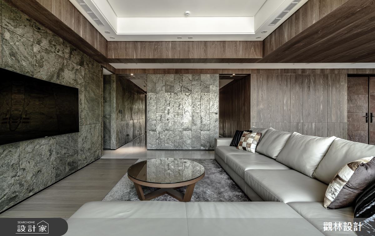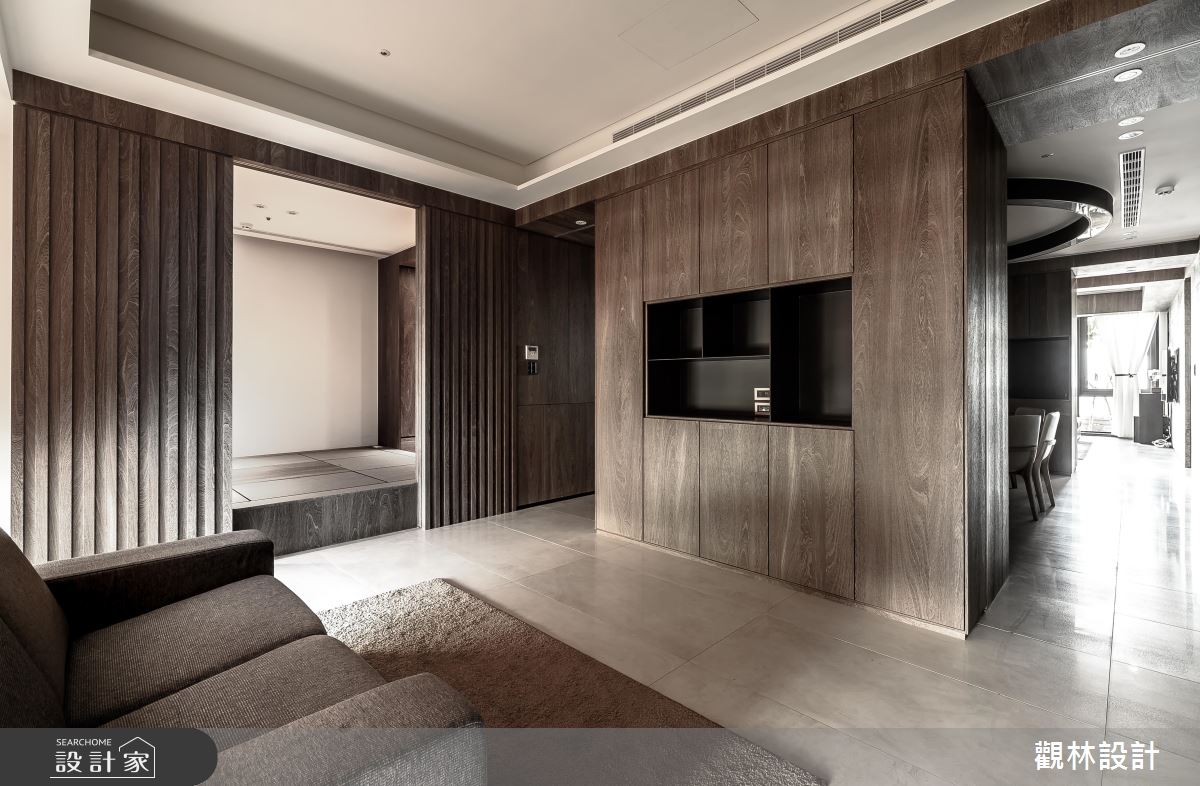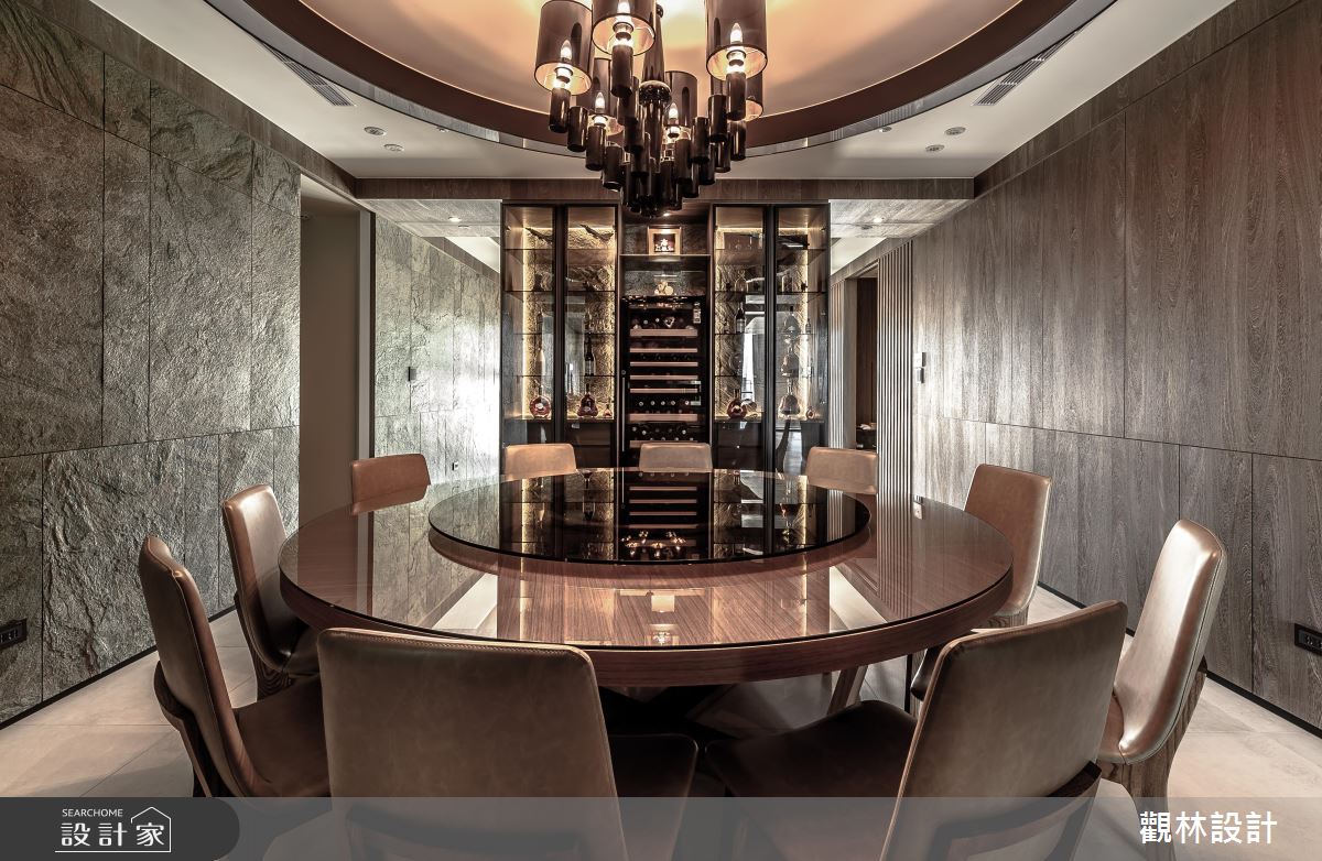 玄關區,選用天然石材作為基底,採以雙開式的門扉配置,並搭配天花板猶如星空般的燈光計畫,帶入寂靜深遠的中式之美;客廳則藉由雲母系列的粗獷石材,擘劃磅礡之勢,但同步穿插溫潤木紋相輔,彰顯建材的自然原味,地坪更刻意呈現異材質的區劃,巧妙串起一道廊道動線,做出生活脈絡的導引;同時考量到屋主重視交際,於餐廳區懸掛氣派的主燈,強調大器排場,並融入「天圓地方」的風水概念,凝聚內斂穩重的東方個性;而除了餐廳外,也另闢起居客廳兼交誼場域,推開一旁的木作門扉,更連結了簡約的和室房,此處可用以接待貴賓或品茗聊天,讓商務洽談坐擁更多的可能情境!