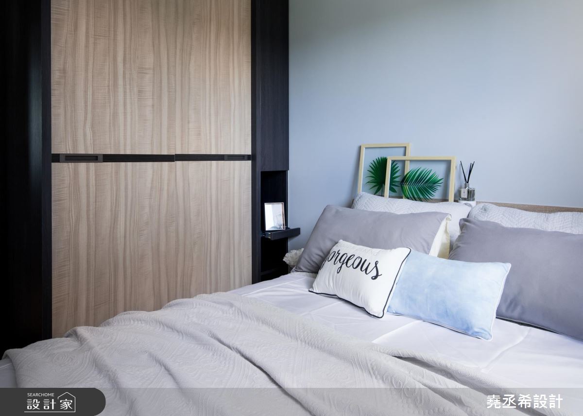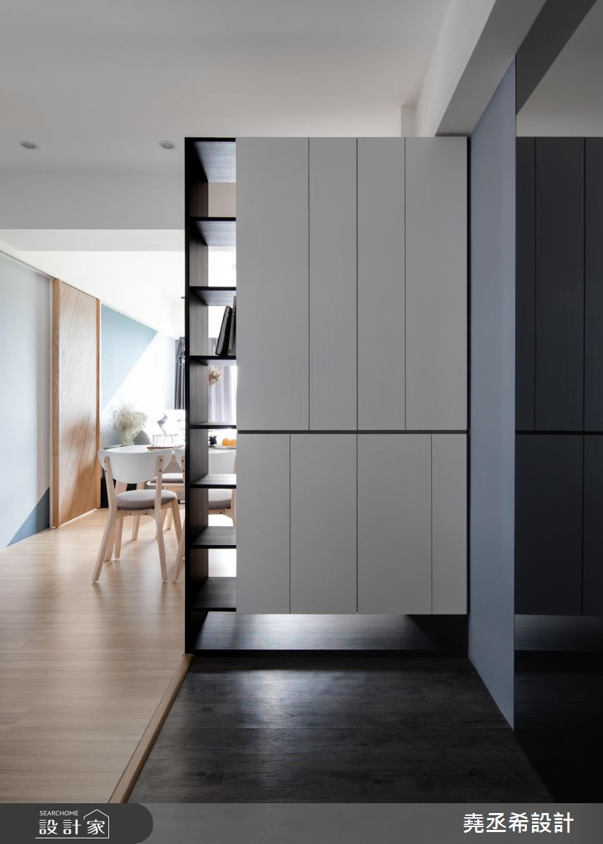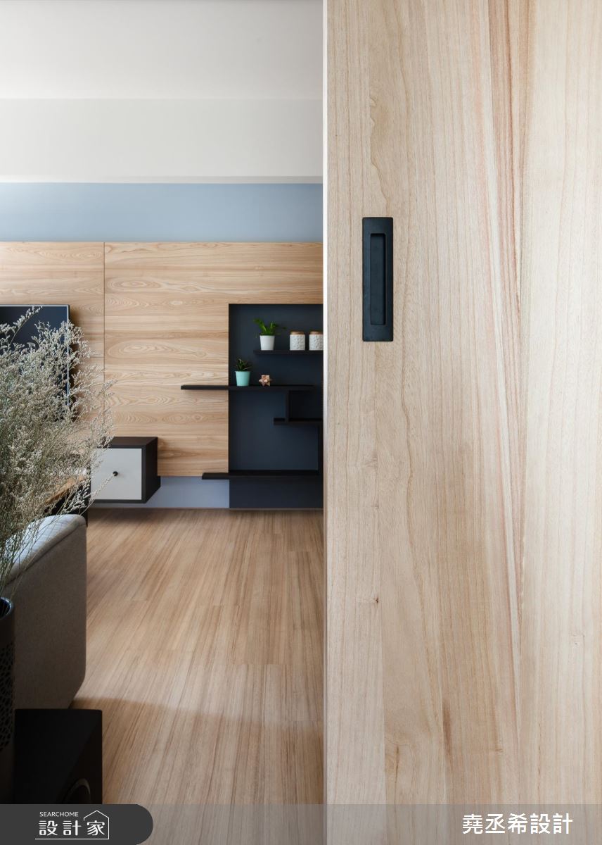 以深色木紋舖陳地坪,透過懸空的鞋櫃造型與淡雅木紋的地坪,界定出一處獨立玄關,而公領域的光源則穿越鏤空層板,讓玄關區也感染些許明亮感受。公領域以開放隔局安排,深淺藍色相間且以傾斜角度銜接,淡雅之中流露清爽的質地,引喻海洋般遼闊胸懷,灰色調的沙發背牆更融入淺色壁面中,展現簡約、安定之感;鮮明的木紋肌理仿彿神來一筆,轉化為地坪、門片、電視牆與茶几風貌,引入自然的療癒生命力,餐桌更選用橢圓線條勾勒桌體邊緣,降低尖尖角角的視覺感受,替家屋增添一股溫馨、療癒氣息;客、餐廳之間的壁面,利用層板框構出展示機能,簡單、俐落的線條勾勒出北歐設計的靈魂,餐桌上同樣以別具風格的餐瓷、玻璃器皿擺設,透亮輕盈的質材特性,搭佐綠意的植栽點綴,激盪出北國的清新、美好的人文美學。