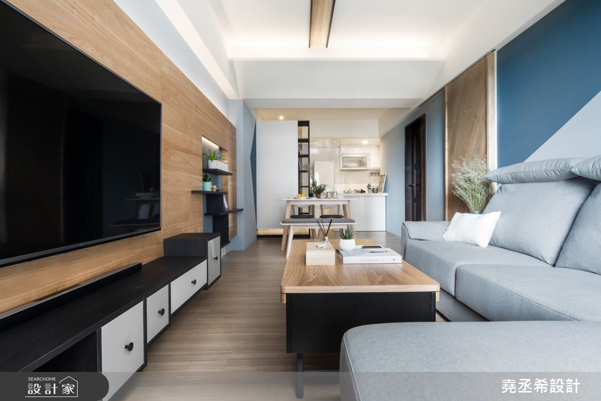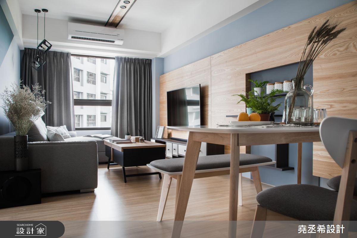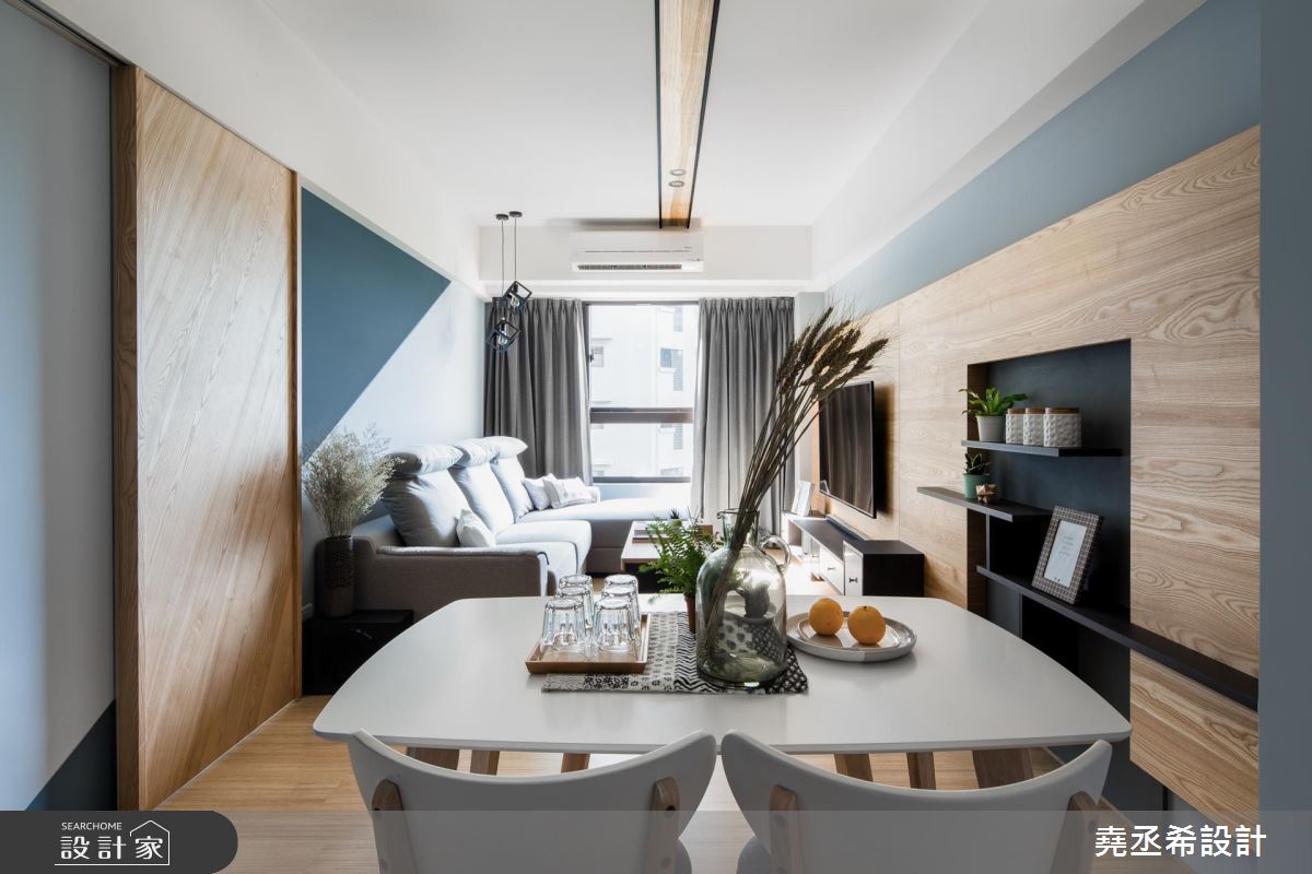 淺藍色壁面搭佐木紋肌理,從餐廳延伸至整面電視牆,大面積的鋪陳手法,自然加大空間尺度,而深淺色系的靈活運用,調和活潑、富變化的室內氛圍。
