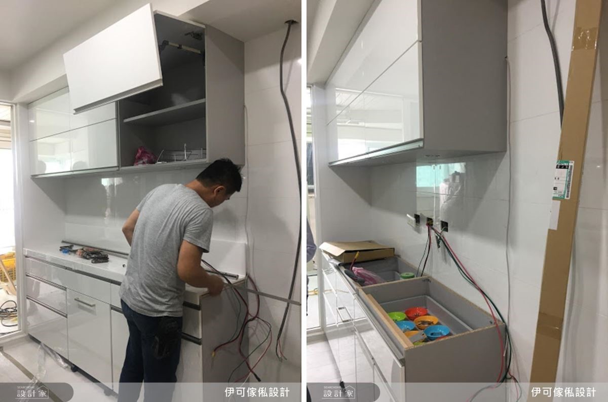 經過精密計算與溝通討論,確認家電設備數量後,林設計師為柯以柔佈局了適合煮飯、工作與直播的廚房。獨立電度讓柯以柔得以安全無虞的使用烘碗機、蔬果清洗機、烤箱、微波爐與冰箱等耗電量較大的電器。