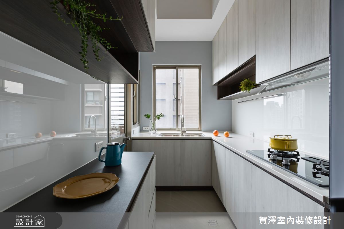 36 坪中古屋經由專業規劃切分屋主預算,拆除原先格局,更新隔間、廚房、衛浴、地坪與水電管線,確保基礎建設安全無虞,最後利用剩餘的預算進行美觀施作。以開放式設計串連公領域空間,並抹除玄關分野,以延伸至餐廳的大面積懸櫃提供充裕的入門及日用收納。以純白色調為基底,並在沙發背牆與餐廳牆面漆上清爽的水藍色,達到跳色效果,為空間增添視覺層次卻不顯雜亂。針對空間配置,將獨立廚房與餐廳置於同一水平,讓動線更加順暢,並利用玻璃拉門阻絕油煙,卻不會影響光源穿透。針對屋主需求,設計師安排 L 型流理臺搭配電器櫃與易清潔的烤玻,打造完整廚房機能。