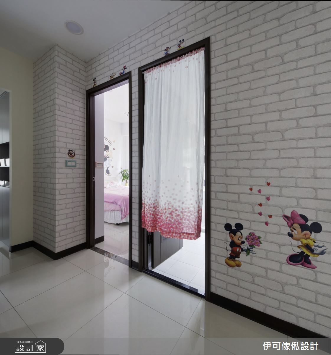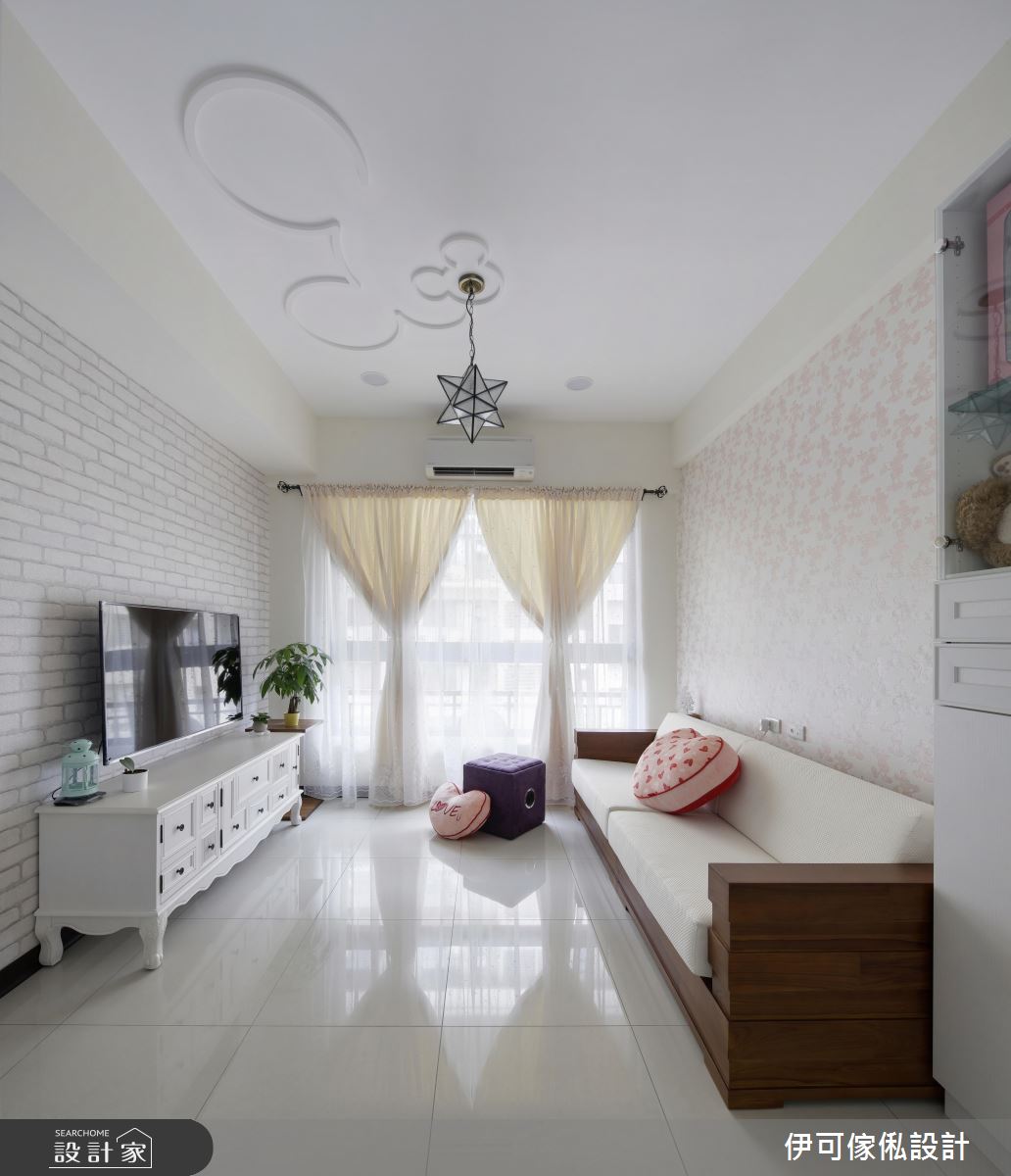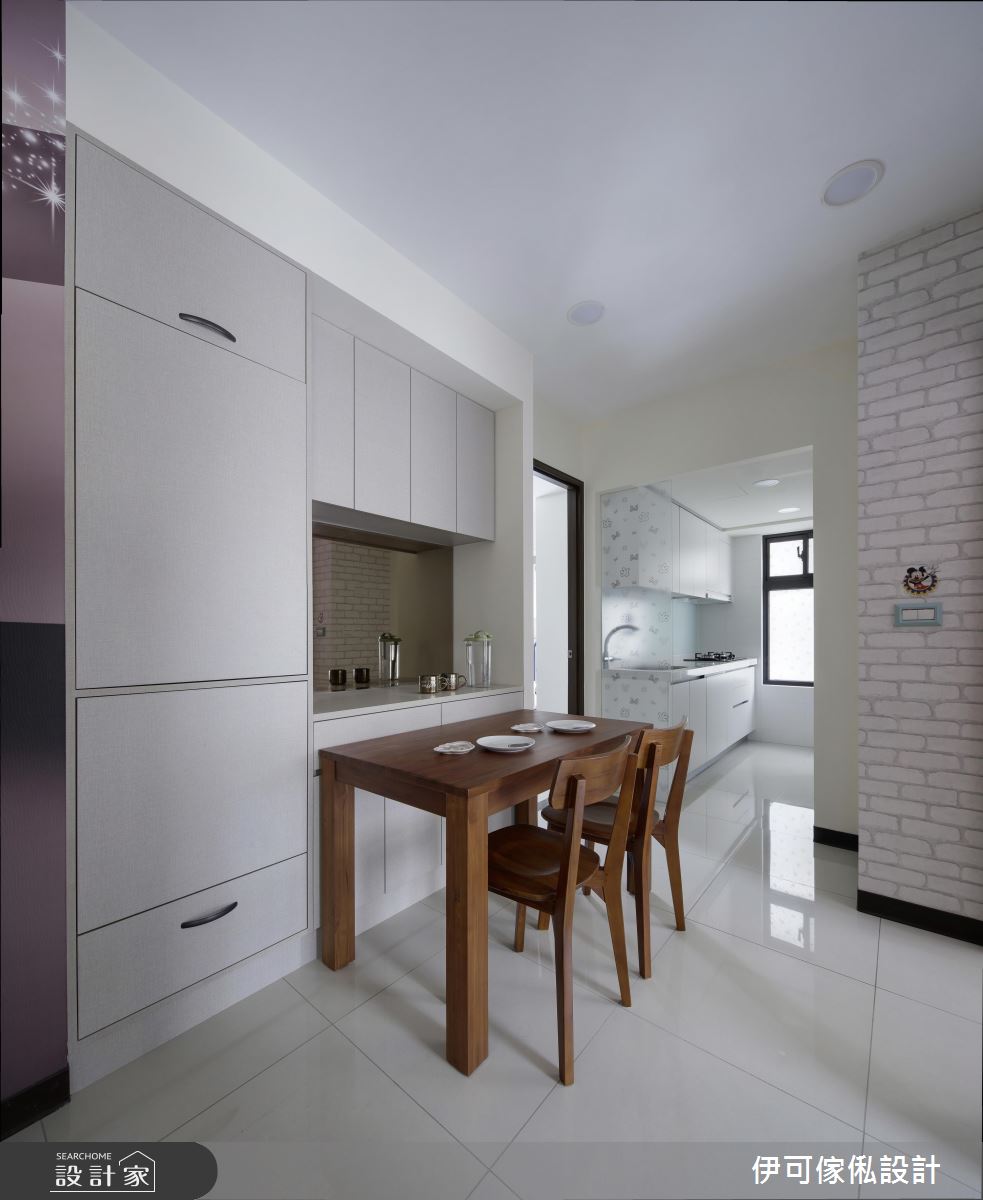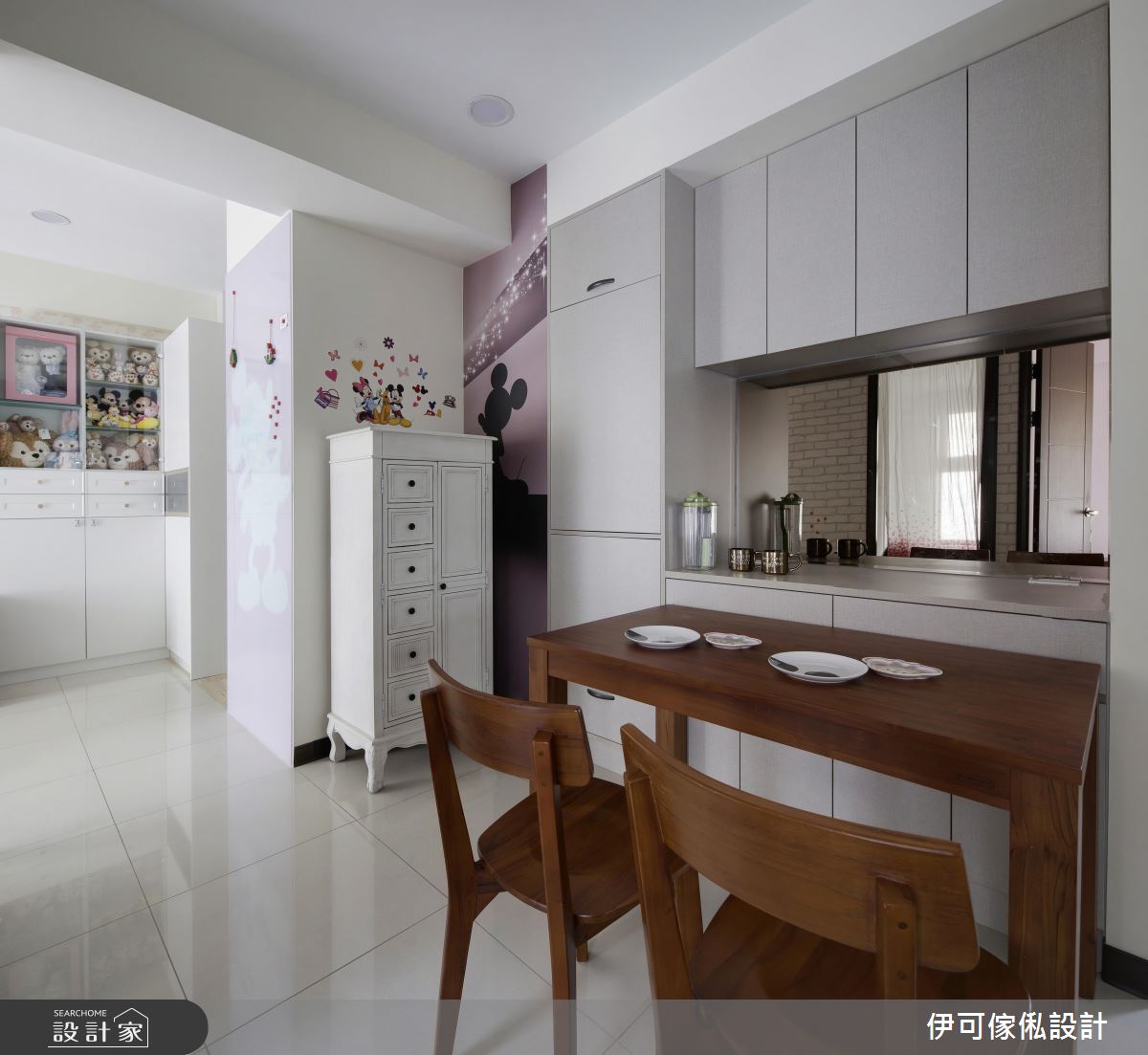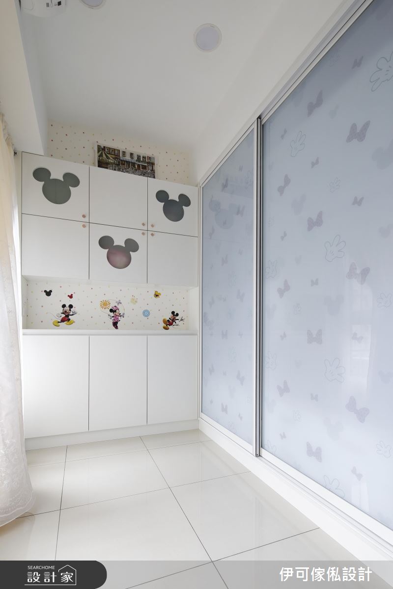 玄關處,設計師規劃了一整面鏡面櫃,不僅提供穿衣鏡機能,更藉由材質反射、拓大入口的空間感;公領域則保有充裕採光與對通的氣流,並依循生活需求,創造系統家具的完美機能與應用型式,再加以款式多樣的特製進口壁紙鋪敘牆面,達成美型簡約的風格營造;來到餐廚區,則礙於空間有限,將餐廳與廚房整合在一區,以一小面通透隔屏做出簡單界定,並開啟合宜的動線擘劃;寢臥內,則呈現濃濃的個人風格,運用壁貼與迪士尼卡通圖案,讓天花、櫃體到牆面皆充滿一致主題性,道出生動的起居氣氛!