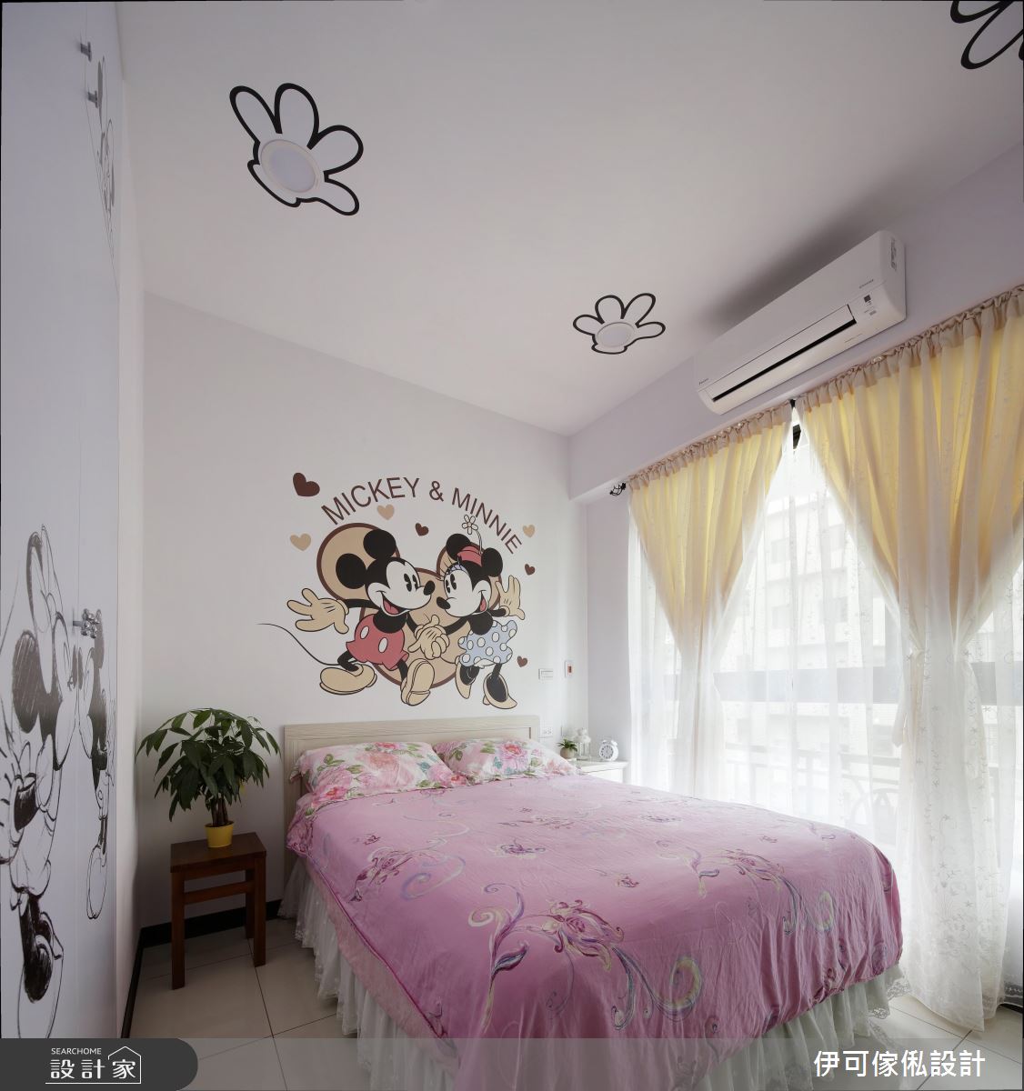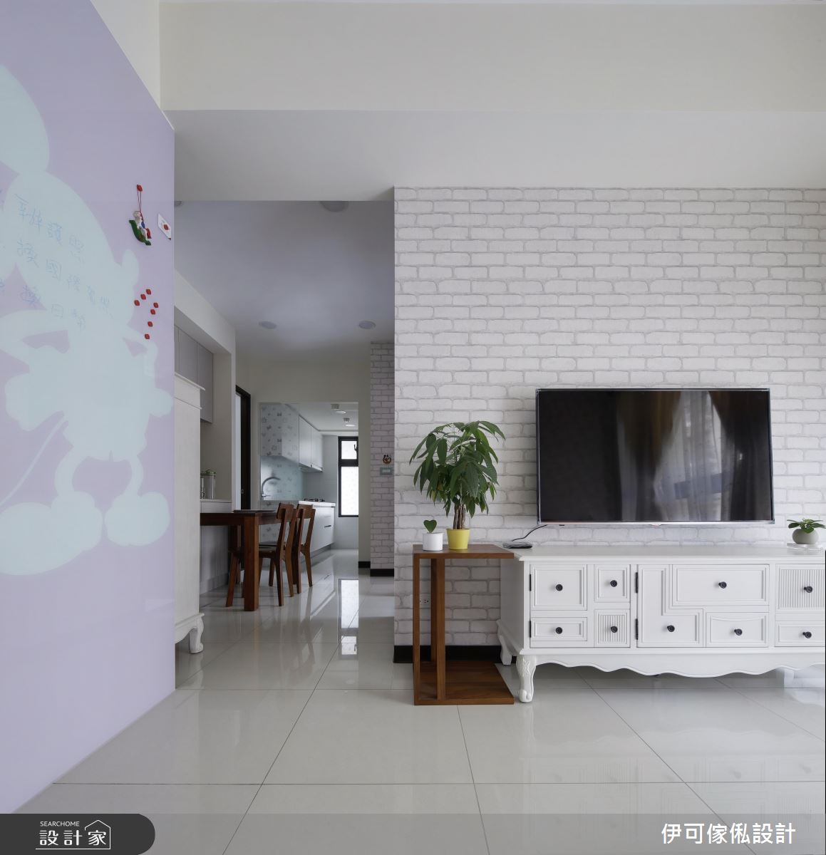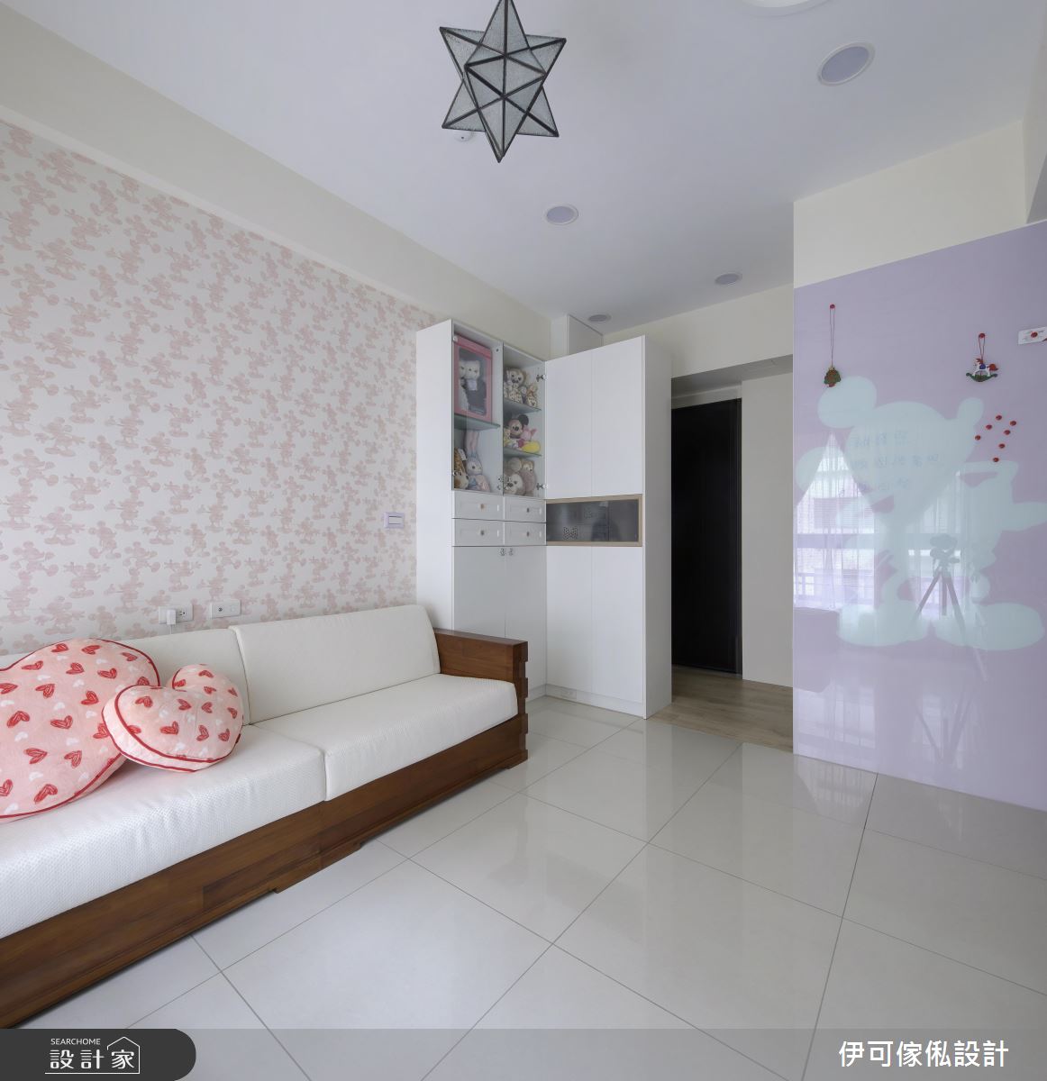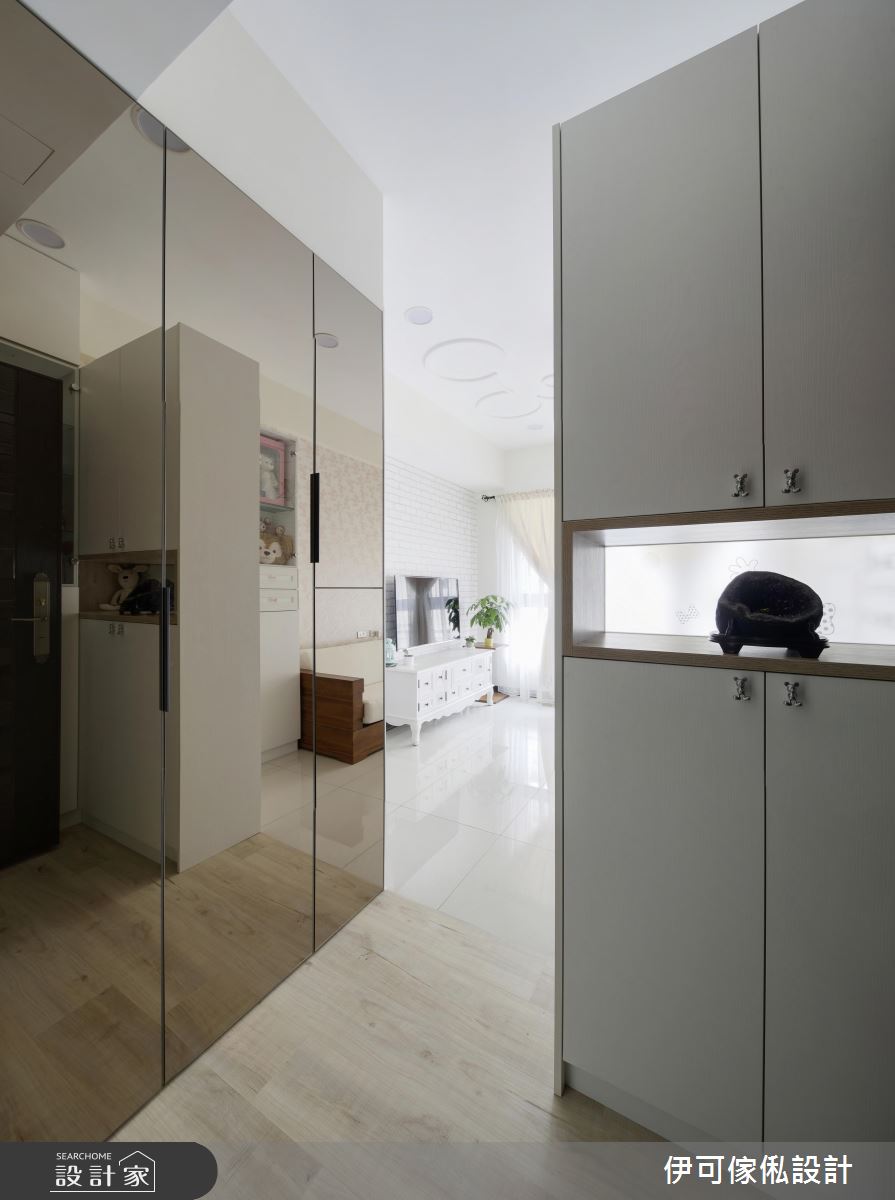 玄關處,設計師規劃了一整面鏡面櫃,不僅提供穿衣鏡機能,更藉由材質反射、拓大入口的空間感;公領域則保有充裕採光與對通的氣流,並依循生活需求,創造系統家具的完美機能與應用型式,再加以款式多樣的特製進口壁紙鋪敘牆面,達成美型簡約的風格營造;來到餐廚區,則礙於空間有限,將餐廳與廚房整合在一區,以一小面通透隔屏做出簡單界定,並開啟合宜的動線擘劃;寢臥內,則呈現濃濃的個人風格,運用壁貼與迪士尼卡通圖案,讓天花、櫃體到牆面皆充滿一致主題性,道出生動的起居氣氛!