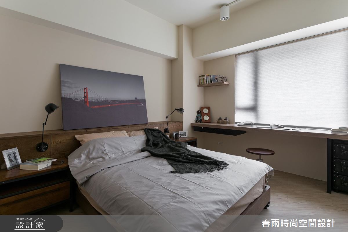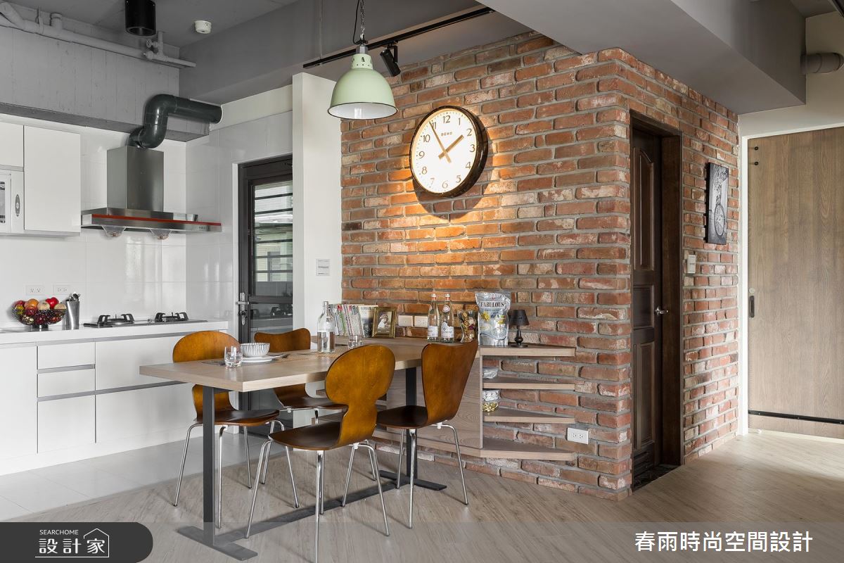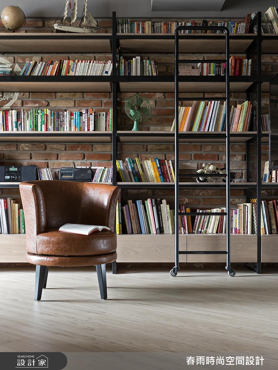 設計師讓公領域呈開放式規劃,並捨棄制式的電視牆,透過一面以鐵件為結構的客製書牆聚焦視覺,背景則鋪述大面積的復古紅磚,此書牆放的多是屋主藏書與研究用書等,讓立面不僅兼具裝飾功能,更道出了「收納不僅只是儲放,還需便利拿取」的實用意義;而旋轉電視牆的配置,亦貼近使用者的習慣喜好,營造自在不受限的觀賞視線,開啟流暢的動線脈絡;寢臥內,考量到床頭樑體的存在,藉著收納床頭櫃迴避頂上壓迫,且同步網羅機能,型塑舒適的生活畫面;同時規劃量身打造的更衣間,以純熟工藝充分運用每吋坪效,搭配妥善分類的櫃體分佈,創造機能、風格兼具的更衣場域!