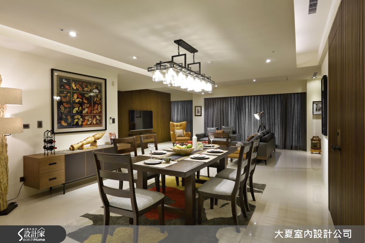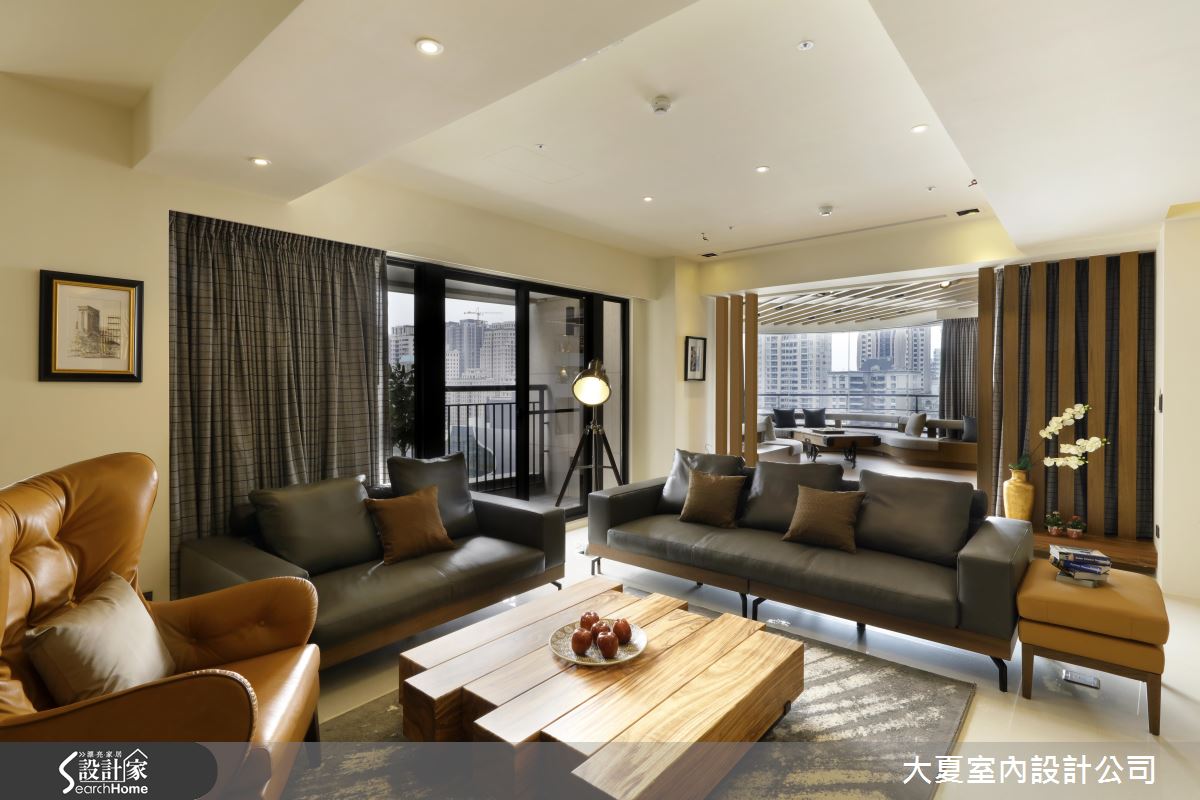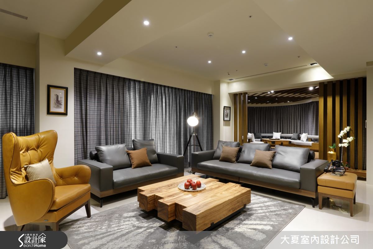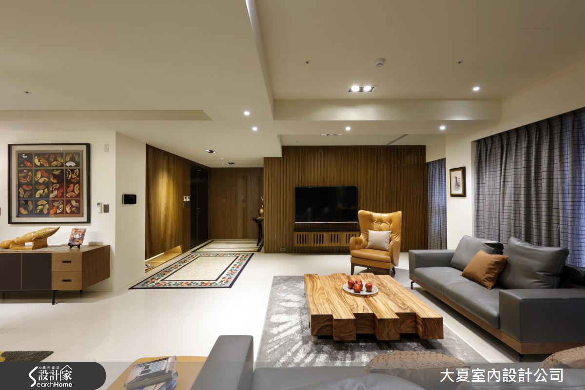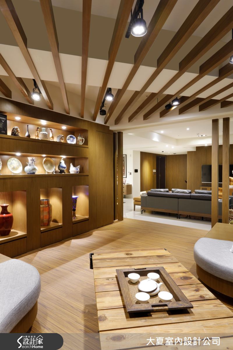 為了收攬美好戶外景色,設計師沿著窗邊規劃令人放鬆的獨立段落,運用圓弧造型的延伸,結合臥榻沙發配置,無形中柔化了界域關係,並拓大了空間感受,天花上方則藉由格柵輕帶,不僅順勢瓦解大樑壓迫的窘境,也形成步入主客廳的視線導引,一旁則規劃整面木質展示牆,佐以高級藝品陳設及燈光烘托,兼具風格營造與實用機能;客餐廳呈現開放規劃,坐擁安穩的大器質量,於電視牆、玄關等處鋪敘木質線條語彙,豐富且具有秩序之美,再透過軟件家具的鋪排,將現代語彙與日式禪韻完美結合,詮釋大宅的沉靜優雅!
