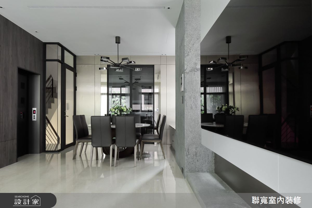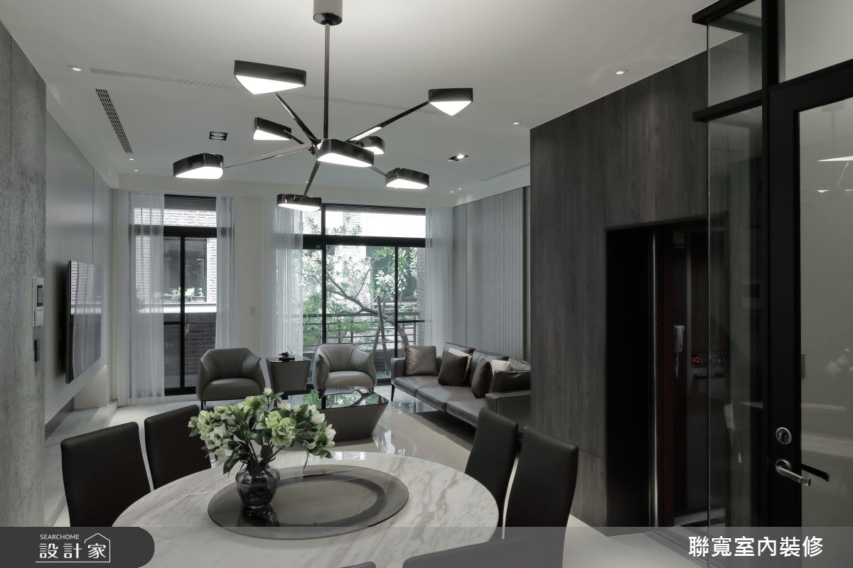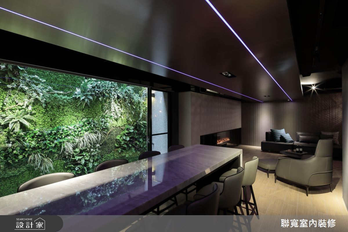 開放的公領域裡,以沉穩的色調作為空間設定,簡約的白色替天花板襯底,隨著戶外光源的灑落,拉出寬闊的室內感受;電視牆結合白色收納櫃體,蘊含多元機能;灰色調的沙發、鏡面茶几的挑選呼應低調且優雅的現代風格,條紋視覺勾勒出立面造型的沙發背牆,隨著深淺色系交錯與溝縫的細節描繪,形塑漸層的美學氛圍,替客廳帶來視覺的變化;餐廳區則以鐵件腳架的單椅與風格吊燈的配搭,營造出質感非凡的時尚感受;地下室為屋主日常的休閒娛樂區,面臨採光不足且管線高度低的窘況,設計師借由拉高天花板高度,並善用異材質描繪空間,加強室內長度,且打造一處落地窗,將戶外的植栽牆納入室內設計的一部分,營造出舒適、愜意的自然氣息。