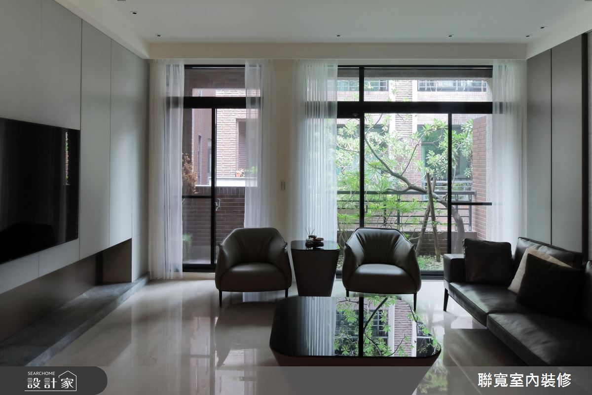 窗外透露些許自然綠意,隨著落地窗引援入室,替乾淨、純粹的室內增添些許生氣;空間裡以黑、白、灰為基底,藉由鐵件、金屬與石材等質材交織出俐落的現代風尚,且納入豐富的收納機能,創造獨樹一幟的時尚家屋。