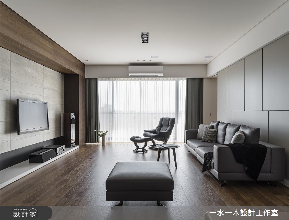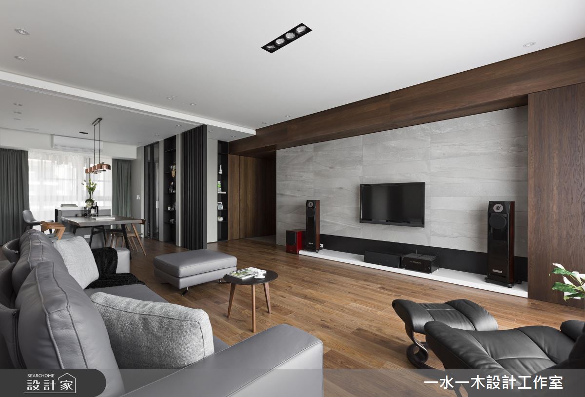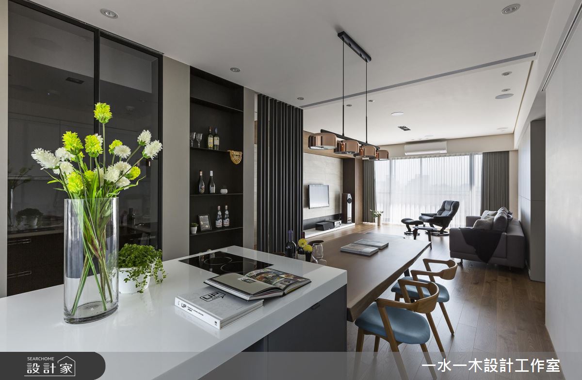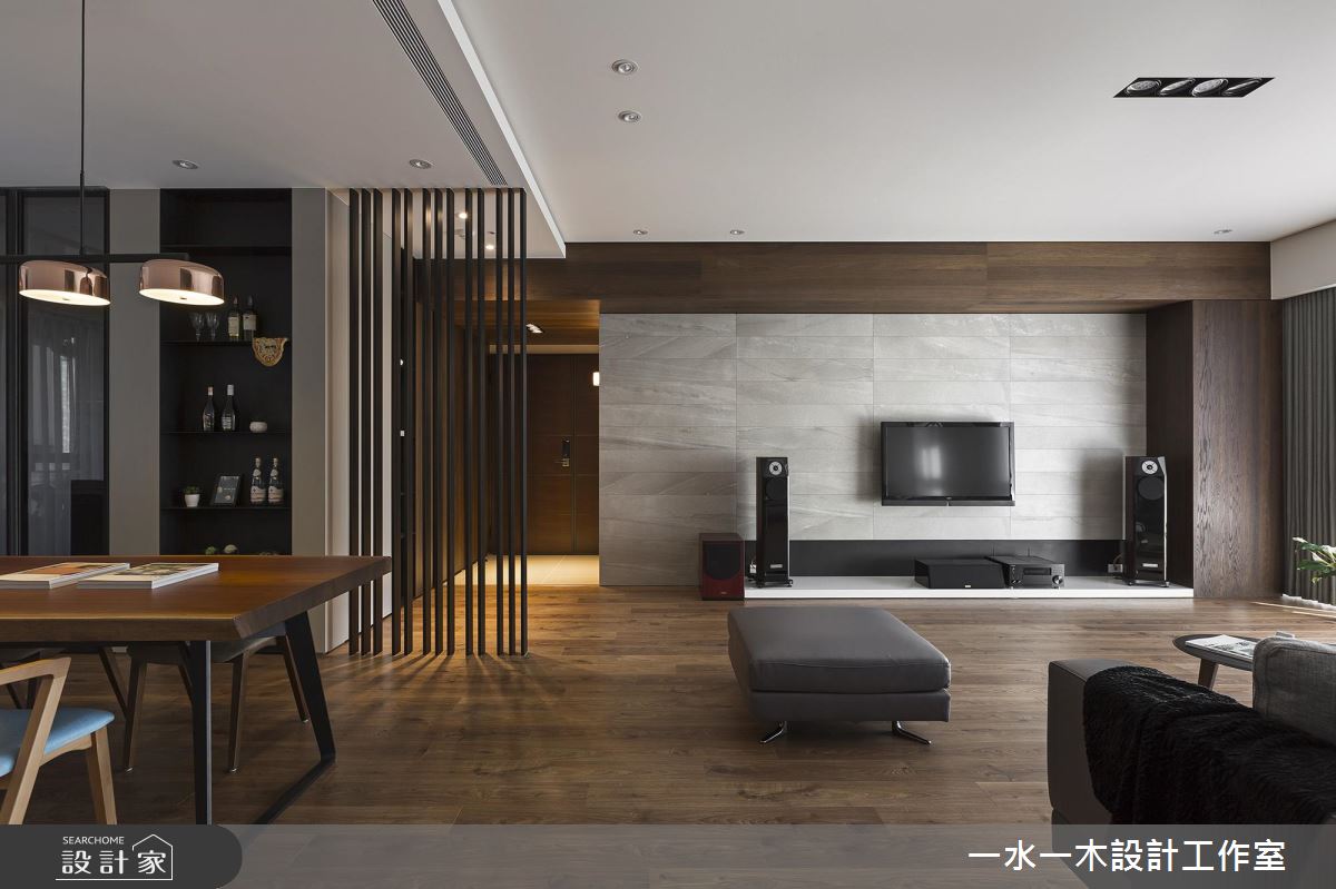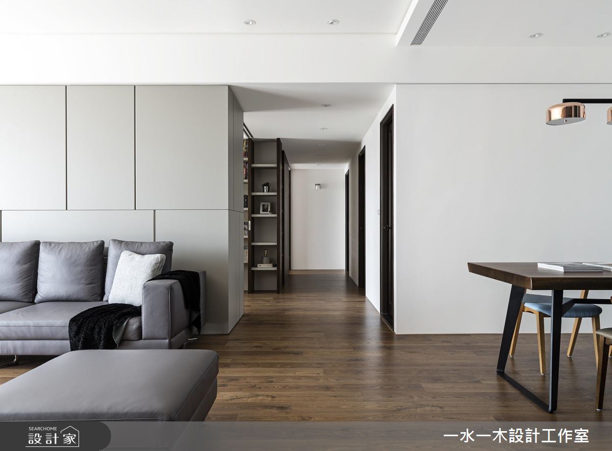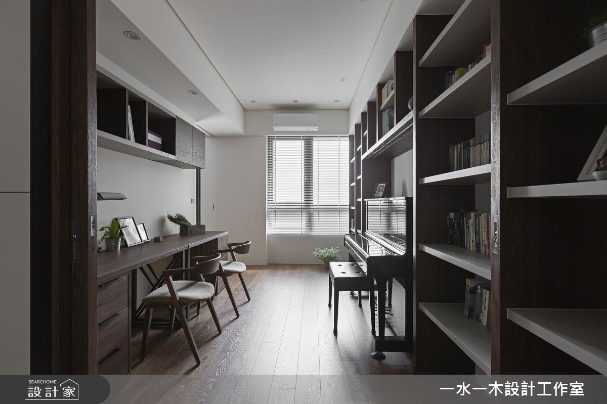 居家整體呈現明亮沉靜的設計主軸,並巧妙涵蓋諸多實用性能,於廳區保留立面留白,搭佐深色木皮的鋪陳,型塑簡約人文的公領域場景,並妝點灰色義大利板岩磚型構電視主牆,統一採用低甲醛材料,讓大人、小孩的生活更為安心;且將房門開口統整於廊道,維持公私領域清晰分野,運用軌道門打造開放而彈性的書房,不只促進場域之間互動性,亦在光線流動之中,替加寬走道帶進自然光,延展廊道的空間感;書房內則配置大面書櫃,不僅挹注收納機能,也網羅休憩、閱讀、練琴等主題;餐區則呈開放規劃,讓每個角落皆可接收自然光洗禮,並以格柵銜接牆面遮蔽餐桌,藉由線條帶出日式感沉靜語彙!