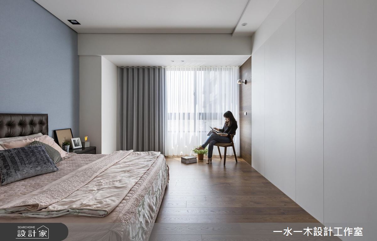 主臥內,設計師於窗邊樑下保留空白地帶,搭佐單人椅與壁燈妝點,圍塑出一處幽靜閱讀角落,帶來極致的放鬆體驗!