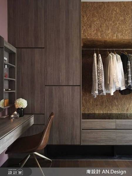 拉開位於書房旁的實木拉門,即是通往臥室與更衣室的廊道,隱約還能透出設計師特別為夫妻兩人規劃的婚紗櫥窗,讓人眼睛為之一亮;臥房空間主要以木質陳設為主,搭配灰粉色牆面,營造寧靜的寢臥氣氛。