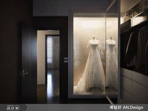 屋主當初結婚購買了婚紗,婚後希望家裡能有一處擺放的空間,設計師巧妙的在更衣室設計了一個展示櫃,為屋主夫妻保留愛的回憶,同時也成為進入房間廊道、更衣室內獨一無二的端景。