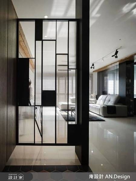 設計師在內玄關以鐵件玻璃隔屏及六角磚地坪,與屋內空間形成簡單的領域界定。而錯落的長虹玻璃帶出視覺層次的穿透感。
