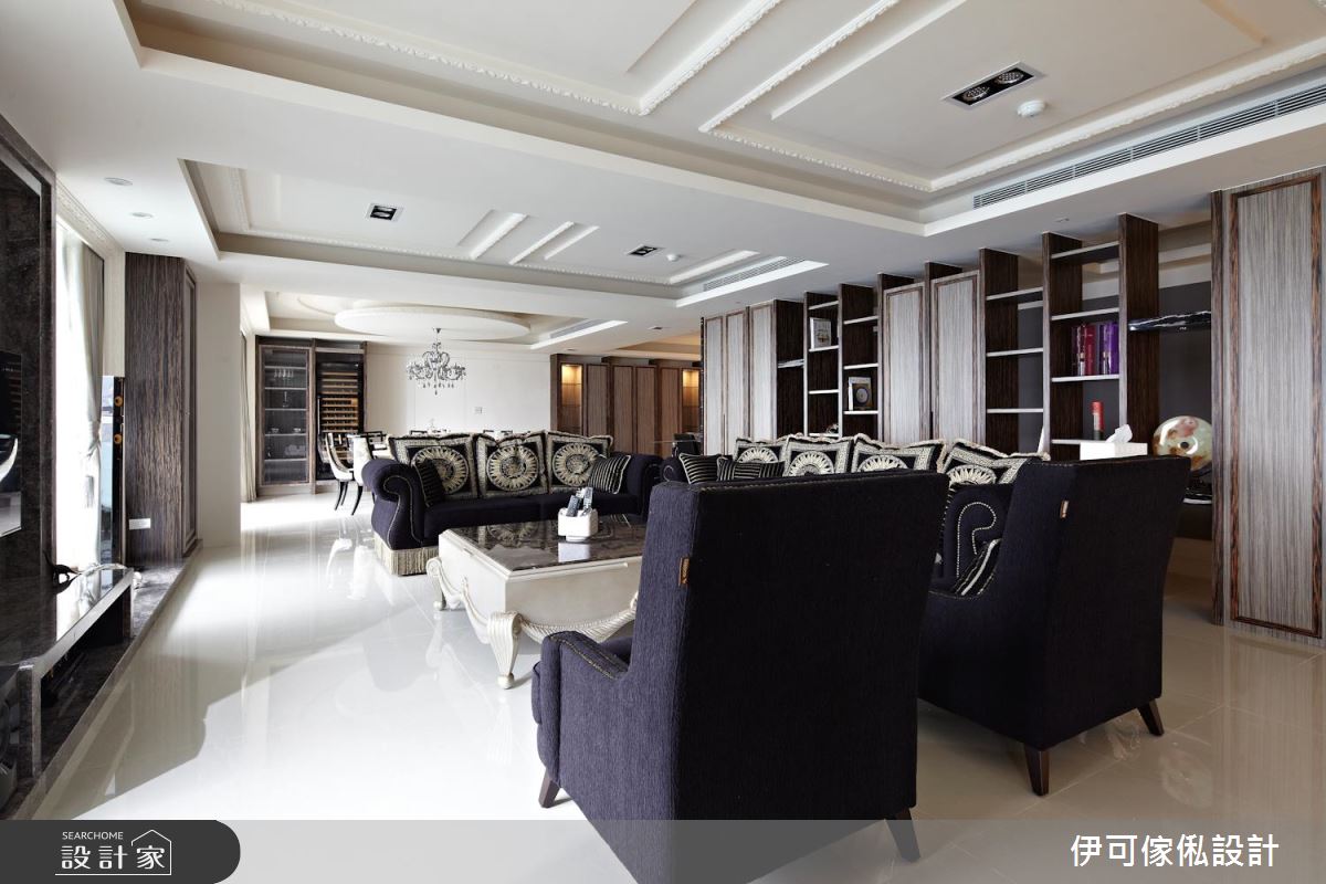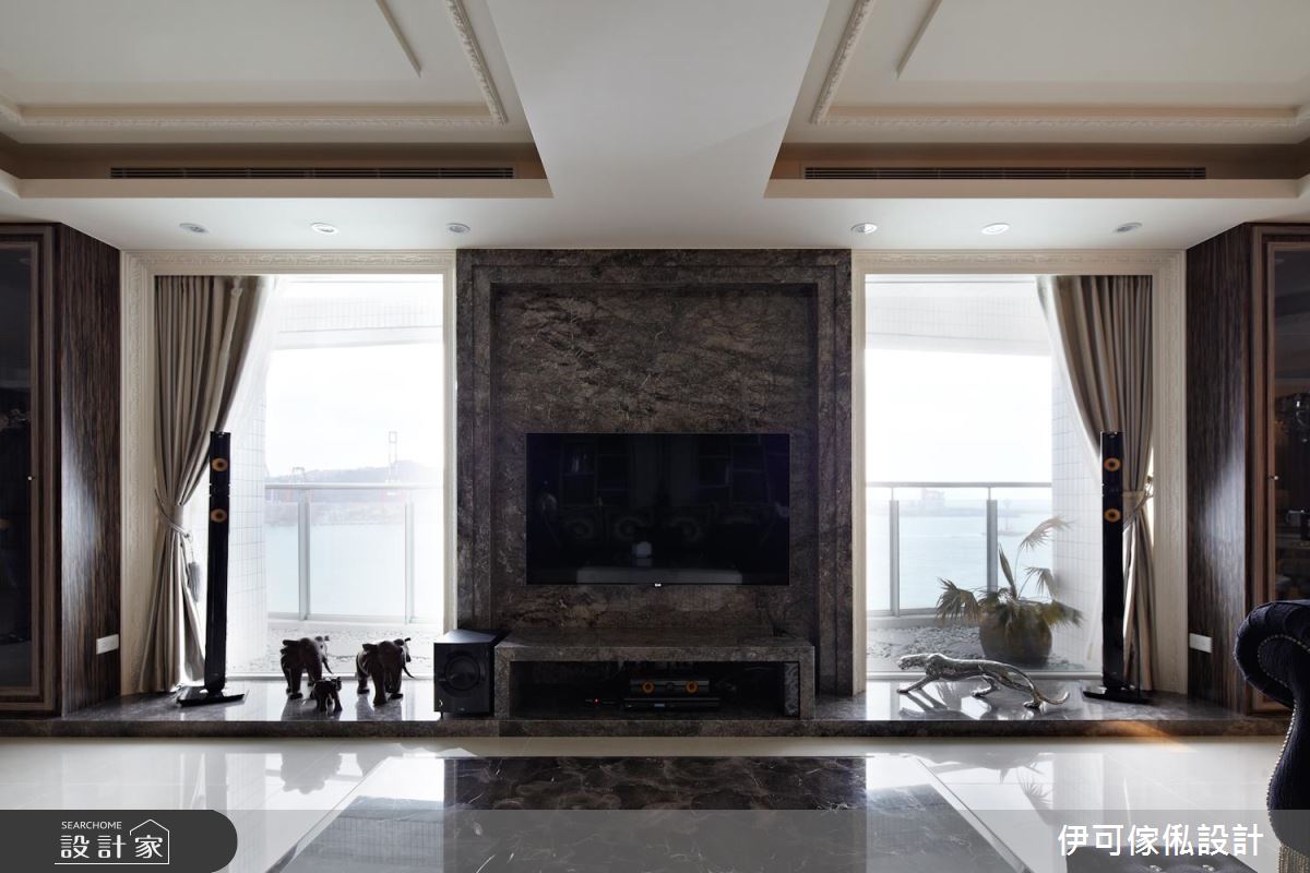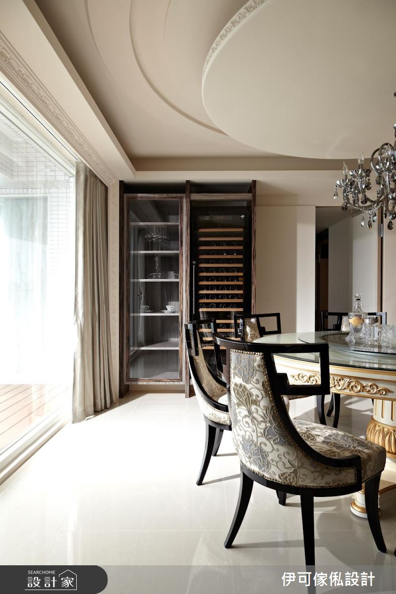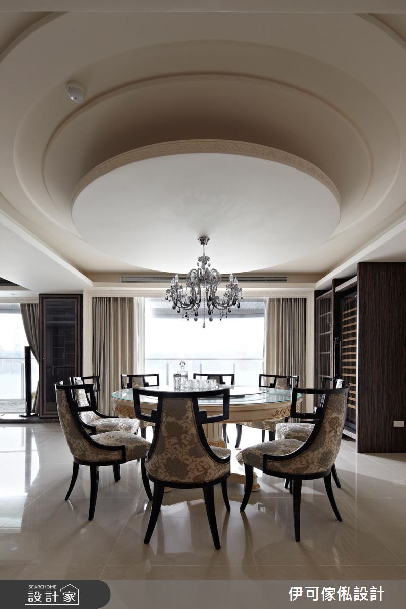 公領域,劃分為客餐廳與開放式的鋼琴演奏區,將每一格局開放連貫,把樑體作為界定場域的指引,再搭配天花板造型包覆,不僅塑造空間感放大的效果,也締造井然有序的整體架構,並將客廳大理石電視牆視為中心點,搭襯後方的窗面造景,連動室內及戶外視野,而客廳的大理石茶几則跟電視牆產生呼應,透過訂製的細節處理,讓材質表現更顯完美;餐廳區,採以圓弧天花對應圓餐桌,再以懸吊水晶燈作聚焦,烘托雍容大度的用餐情景,一側更安置櫥櫃與紅酒櫃,使機能運用更形完善,同時配置一座吧檯、並統整廚具收納,讓一切使用更為得心應手;主臥內,於床頭立面鋪貼壁紙,與兩側木質紋理相得益彰,再藉著窗簾、貴妃椅、床組款式等形塑古典風韻,讓整體在一致色系之中、彰顯饒富層次的優雅風情!
