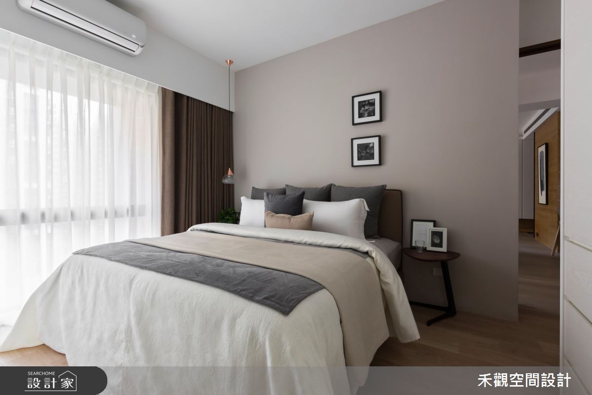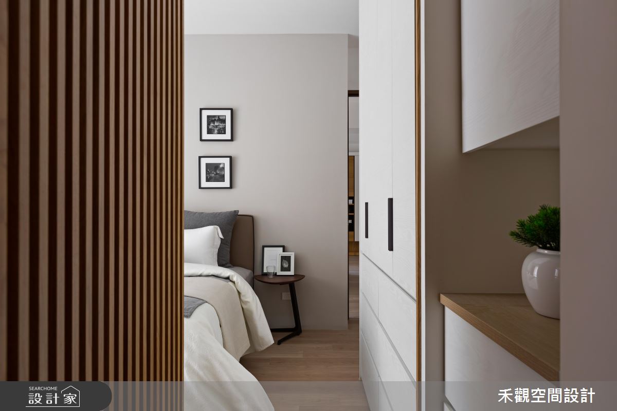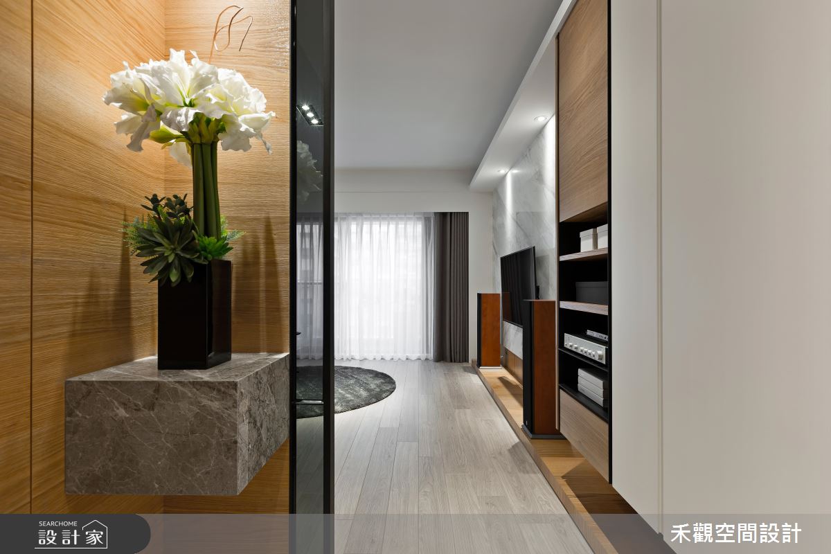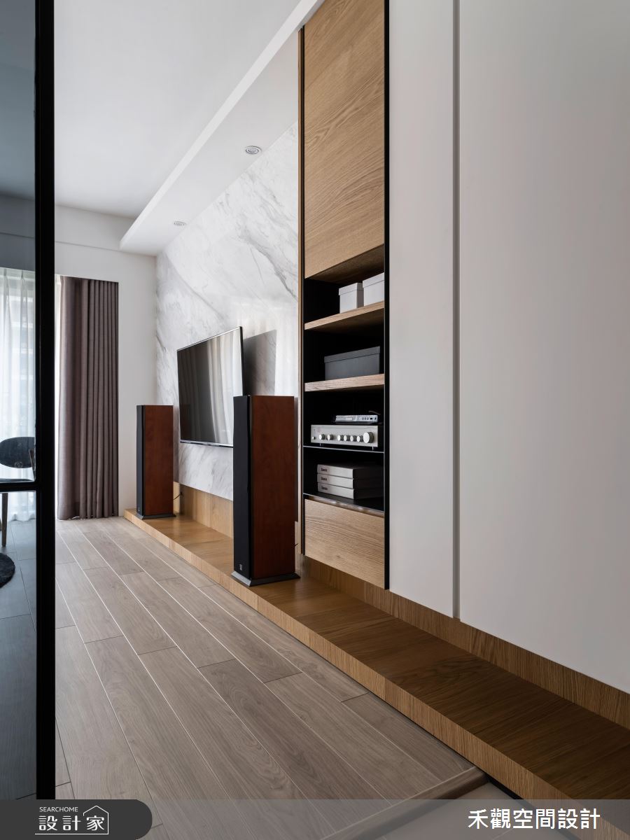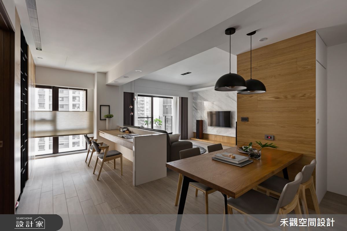 設計師選用白色打底,量體與櫃面則給予純淨木色鋪陳,勾勒優雅的生活視野,且選用銀狐大理石打造電視牆面,結合鏡面勾勒線條、櫃體挹注機能,形塑簡潔大方的立面表情;並藉由客廳、餐廳及書房的開放規劃,型塑光線與空氣的自在穿梭,讓公共領域成為充滿互動性的迎賓場合;並考量到屋主的收納需求,在進門的玄關區設計小型儲藏室,修改廚房格局、增設電器櫃及收納櫃,搭佐柔和溫暖的簡約場景,圍塑出機能十足的悠閒用餐氛圍;轉入臥房區,則運用內斂的淺灰作為床頭色彩,以不經意懸掛的黑白照片,成功帶出牆面的優雅姿態,替屋主打造出可充分紓壓的寧靜時光!