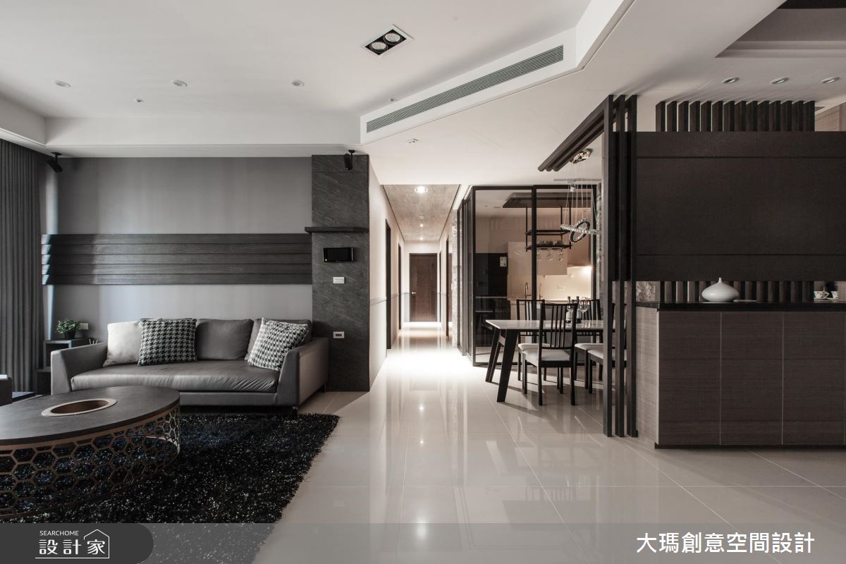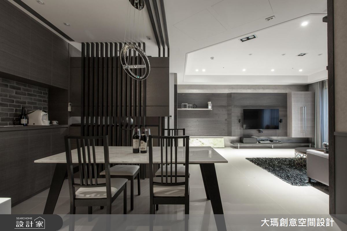 整體空間以黑、灰、褐色交織,適當安排色彩比例,並利用多元建材打造層次感,沉穩卻不顯老氣、沉重。入門處以右側大面積櫃體,以及結合格柵屏隔的雙面櫃作為收納與劃分玄關領域,更巧妙化解開門見灶的風水疑慮。公領域大部分採用鋼刷木皮結合石材,包含沒有多餘贅飾的造型電視主牆,僅以簡潔俐落的色彩搭配創造視覺層次。餐廳由延伸至天花的 L 型隔柵框設,提供充裕收納的餐櫃依據屋主需求,特別訂製專用酒架,讓屋主得以展示蒐藏。廚房以玻璃拉門隨時打造具有通透感卻不會使油煙溢散的烹飪空間,拉伸整體視野。串連公私領域的廊道以溫潤的木皮包覆,成為暖感十足的所在。臥室相對公領域,利用明亮的純白色彩,同時帶入摩登品味。