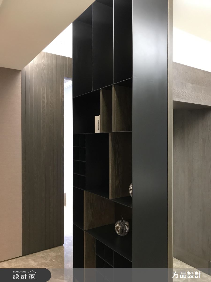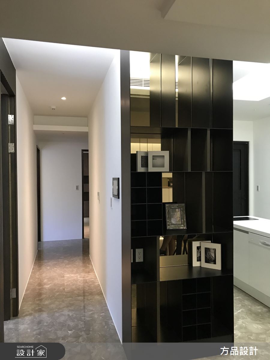 進門左側規劃機能櫃體,以不落地設計減輕量體給人的視覺壓迫,並一路銜接至淺色大理石電視牆,延展出俐落流暢的立面氣勢,同時於櫃體下方輔佐間接照明,運用天花降板、以及牆面線條的整合,進一步拉抬整體高度與空間感;色調上則選用黑白做出反差對比,彰顯俐落的都會特質,且藉由金屬吊燈、茶鏡等透亮材質妝點,作出黑、白之間的過渡,緩和色彩之間的強烈對比,並帶出時尚視感;餐廳旁則規劃開放展示櫃,左右分別劃分不同的生活動線,並於櫃體加入鏡面、燈光等形塑景深層次,搭佐屋主的收藏擺設品、打造注目焦點!