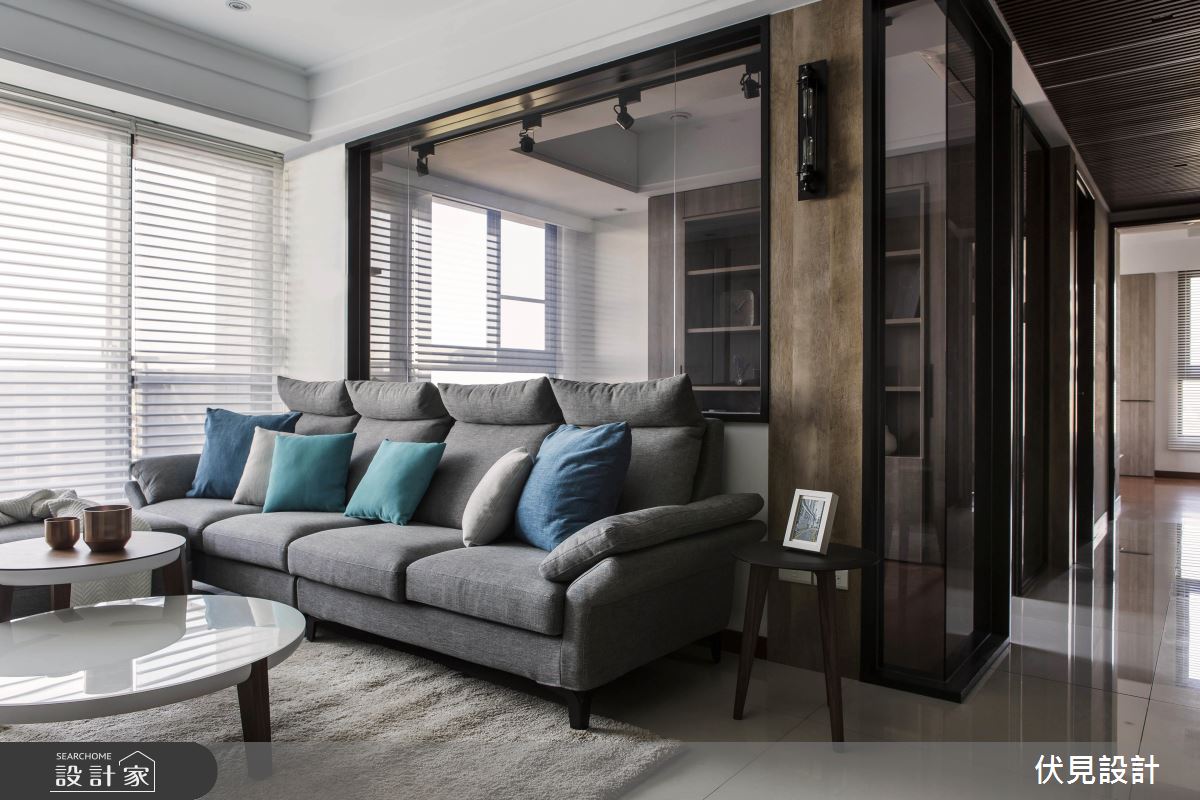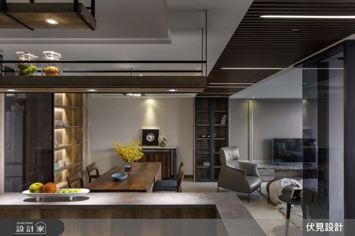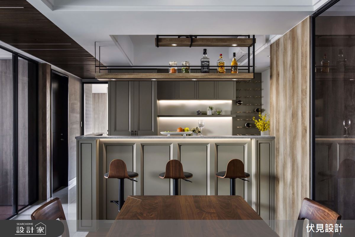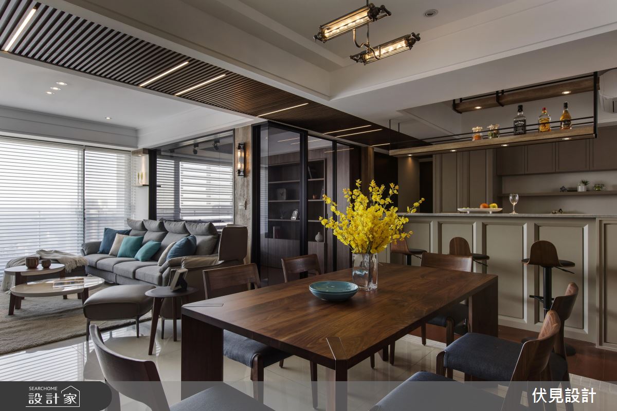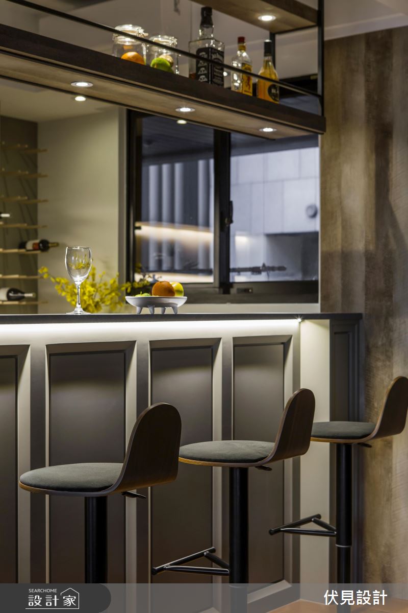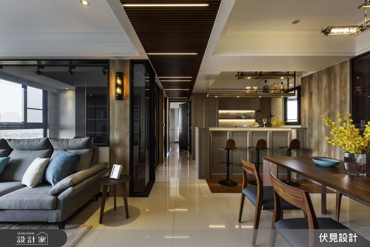 公共空間以灰色烤漆搭佐簡約線條,呈現簡單俐落的輕美式味道,且刻意妝點較為粗曠的木皮紋路,形塑溫潤帶有粗曠的質感,走道天花上則選用細緻的柚木格柵,並一路銜接至客廳的立面展示櫃,做出鮮明的動線指引;空間藉由大面積窗戶、柔紗窗簾導引採光,並刻意於書房區加入清玻璃隔間處理,促成場域之間採光、視線的自由流動;餐廚區則呈開放式設計,於吧檯上方加入鐵件展示吊架、挹注實用機能,亦利用沖孔板跟木棒、在吧檯後方位置規畫紅酒展示架,滿足男主人的藏酒置放,再搭配燈光的多元點綴,醞釀有如酒吧般的紓壓情境!
