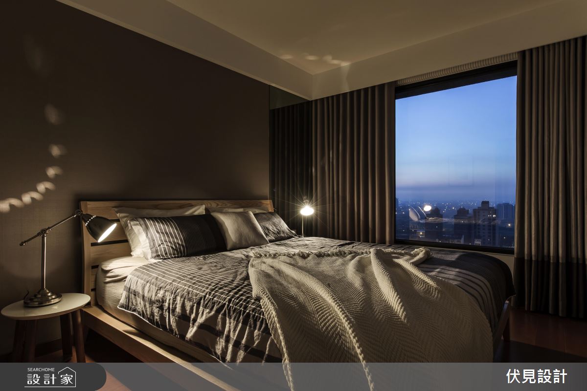主臥室在床頭側邊位置,巧思做出大面積的灰鏡,讓深色主調也顯得通透延展,締造更形放大的空間感,並將室外的景色照映入室,隨日夜變化出豐富的情境!