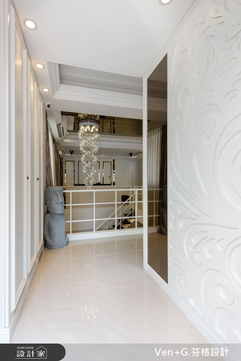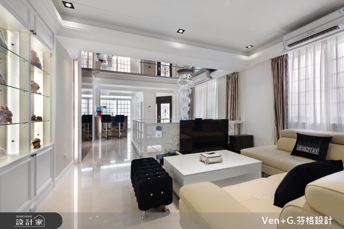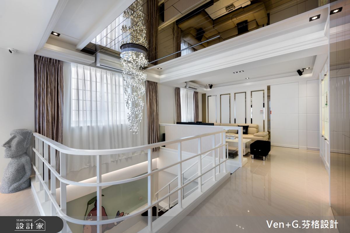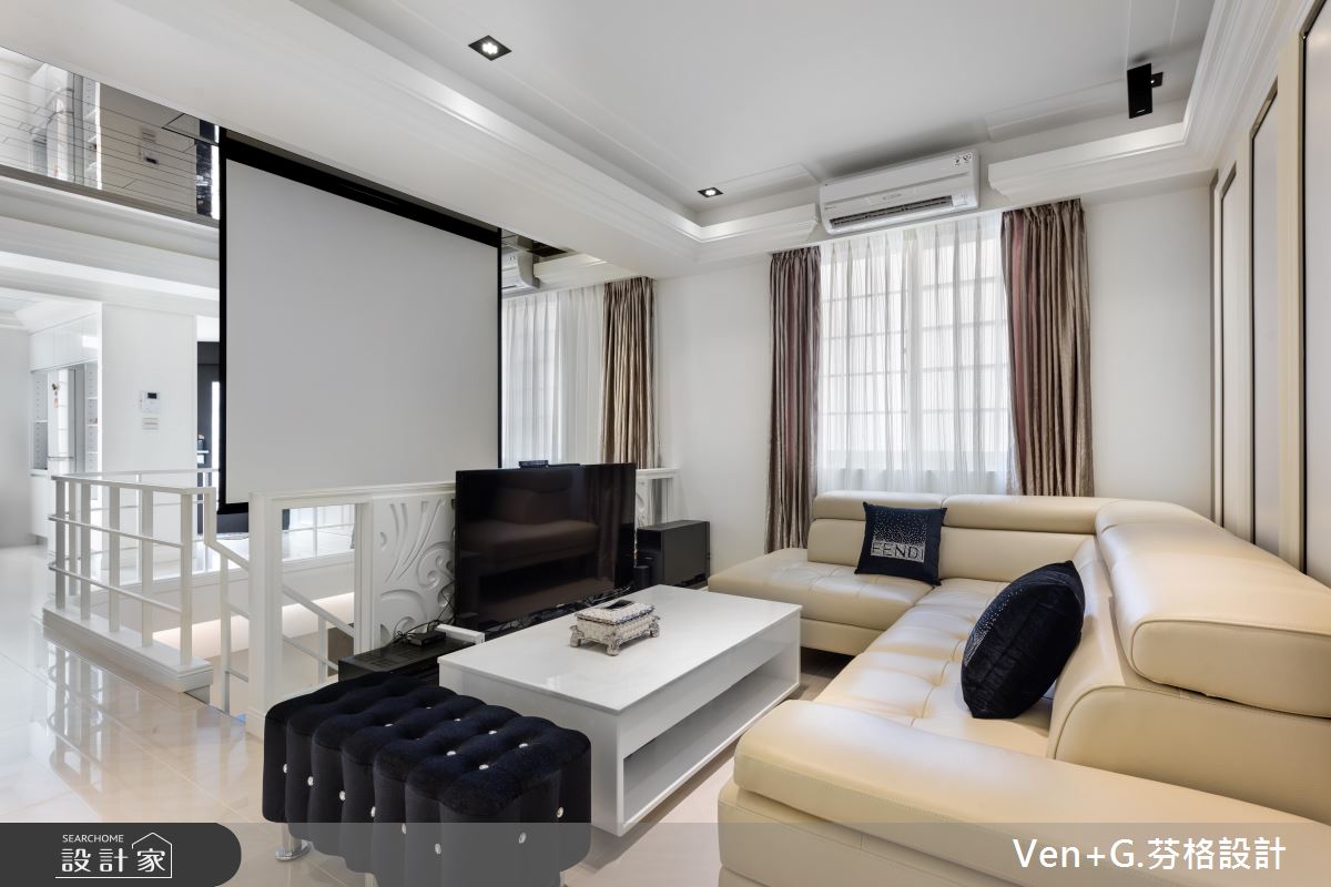 設計師透過精細的基礎工程解決壁癌、漏水並補強結構,為居住安全立基,並進一步利用雙面採光改善採光與通風問題。接著針對屋主的喜好,以奢華風格為主軸,打開 22 坪空間視野,營造宛如百坪風範的精品氛圍。設計師首先以純白色調為基底放大視覺感受,並利用天井概念串連一樓與地下室,並考慮級距、與深寬定製鐵梯,充分引入光線,打破陰濕幽暗的印象,讓單層空間向下延伸成為氣派樓中樓!為了打造開闊的無壓空間,抹除制式的電視牆面、加入天花鏡面,並結合下拉式投影幕,滿足家庭劇院需求。主臥床頭利用菱格紋繃布佐以 Tiffany 藍立體緹花壁飾,型塑富有高雅格調的新古典風格。