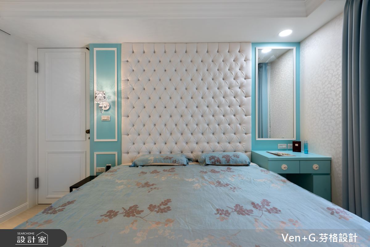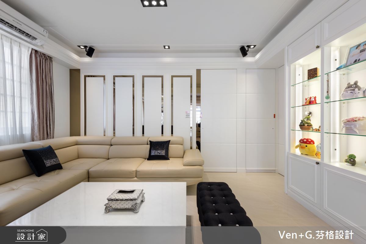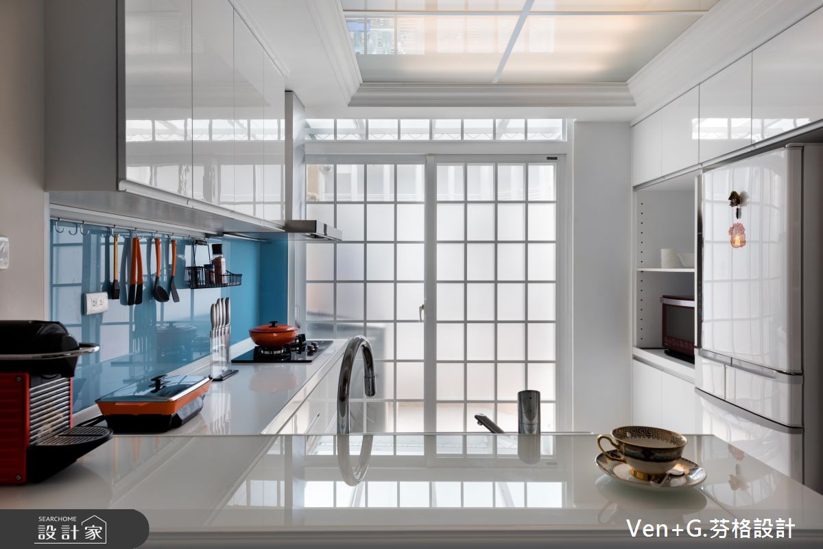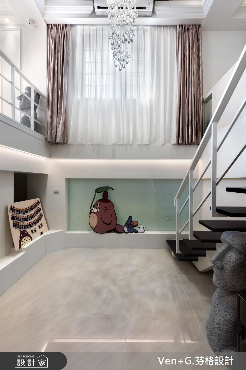 設計師透過精細的基礎工程解決壁癌、漏水並補強結構,為居住安全立基,並進一步利用雙面採光改善採光與通風問題。接著針對屋主的喜好,以奢華風格為主軸,打開 22 坪空間視野,營造宛如百坪風範的精品氛圍。設計師首先以純白色調為基底放大視覺感受,並利用天井概念串連一樓與地下室,並考慮級距、與深寬定製鐵梯,充分引入光線,打破陰濕幽暗的印象,讓單層空間向下延伸成為氣派樓中樓!為了打造開闊的無壓空間,抹除制式的電視牆面、加入天花鏡面,並結合下拉式投影幕,滿足家庭劇院需求。主臥床頭利用菱格紋繃布佐以 Tiffany 藍立體緹花壁飾,型塑富有高雅格調的新古典風格。