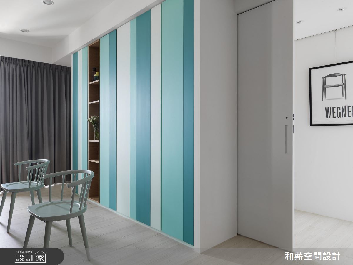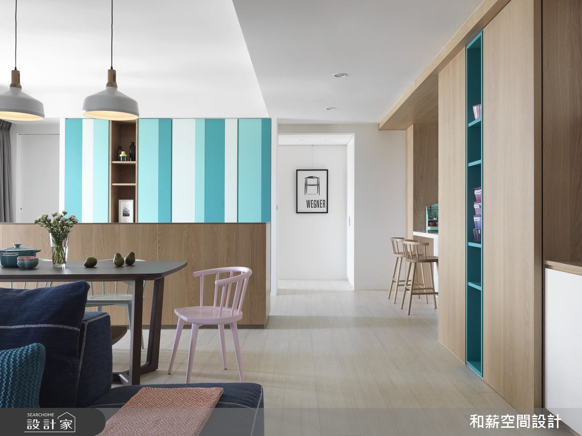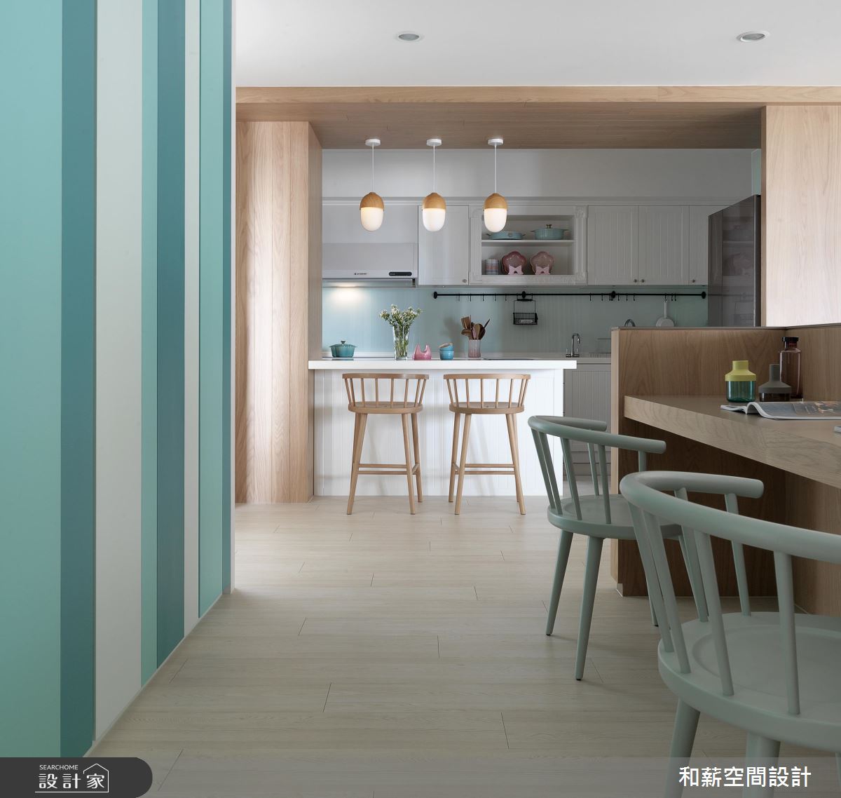 公領域內,將機能櫃體沿著牆面安排,並給予跳色主題,透過白色、淺色木作、藍綠色等相互交織,形構清新的色彩美學,搭配著窗外明亮採光的進駐,創造森林般的室內想像,同時讓公領域呈開放式設計,將書房納入廳區一部份,透過半開放隔間兼書桌來分化領域,保留光線、視線的通透性,並藉此讓書房後方的漸層藍綠色書櫃成為端景,化為空間的主題焦點;餐廚領域,除了規劃閒適的開放吧檯,亦以木作包覆柱體與天花,框塑出溫潤的用餐氛圍,並懸吊三盞造型栗子燈,帶出可愛的童趣;寢臥內,則在床頭加入充實機能,以上層封閉式收納櫃結合中段展示平台,搭佐隱約的光源照明,在大地色、白色的合宜比例之中,開啟最為舒適的休寢情境!