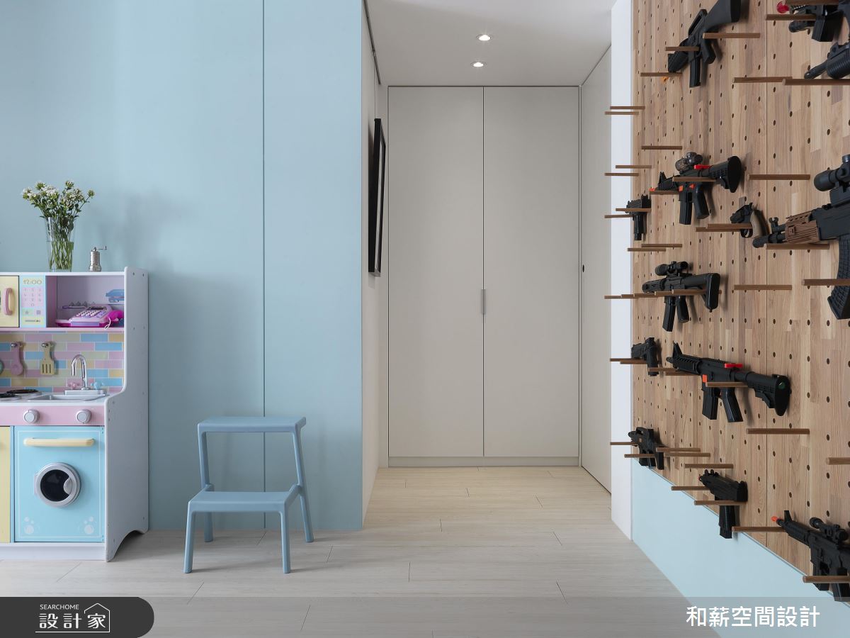 小孩遊戲區於牆面規劃了洞洞板牆,可順應玩具槍的尺寸隨意調整,不僅作出良好收納,也替孩子打造出小小的迷你軍火庫!