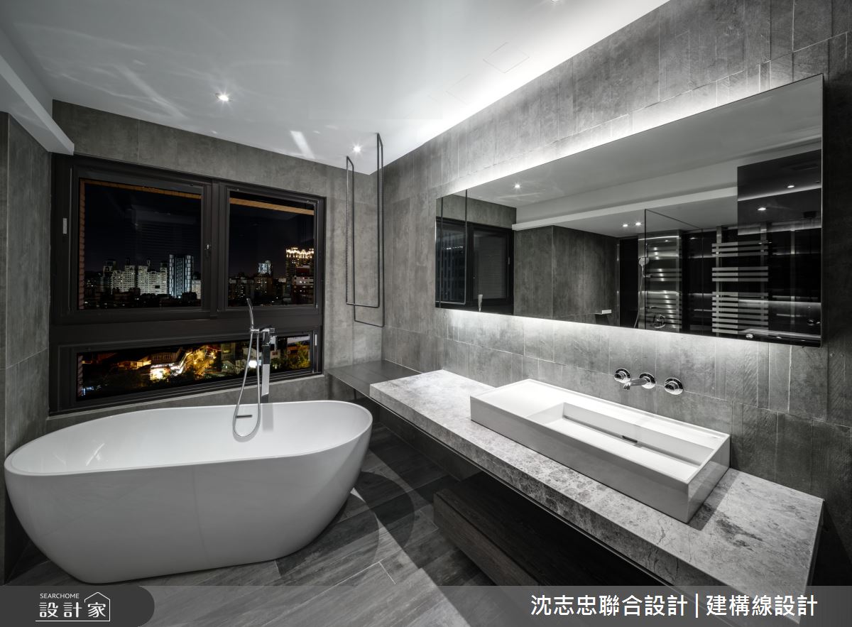 衛浴內配置白色的獨立浴缸,並以簡約的毛巾架帶出陽剛特色,同時打造不落地洗手台,讓整體雖大器磅礡、但卻不致沉重壓迫,彰顯輕量化的安定感受!