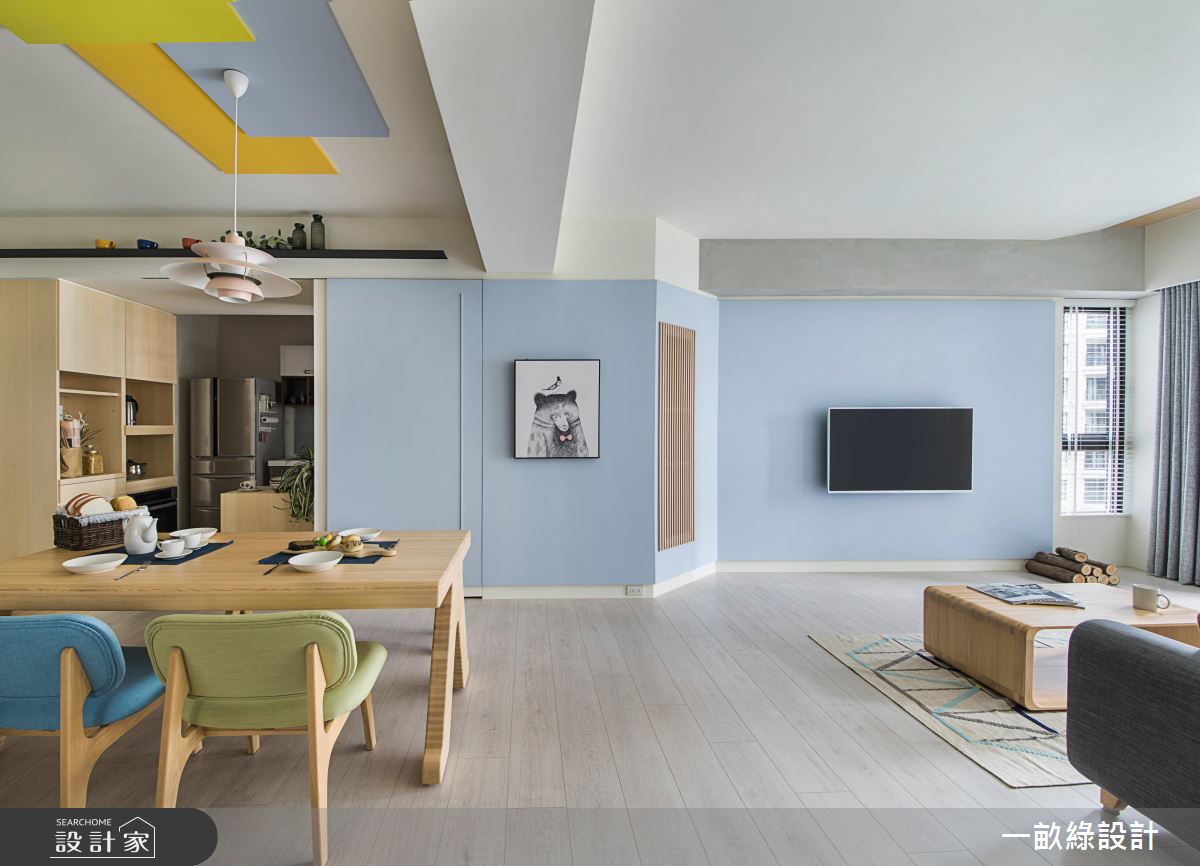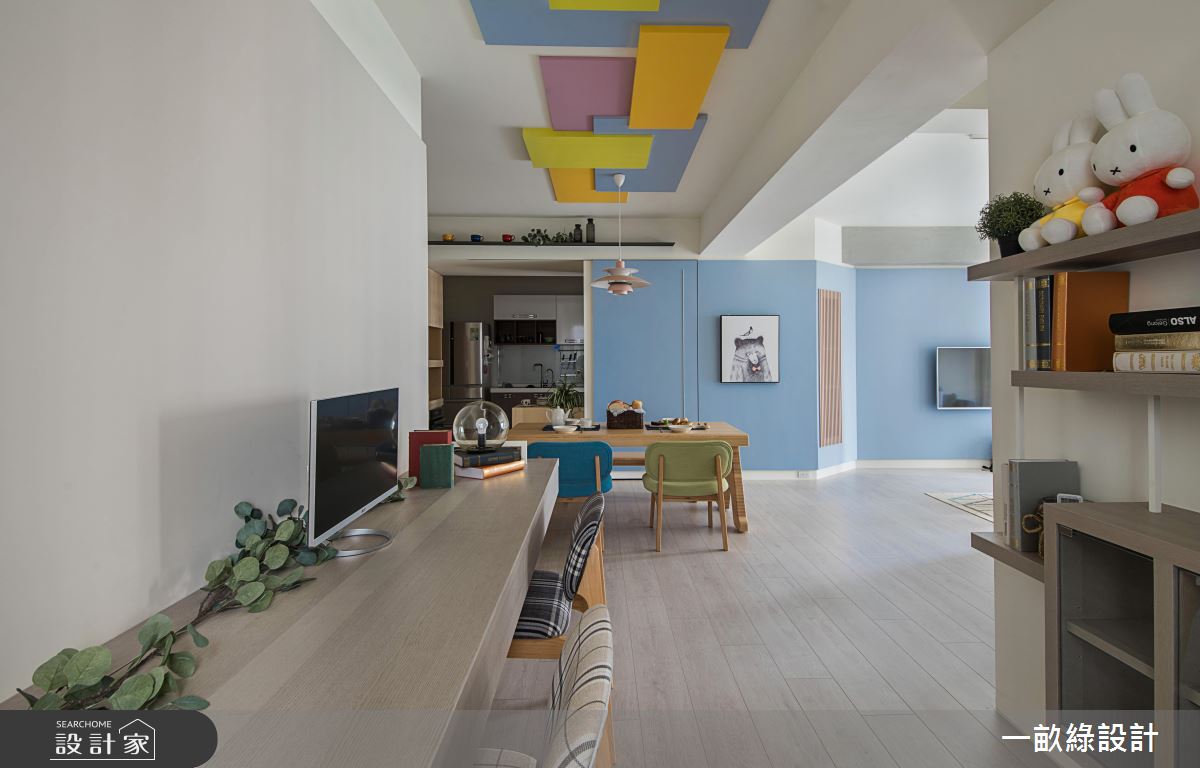 以溫雅的淡藍色作為空間的主視覺,並隱藏了大量的收納儲物區,設計師透過格局的整併,為公共領域納入了客、餐廳機能,而廚房、書房則以半開放式的形式,保有生活的互動和獨立性,餐廳處天花板運用彩色方格的造型層次堆疊,一路延續至書房空間,成為最繽紛亮麗的動線指引。書房區以輕盈的檯面設計取代一般的家具桌椅等配置,讓書房的使用空間可以更加放大,增加坪數效益。主臥室具有相當明亮的採光,床頭處同樣以蝴蝶壁飾和客廳相互呼應,並加入清爽的蔚藍色,彷彿蝴蝶們在天空中優雅地翩然起舞。