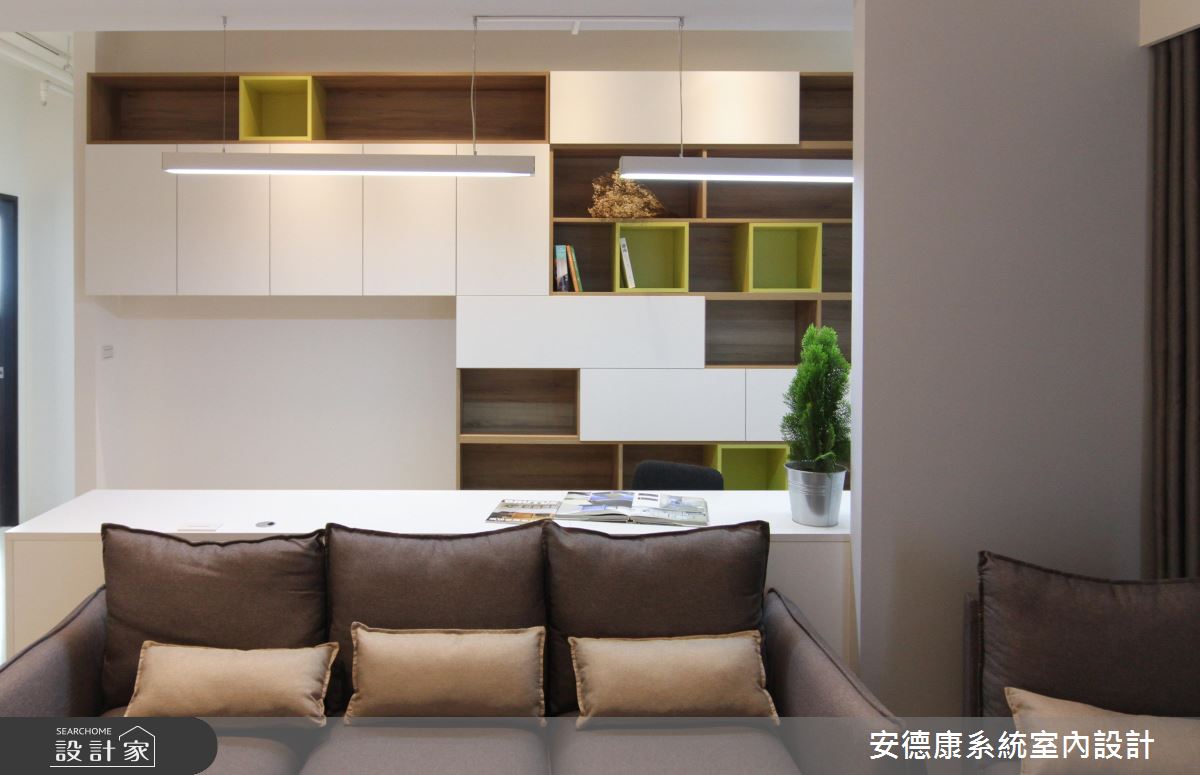 居家引用適切留白的設計手法,保留簡潔概念,捨棄過於繁複的設計,大膽使用全白素色板,以家具櫃體定調風格,營造輕盈的居家本質,並在素雅的空間基底中,利用書牆顏色做出跳色變化,以木皮、白色、蘋果綠展現色彩層次,同時加入植栽的綠意點綴、佐大面積窗戶導引明亮採光,構築清新生動的生活質感;再藉由開放式格局手法,破除書房與客廳之間的隔閡,以一面充滿裝飾性的書牆造型凝聚焦點,不僅提供收納展示機能,亦成就整個空間的端景畫面,搭襯內斂的燈光設計,將居宅整體提點得更為輕盈!