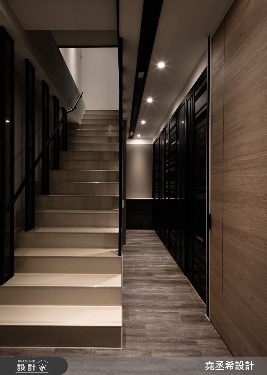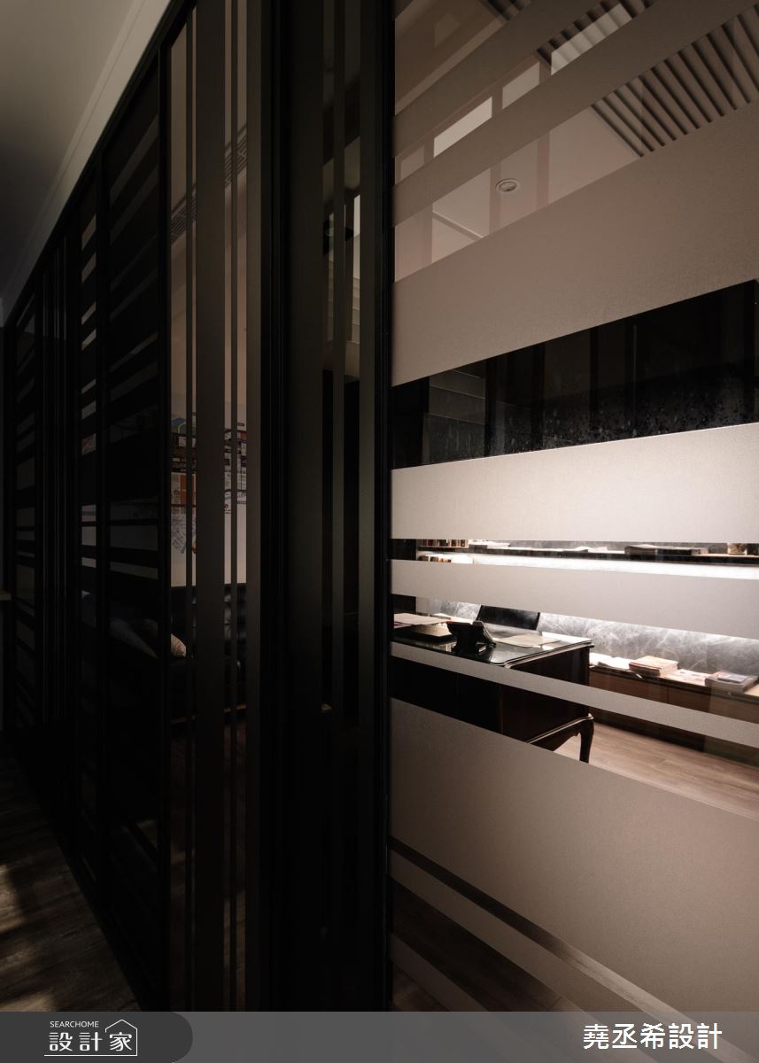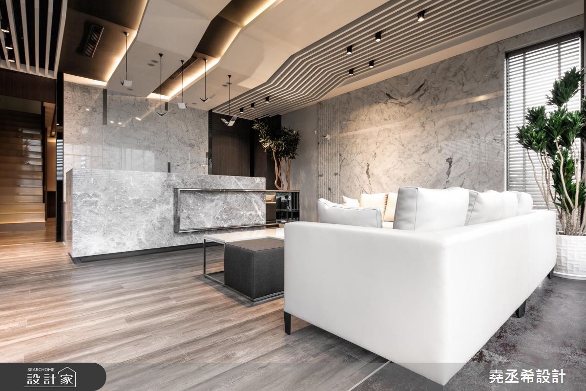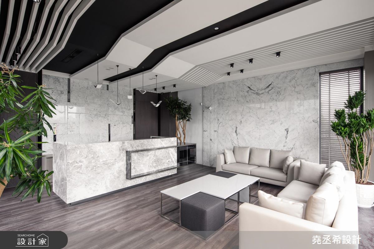 一樓前區大廳,作為接待櫃檯跟會計人員的工作辦公區,整體以天花線性結構作為特色,不僅充滿視覺延展性,亦達成延伸導引視線的作用,搭配燈光的挹注,促成空間光影的豐富層次,且在周邊立面配置百葉窗、統整牆面線條,搭配大理石的大面積使用,加以細緻的溝縫處裡,型塑大器端莊的迎賓場域;而櫃檯更有如一座時尚的中島吧檯,以不鏽鋼、大理石為媒材,佐以極簡的造型修飾,塑造量體的輕質印象,美感與機能兼具;而進出動線則運用暗門設計,安置於櫃檯的後方,可通往二樓的董事長、總經理辦公室,辦公室外部以黑色作為主調,結合局部霧面玻璃營造隱密性,有別於一般制式而冰冷的辦公間,帶出高端與奢華的氣質!