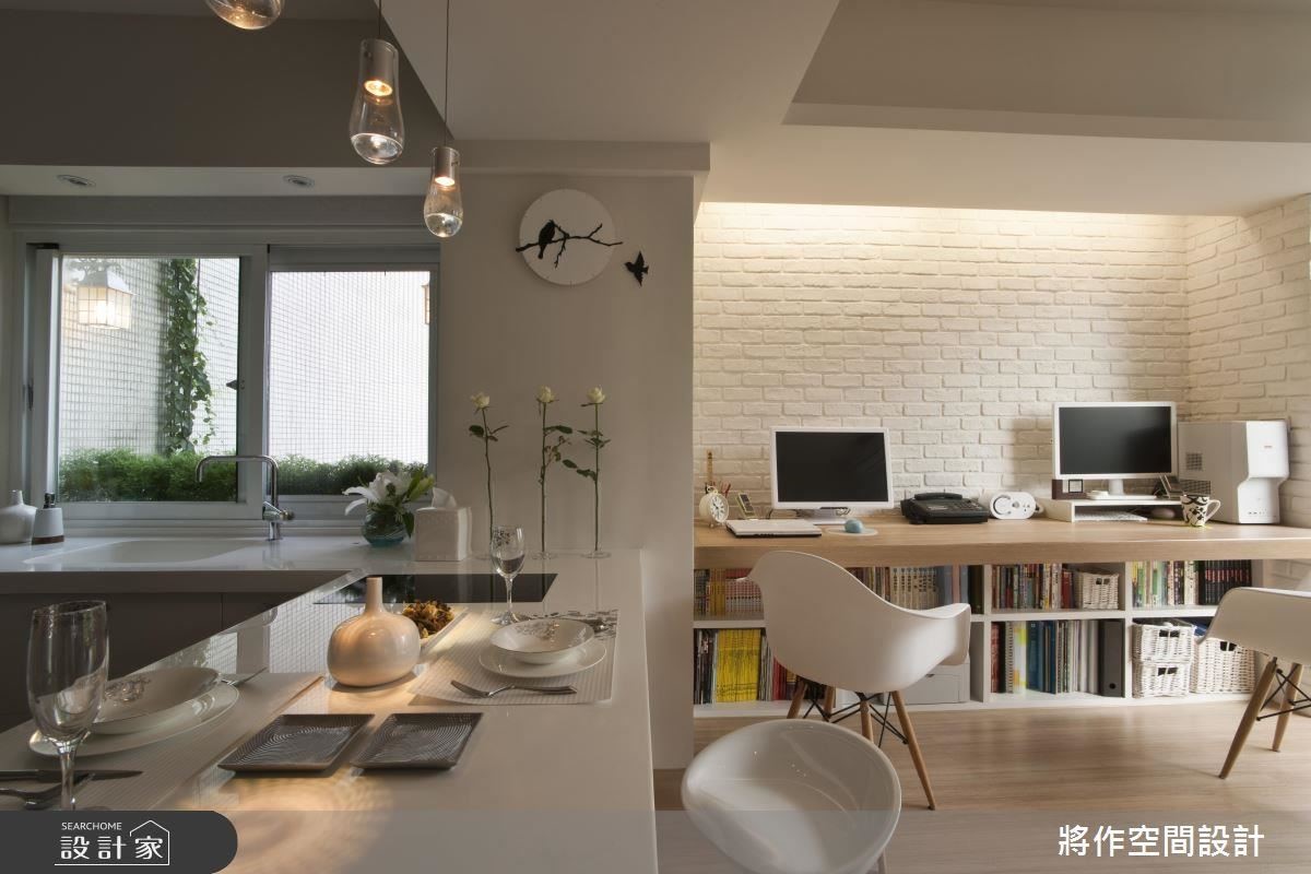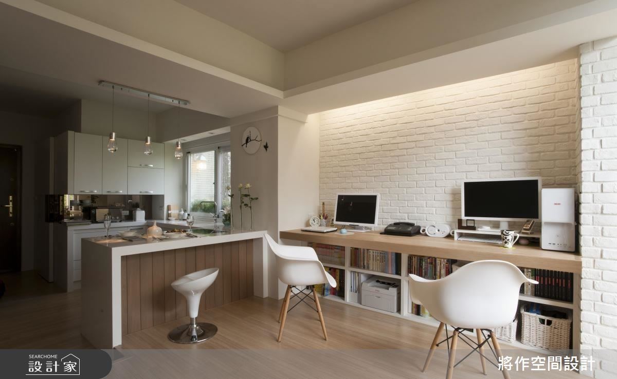 設計師講究天花板高度調整,提升居住感受與質感,除了為隱藏照明管線而設的天花板之外,書房位置因為地板高度調升,在此選擇還原房子本身的高度,以一盞別具特色的吊燈界定空間屬性,居室更加溫暖宜人。選擇白色為背景,無形中產生放大整體的視覺感受,隨著添入各式物品,白色主調也成為銜接空間各位置的軸線。