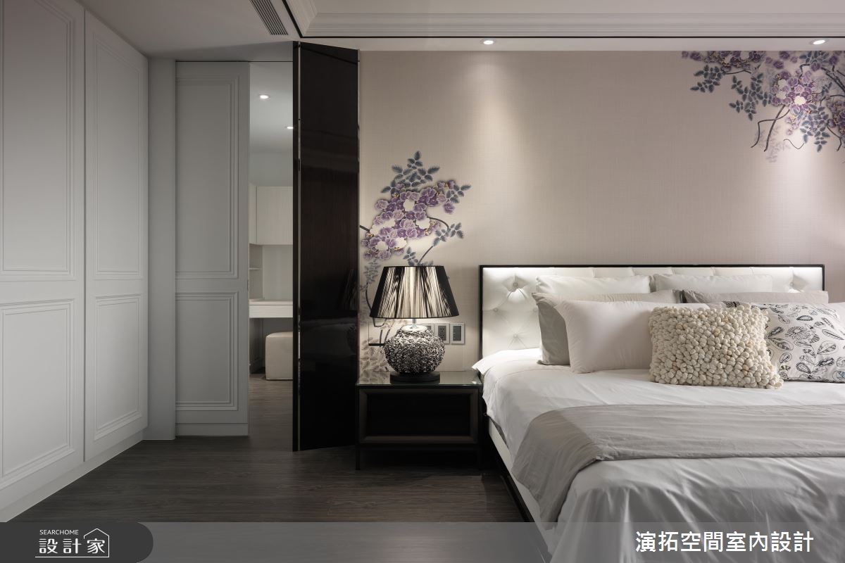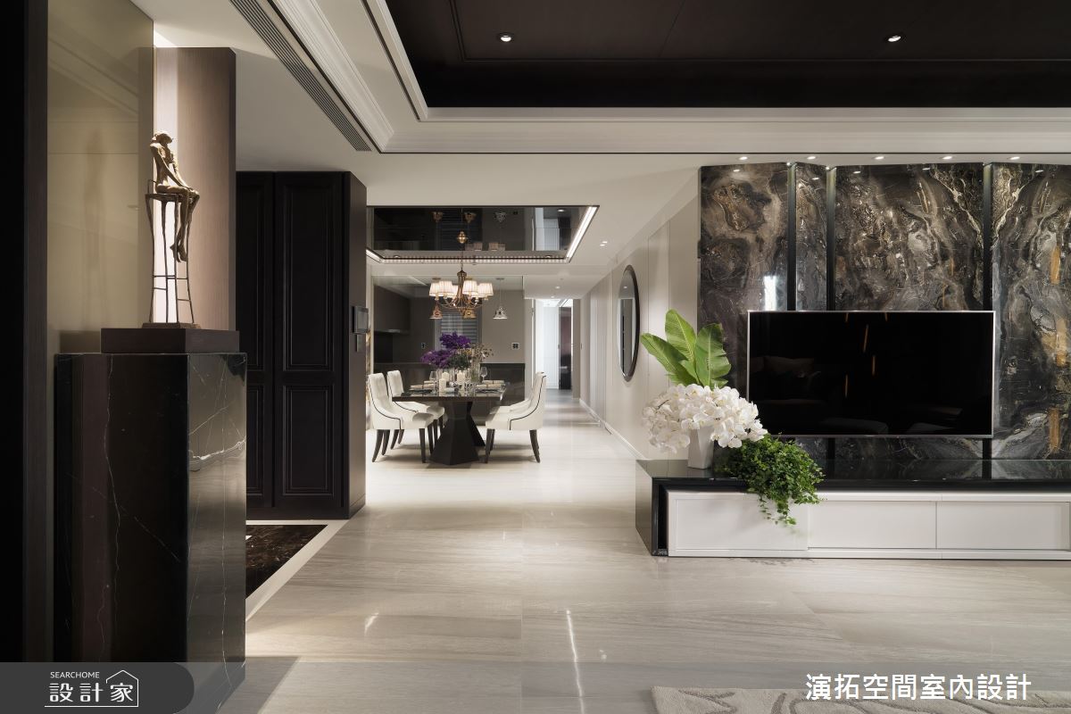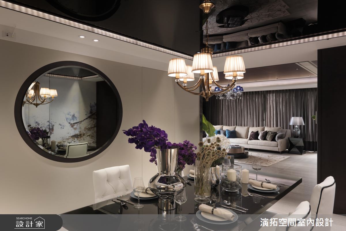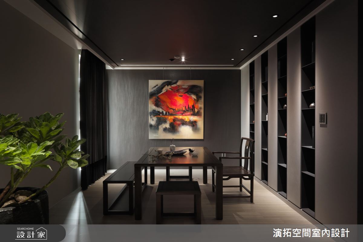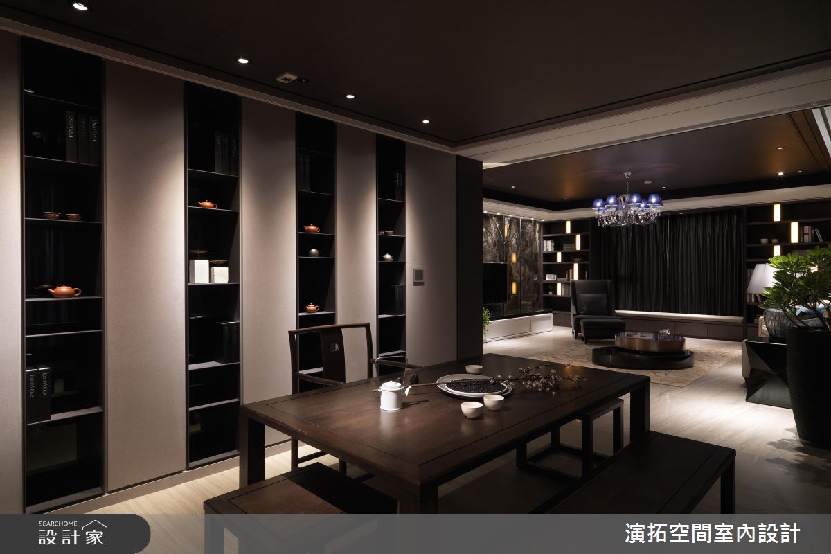 整體運用現代氣息提點東方人文,並讓圓弧、方正語彙相輔相成,勾勒中式意涵的優雅表現,同時選用深色的布藝及大理石,甚至木紋也刻意壓重色調,展現廳區的悠遠之美,搭佐牆面及天花的燈光挹注,適時提點輕盈感,開拓穩重而不壓迫的視野;茶室空間內,透過牆面掛畫型塑焦點,深化場域的立體架構,周邊結合屋主蒐集的茶甕、器皿等,讓整體設計與茶道精神合而為一;餐廳區,則在牆面作出圓型鏡面設計,型構中式圓窗的趣味表現,搭配充滿西方簡潔線條的餐桌椅與吊燈,帶入中西並陳的感官體驗 ;寢臥內,加入線板的修飾,並將通往更衣間的開口整合於立面,床頭處則妝點繽紛花卉圖案,讓臥房瀰漫清新自然的視覺感受!