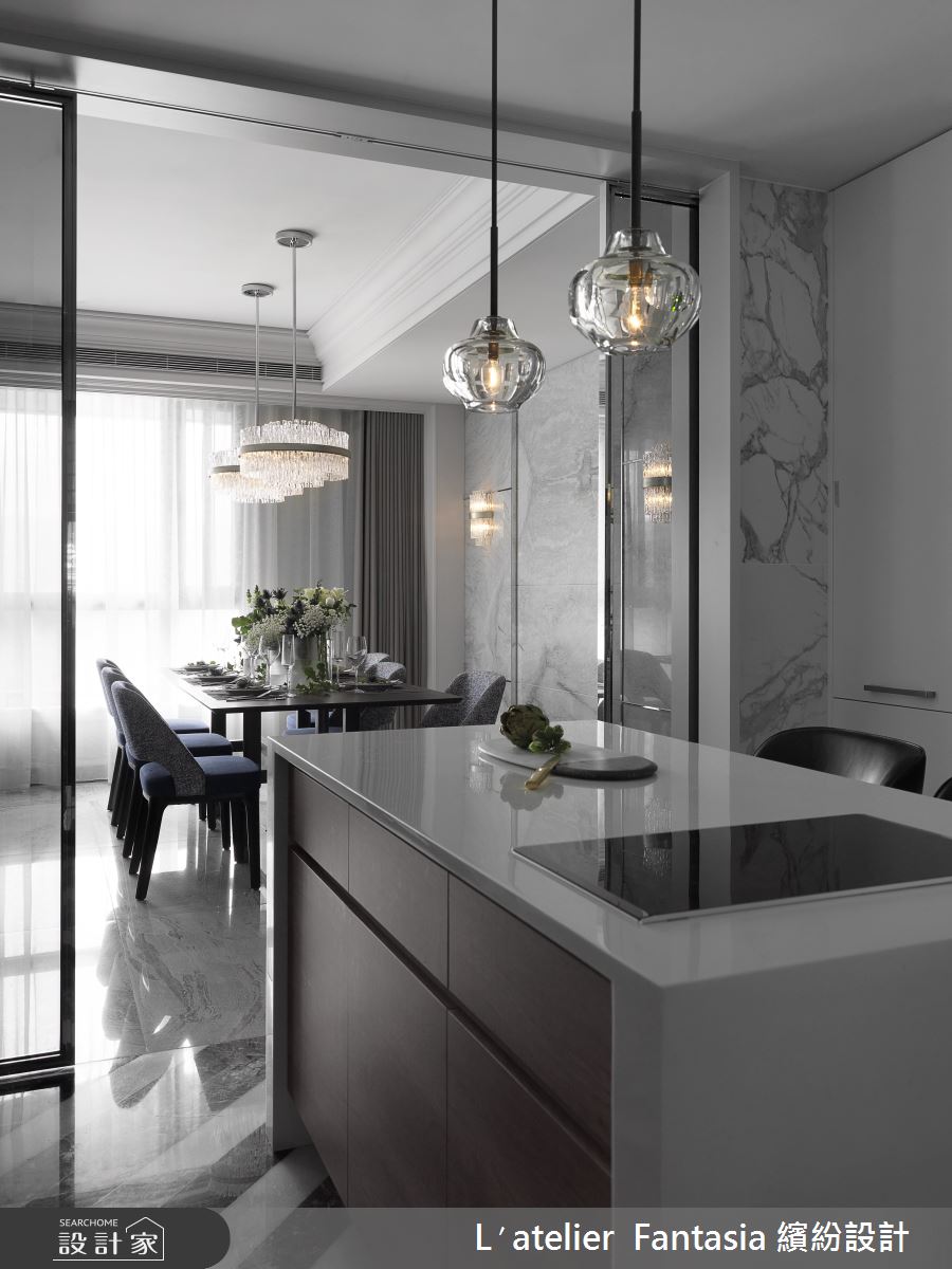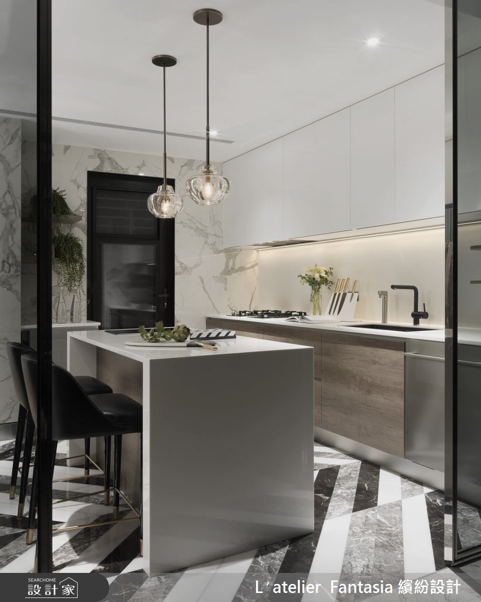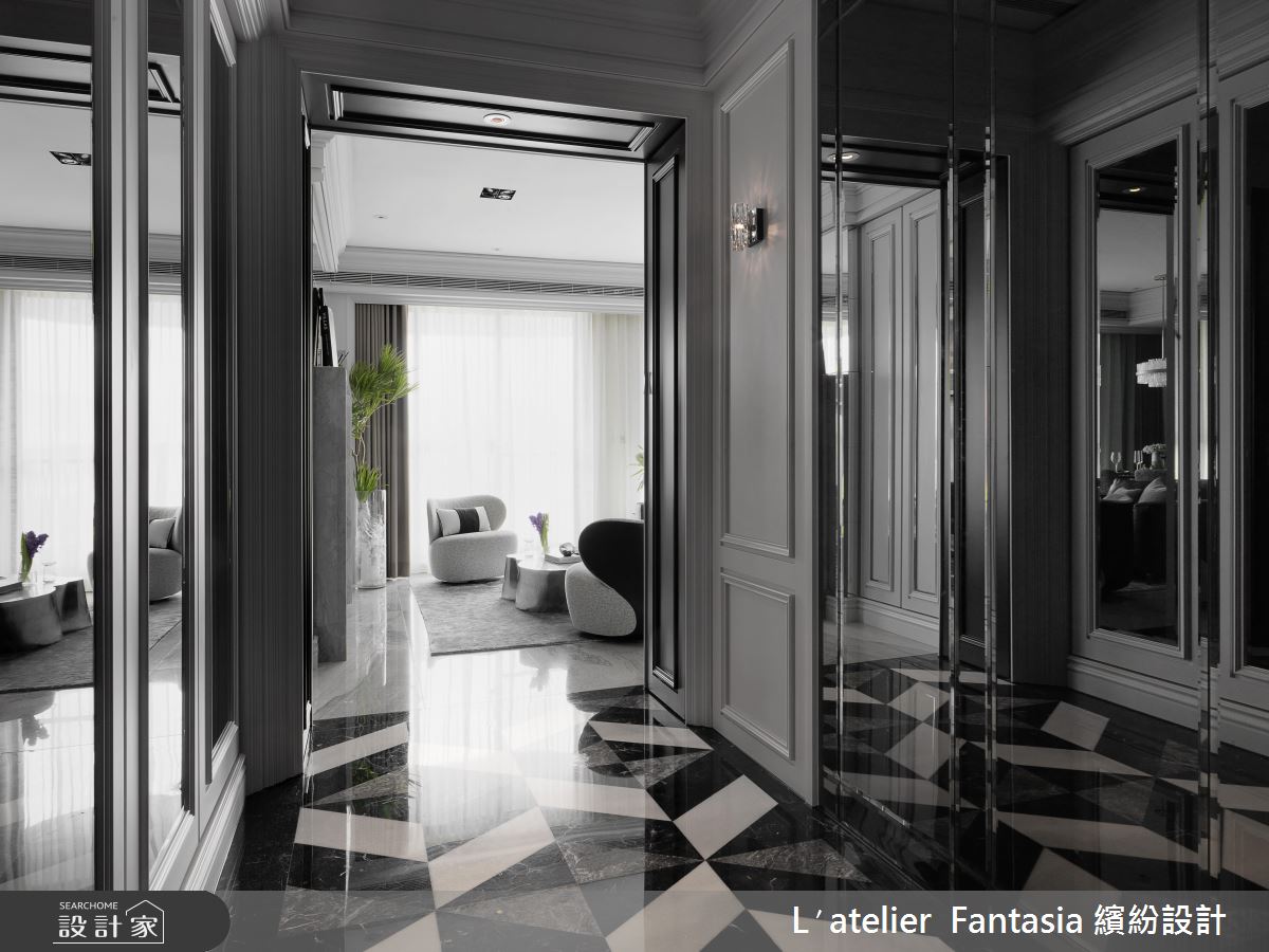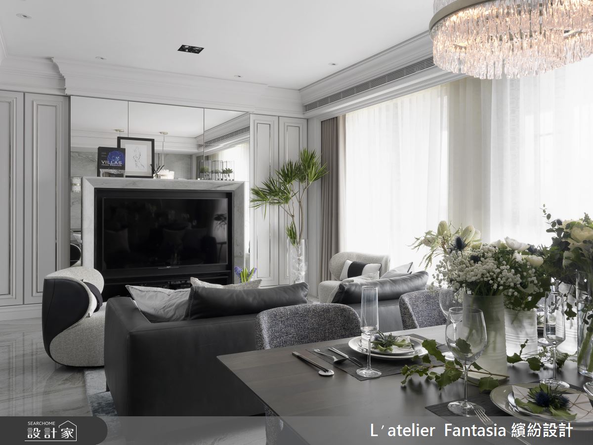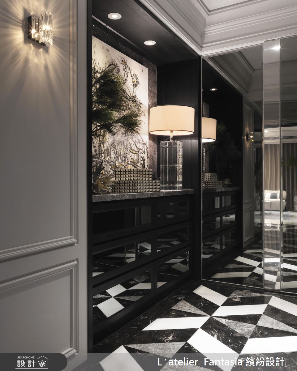 玄關以大量鏡面佐以拼花地坪,予人簡練中不失華麗的貴族格調,公領域將客廳與餐廳前後配置,電視牆以精緻的線板櫃門結合鏡面,餐廳背牆則以大著雲絲肌理的大理石材質達成現代與古典間的平衡。就色彩搭配而言,從入門處至公共空間,無論是軟件、家具或建材,皆以比例穠纖合度的黑、白、灰三色構築,當中更精巧的利用水晶燈飾與大量翠綠植栽點綴,完成沉穩氣派且精緻度十足的居家端景。獨立廚房以灰鏡串連與餐廳的動線,並在廚房中央放置附有烹調功能的中島吧檯,更別出心裁的利用三色石材拼貼出人字拼地坪。私領域依據需求量身訂製,長輩房以溫柔色調搭配線板、水晶燈打造溫馨質感兼具的舒眠空間。