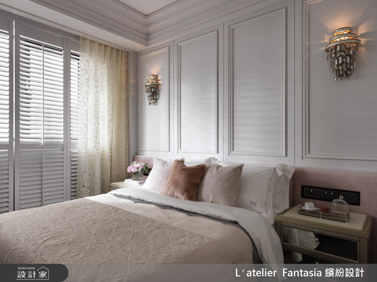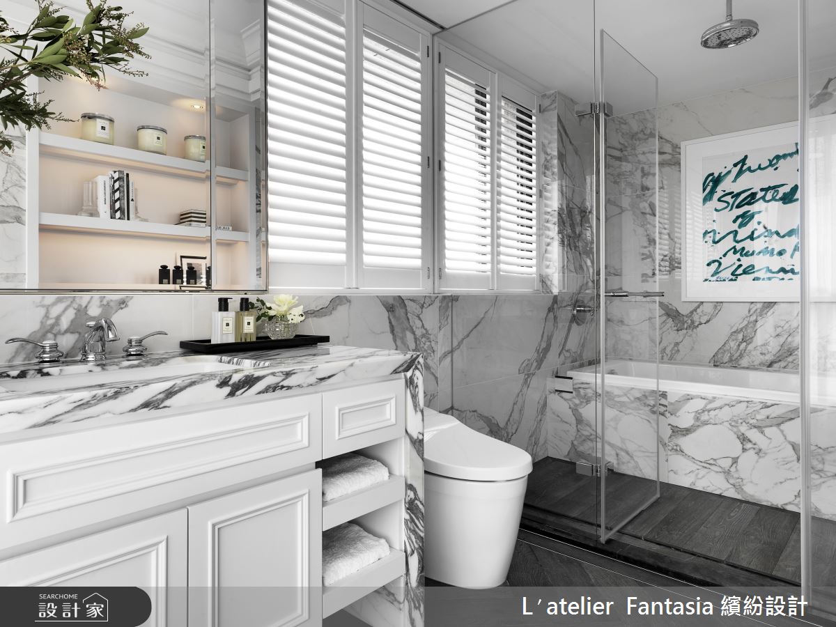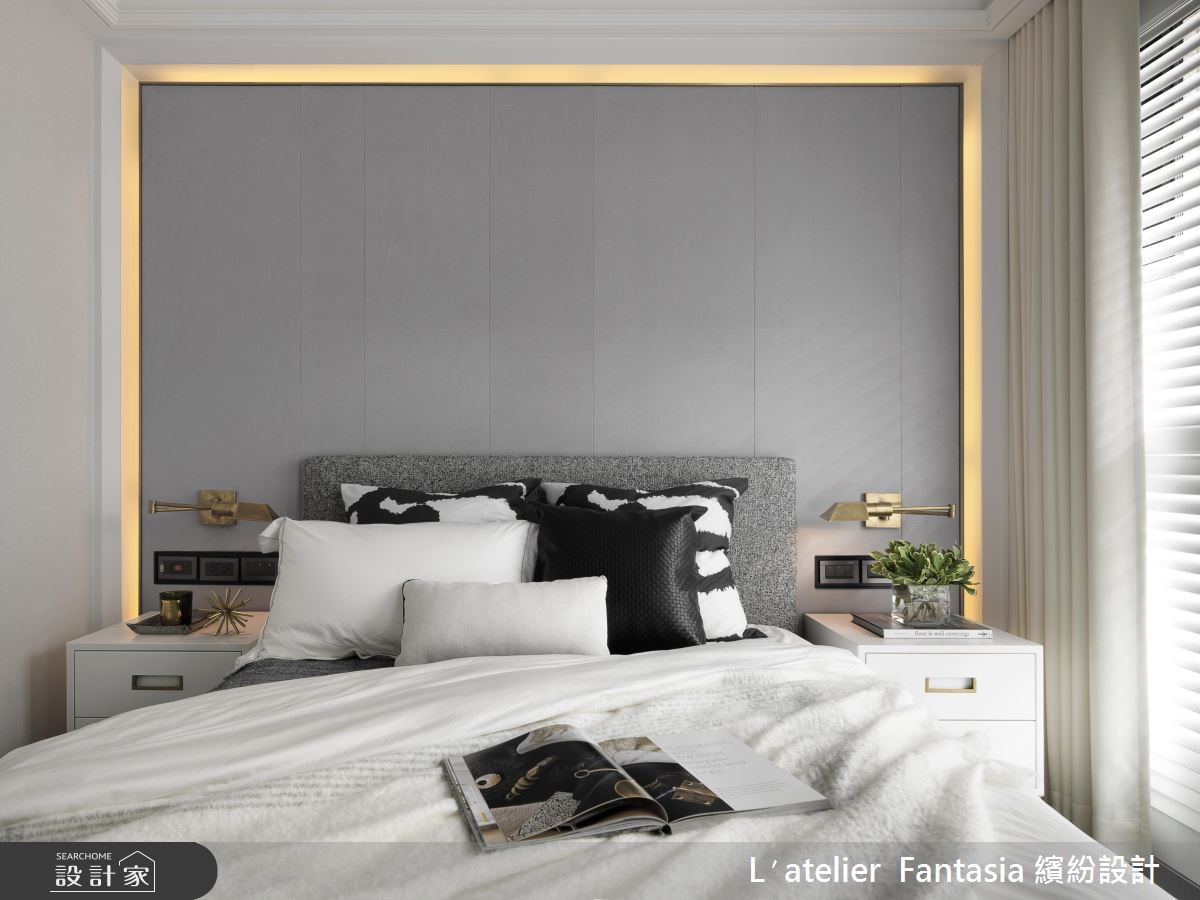 針對主臥,由於屋主職業為旅行社老闆,為了打造飯店式設計,以間接照明與金屬燈飾設計床頭壁板,注入五星級質感。主浴善用優良採光與大理石結合,宛如身處歐式豪宅。