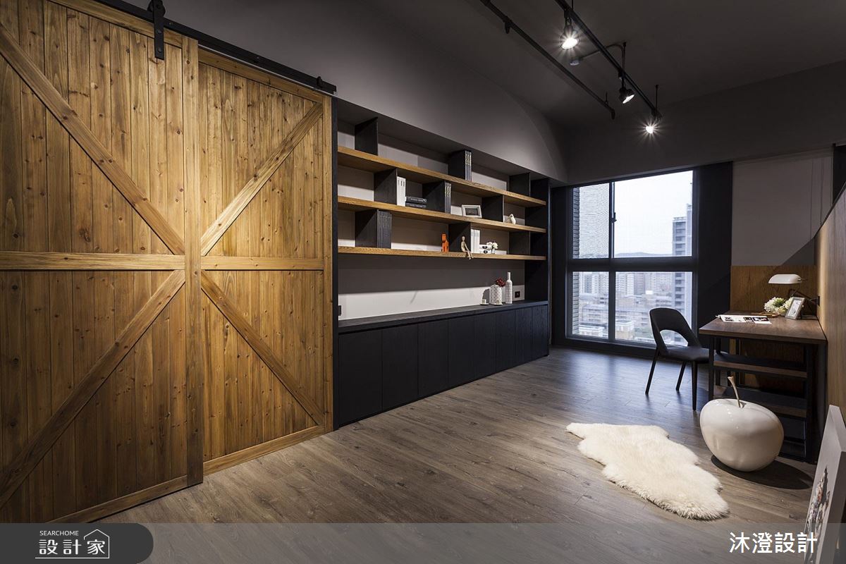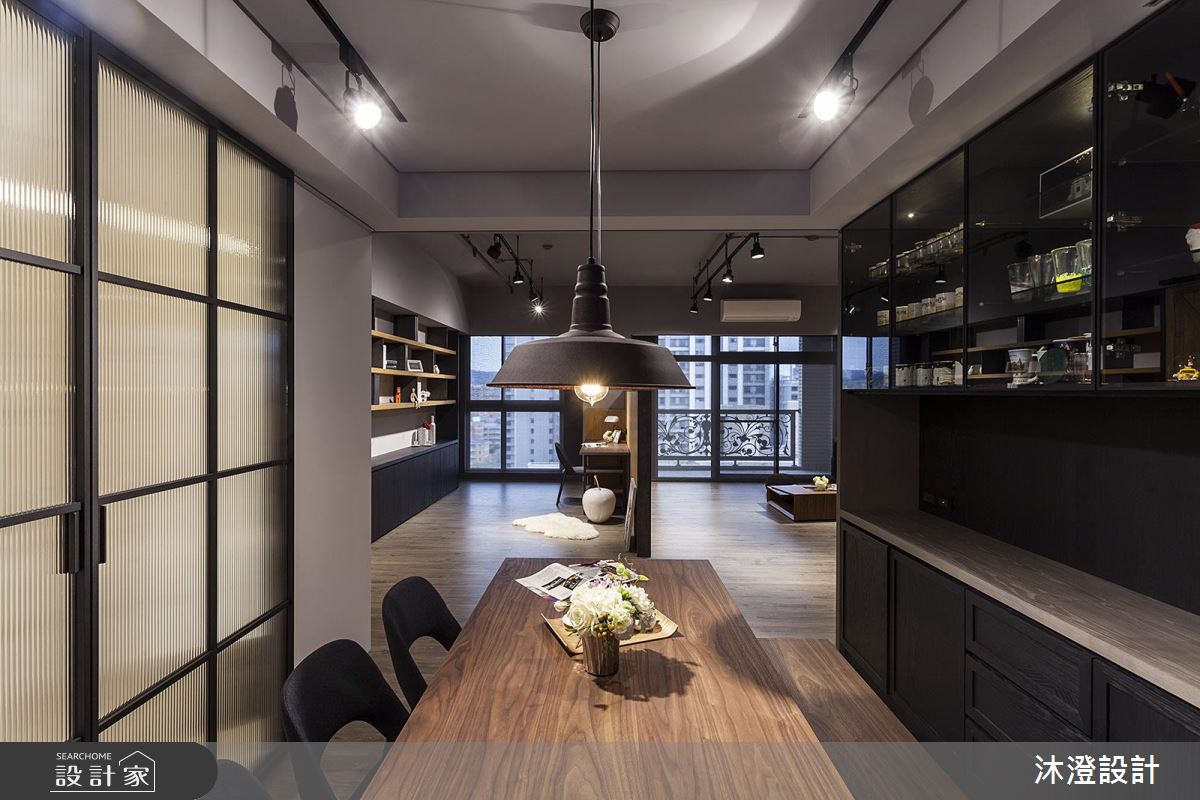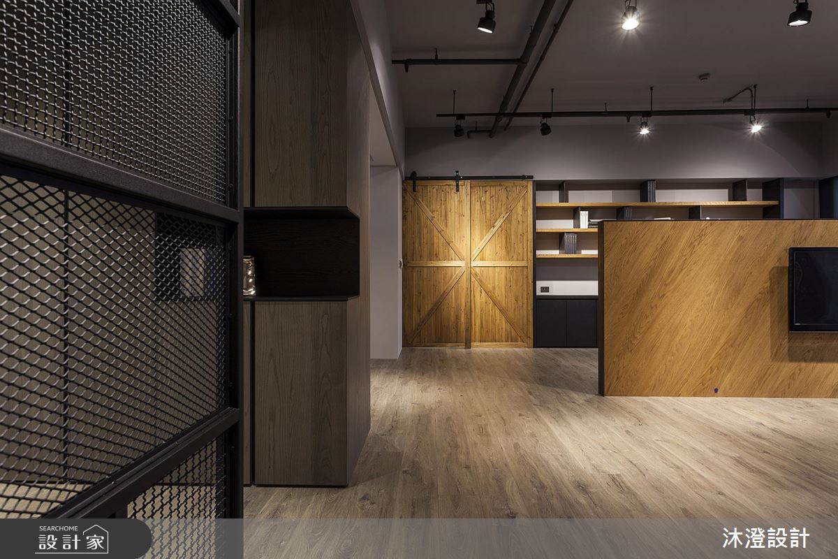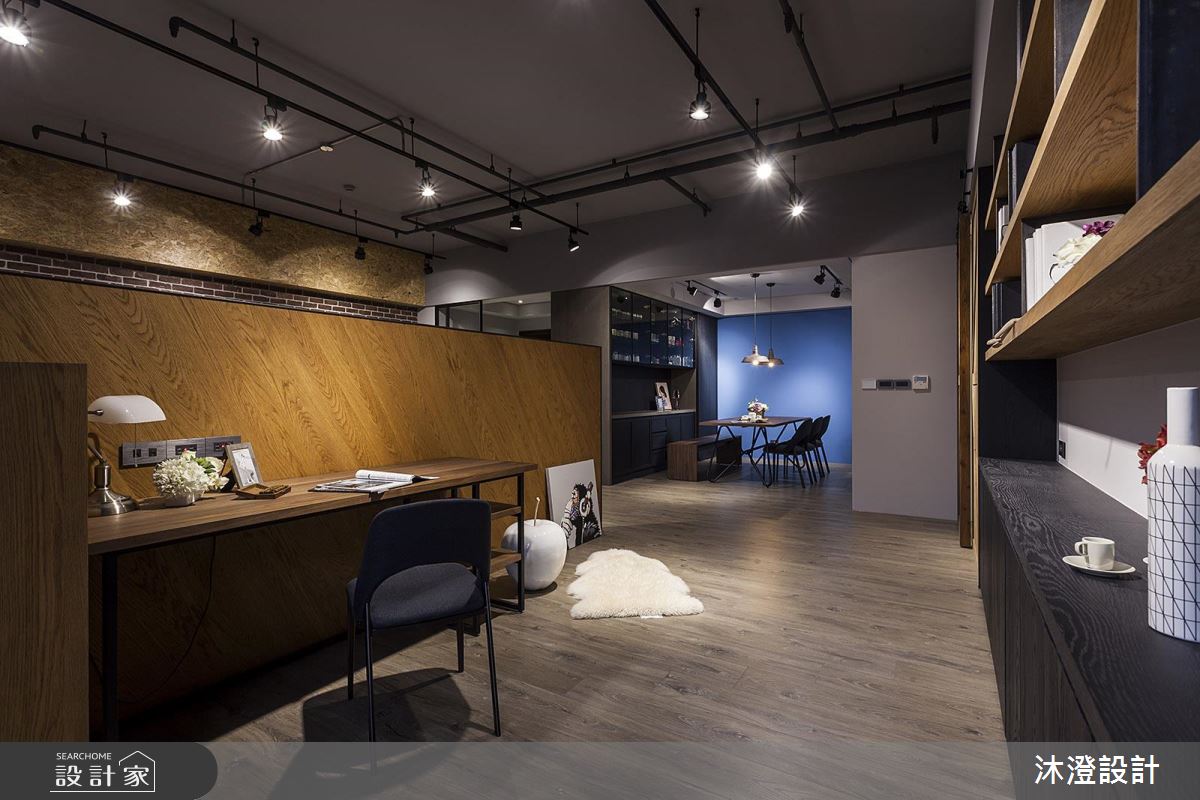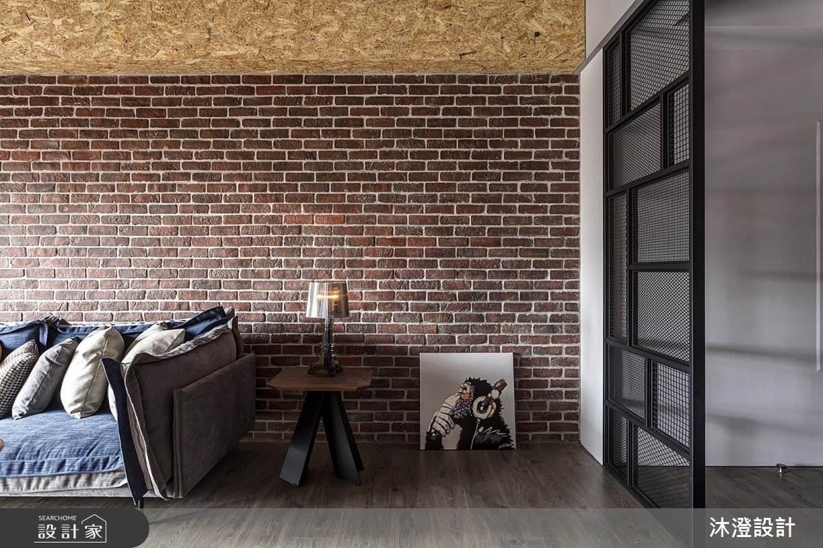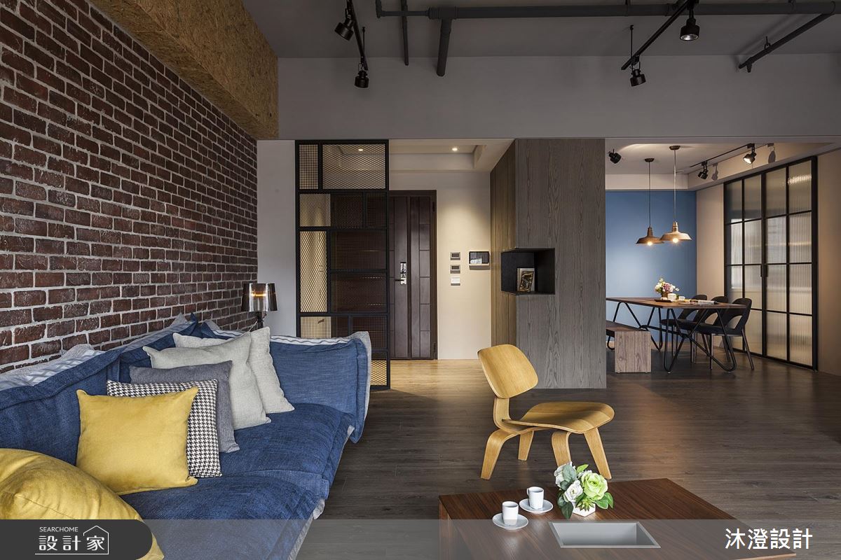進入居家,強烈的風格迎面而來,以網狀鐵件作為玄關隔屏,將界定機能結合金屬的剛硬表現,演繹性格十足的視覺風景;公共廳區內,以木地板鋪陳全室,採用輕盈的淺灰色妝點牆面,並運用紅磚牆作為空間主景,包覆整道沙發立面,創造復古舒適的工業美感;同時讓電視半牆兼作書房隔間,同步互通兩方場域採光,締造互動的生活場景,後方書櫃更連結穀倉門造型,發揮 Loft 風的道地精神;餐廳則在一整面藍色牆面中帶出海洋氣息,凝聚沉穩靜謐的氛圍,一側配置立體直紋玻璃門片,輕盈地將餐廚作出區劃,維持視覺與光線的穿透,型塑恰到好處的場域明亮度!