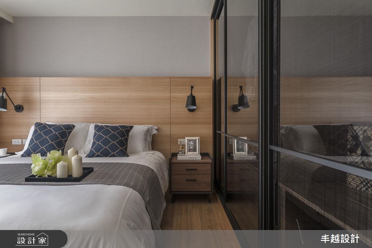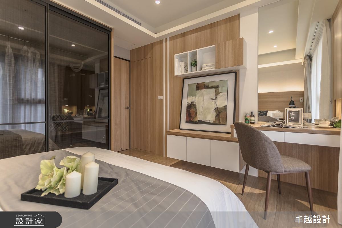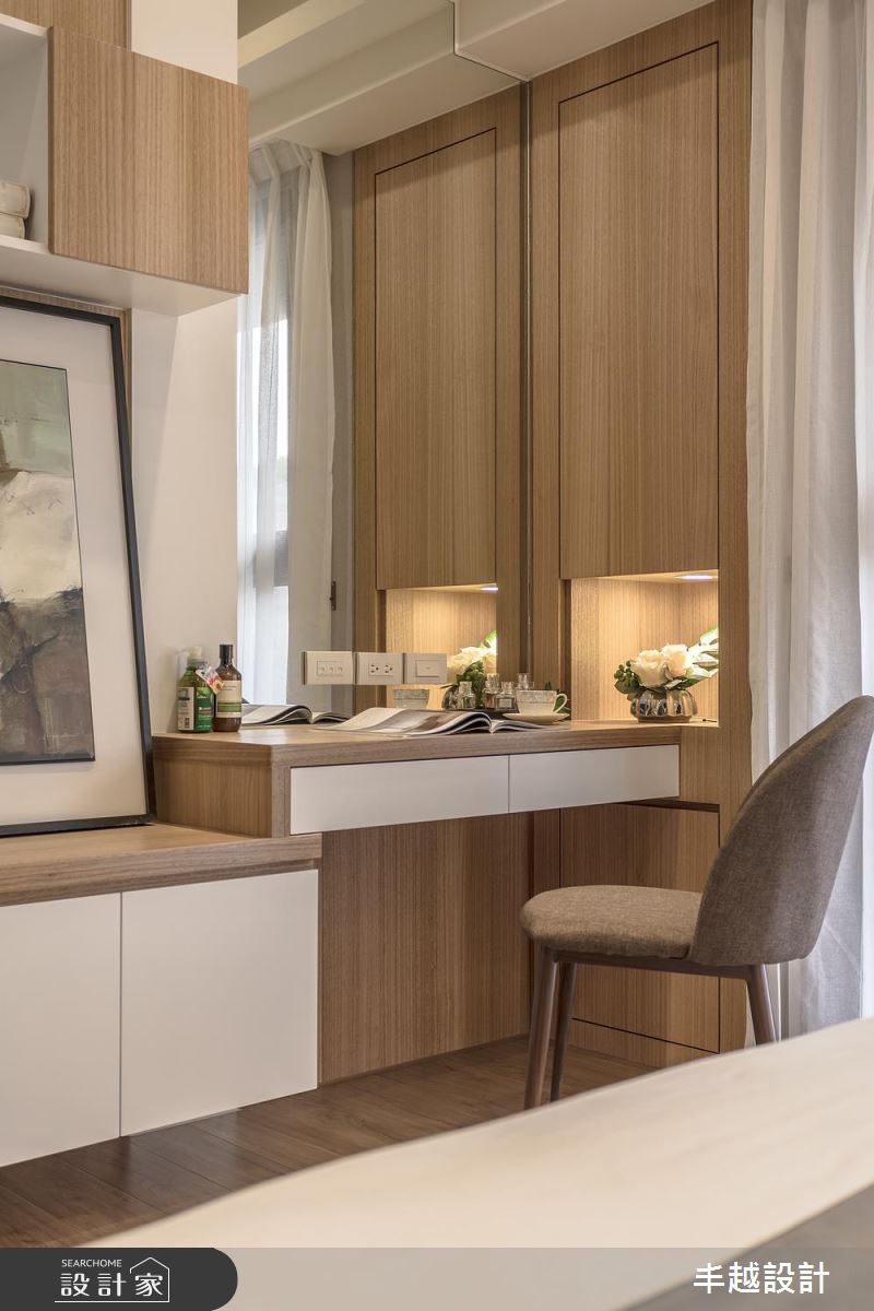設計師讓寢臥梳妝檯與櫃體相連,藉由量體的轉折延伸,形成一氣呵成的機能規劃,甚至連梳妝桌旁的牆面也加入了展示空間,在設計巧思中體現美型收納!