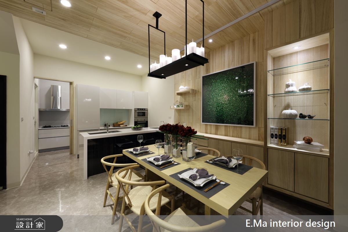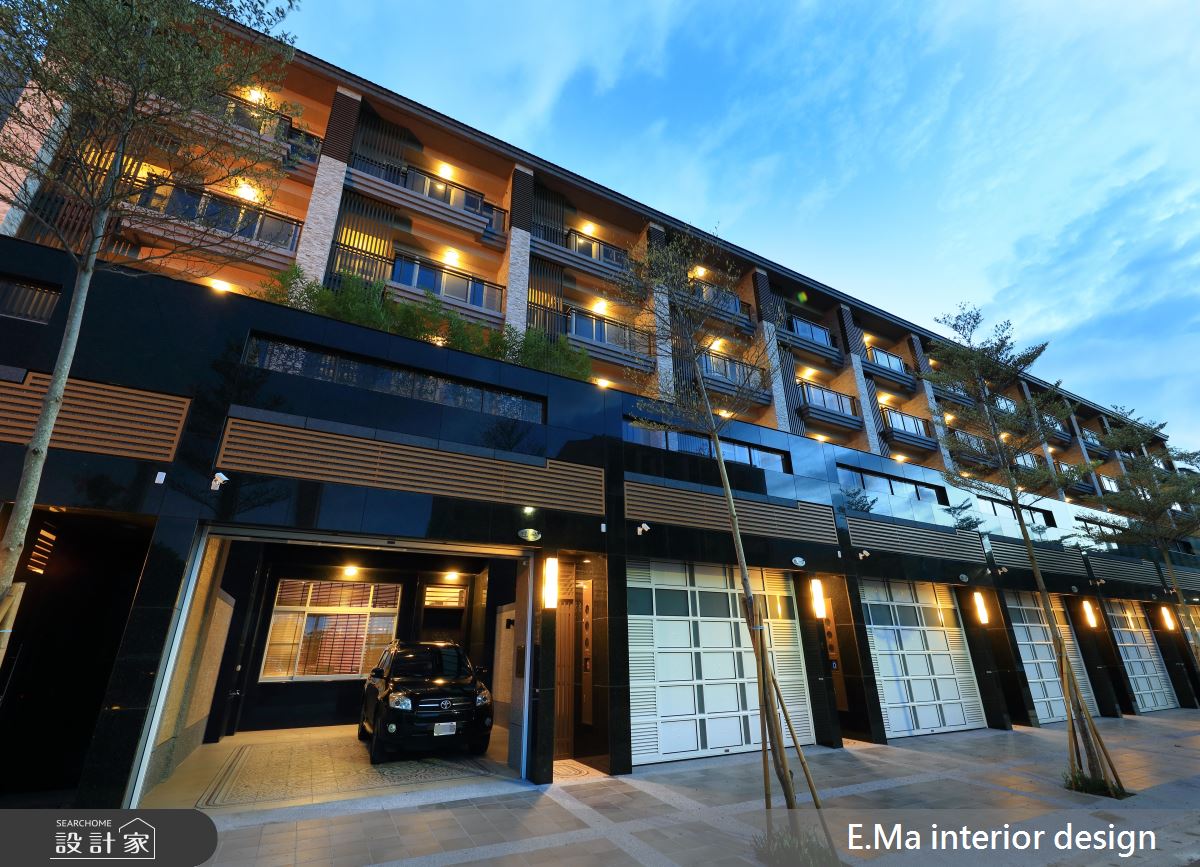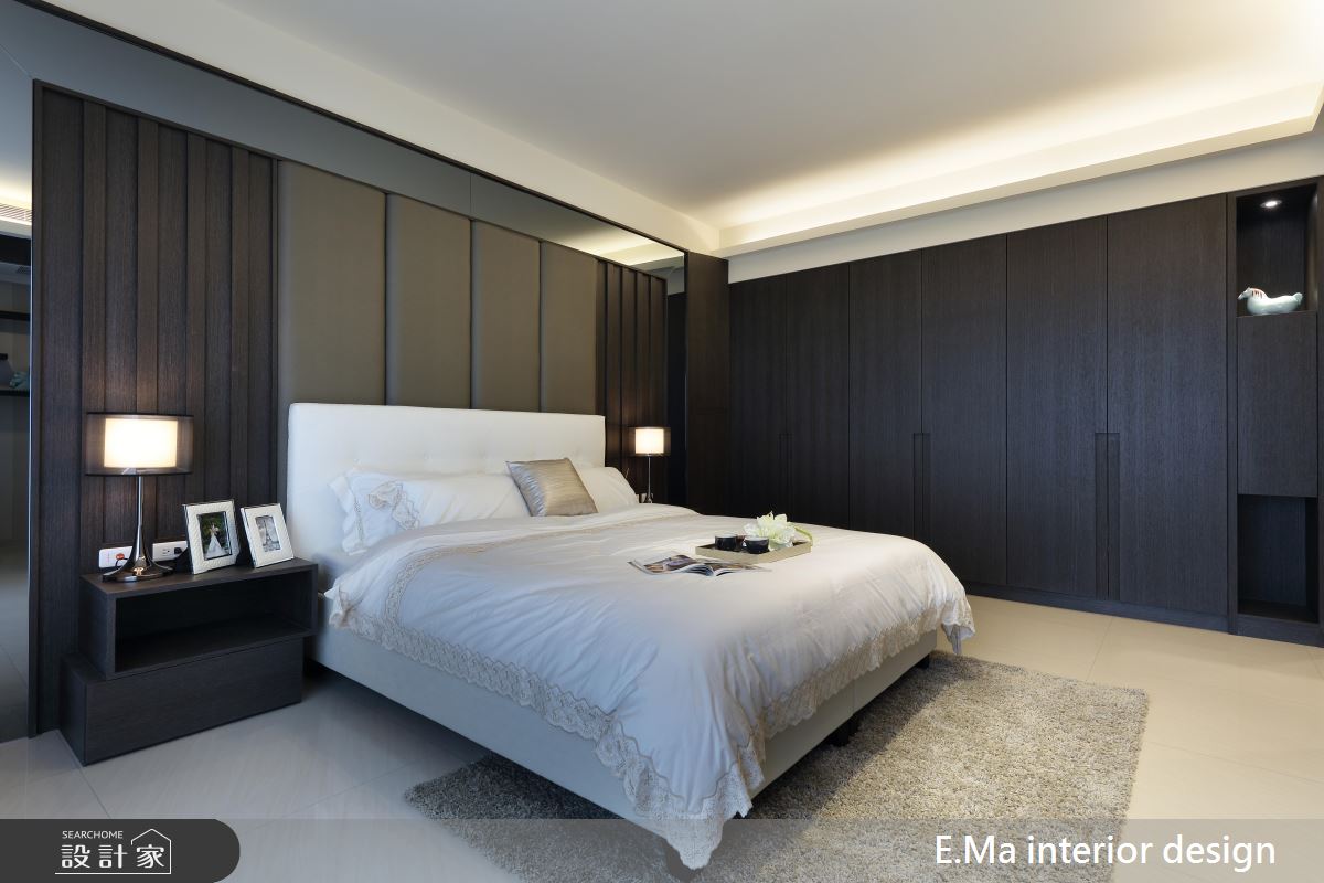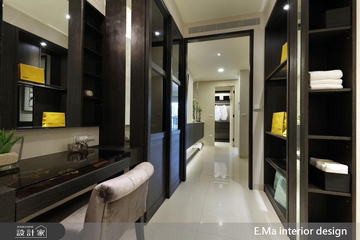 客廳以深色建材搭配白色調,以壁壘分明的用色,營造華麗且低調的美感,搭配寬敞明亮的格局分佈,展現屋主的泱泱氣度,且刻意在客廳一角規劃展示平檯,透過深色鏡面的鋪展,產生空間延伸的視覺印象;並打造一面深色玻璃拉門,作為客餐廳之間的界定,餐廳內則採以木紋柔化整體視覺,提升暖度,搭配局部鐵件的穿插運用,定調自然簡約的用餐氛圍;寢臥內以沉穩深色作為主軸,在床頭主牆加入理性優雅的繃皮,搭配深色木皮及細緻的鏡面框塑,在沉澱禪韻之中,亦帶出時尚都會的人文風情!