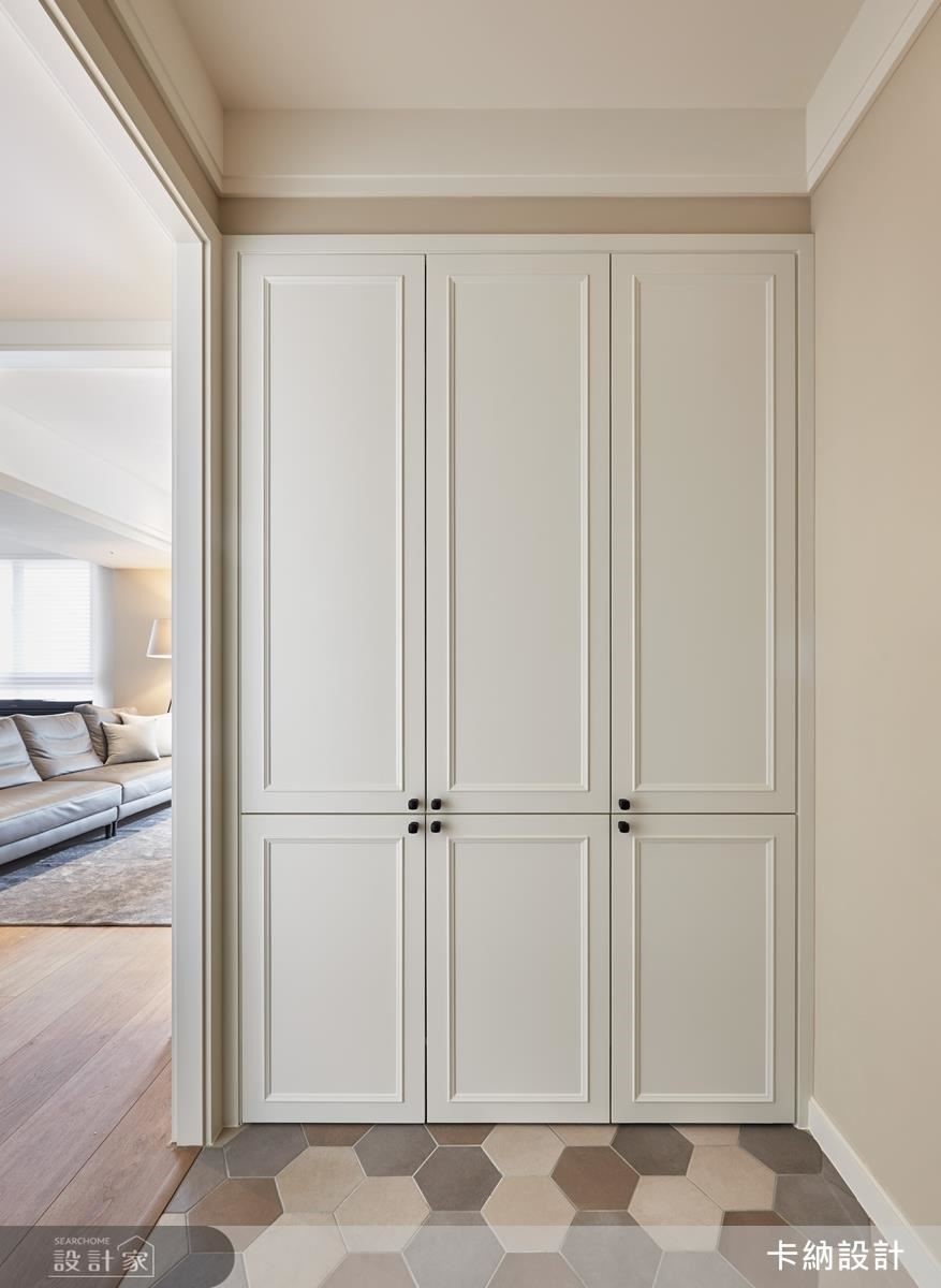 藉由六角磚鋪陳地坪,創造出門口處的落塵區,讓到家的人們能暫時轉換心情;穿越白色的門框,踢腳板的美式元素延伸入室,視覺頓時開闊;左側四道以白色線板裝飾的門扇,為衣帽櫃與儲物的收納空間,滿足日常實用需求,且銜接起後方的餐櫃設計。