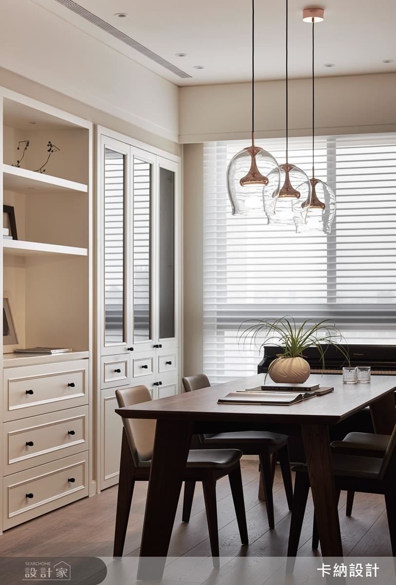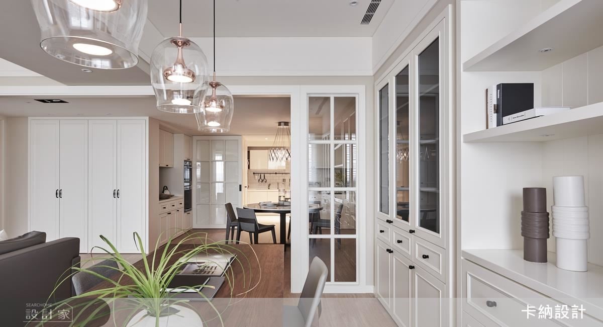 考量充沛的自然光能夠引入室內,特別是內部的餐廳區,因而打掉書房靠近廊道處的實體牆,換上格紋造型的玻璃門,讓書房、餐廳與廊道的領域界定出來,形成流暢的行走動線,且型塑開放的空間格局,讓光線能夠走進空間的每一處;在後方整面書牆設計裡,靠窗處特別以折門為設計,可收放書桌與電腦桌機,滿足實用需求。
