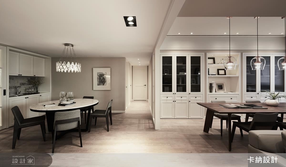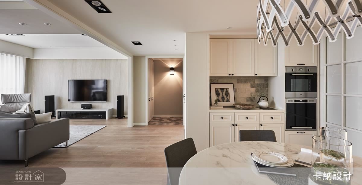 在靠近廊道處特別擺設一張圓型餐桌,呼應東方家庭的饗食文化,而向內角靠攏的位子擺設,不僅讓出更多廊道動線,領域間的移動也更為流暢;內側打造美式風格的上下櫃,中央為流理檯設計,壁面則貼覆素雅的美式磚,呼應整體風格與配色;靠近儲物間的壁面則安排電陶爐等電器配備,打造溫暖與生活感兼具的美式家屋。