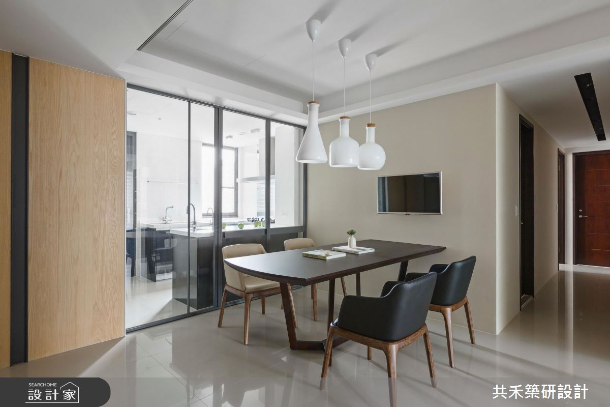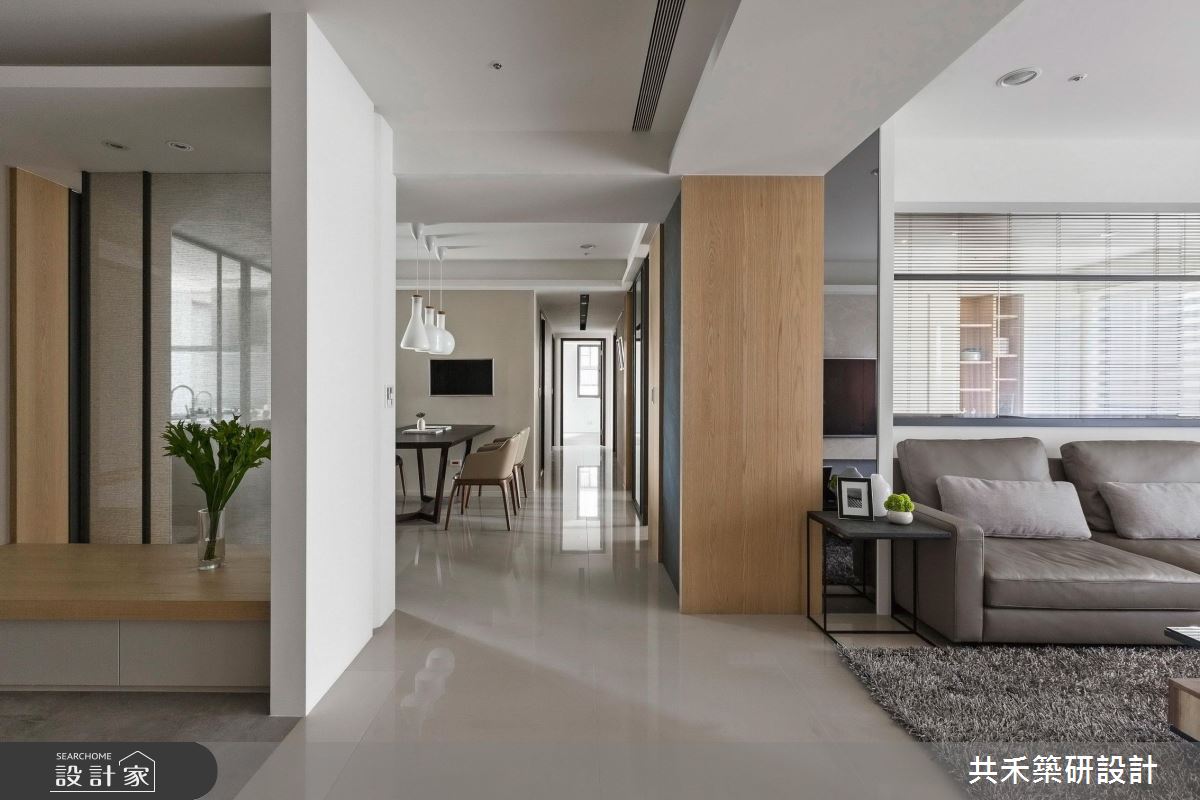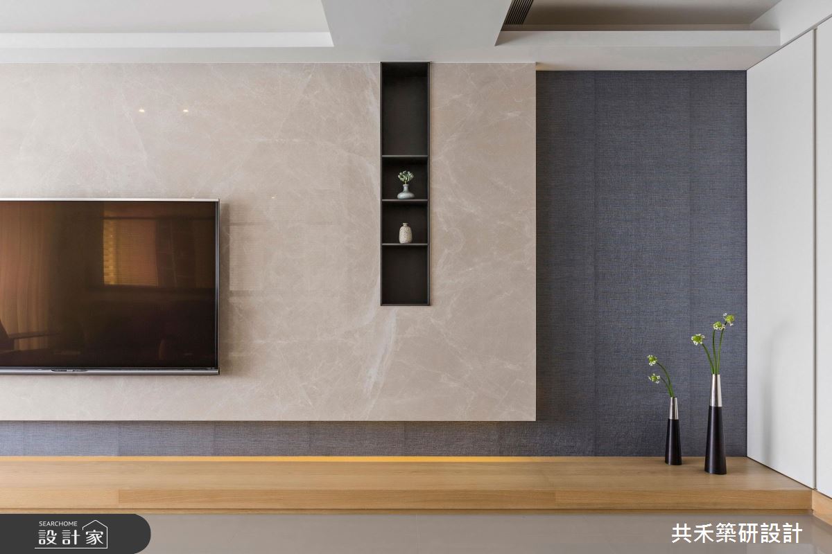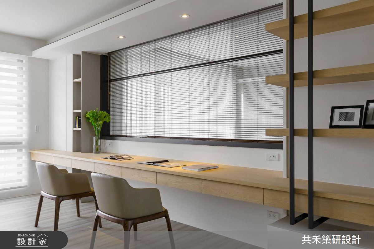 旋開大門,迎向開闊的玄關領域,輕漾著奶油色調的收納櫃體,搭配淡雅木紋的平台,伴隨綠意植栽的點綴,調和出清爽、有溫度的居家氛圍;大理石鋪陳整體公領域地坪,戶外暖陽穿透網紗窗簾,篩落滿室唯美光暈,替現代風格調出家的暖心基調;丹寧色調的壁面,疊上米色系的大理石牆,展現漸層、充滿張力的電視牆,由右側以黑色層板框構出開放展示區,植入人文設計的巧思;以中央大樑為界,劃分出客廳、書房與餐廚領域,沙發後方透過玻璃隔間,創造閱讀區;餐廚空間也以玻璃推門界定,穿透的視覺特性讓室內更顯開闊,形塑流動感氣息;書房空間裡,藉由落地窗引入充沛光源,木作層板與鐵件交織出展示區,後方壁面則打造整面書牆,虛實相間的櫃體設計,創造出豐富的空間表情。